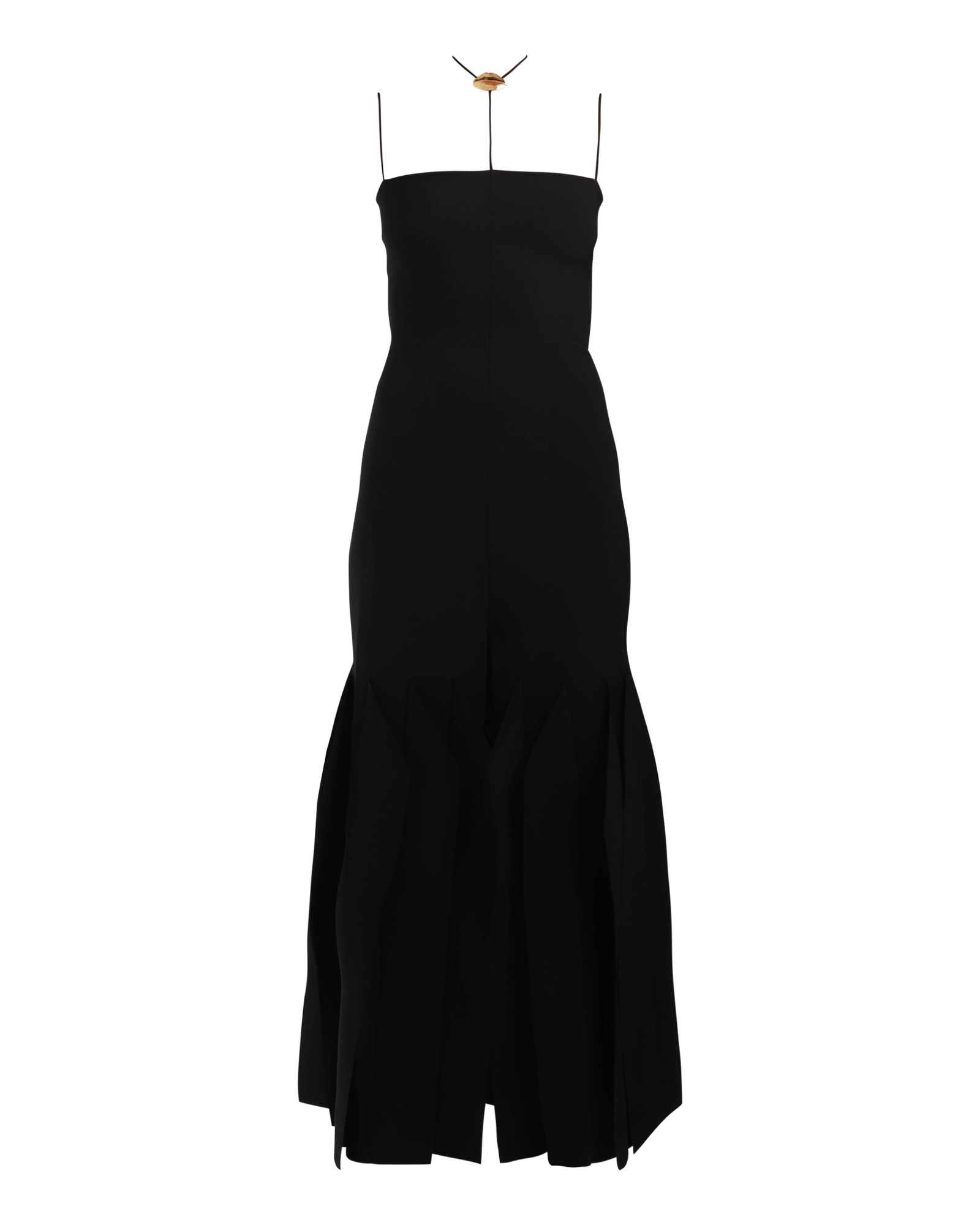 A fitted silhouette dress, featuring thin straps, a lipstick gold toned detail at neckline attached to a thin adjustable strap. This beautiful piece offers volume with these asymmetrical panels at hem, elevated by a slit at front and back. Made in Italy.
