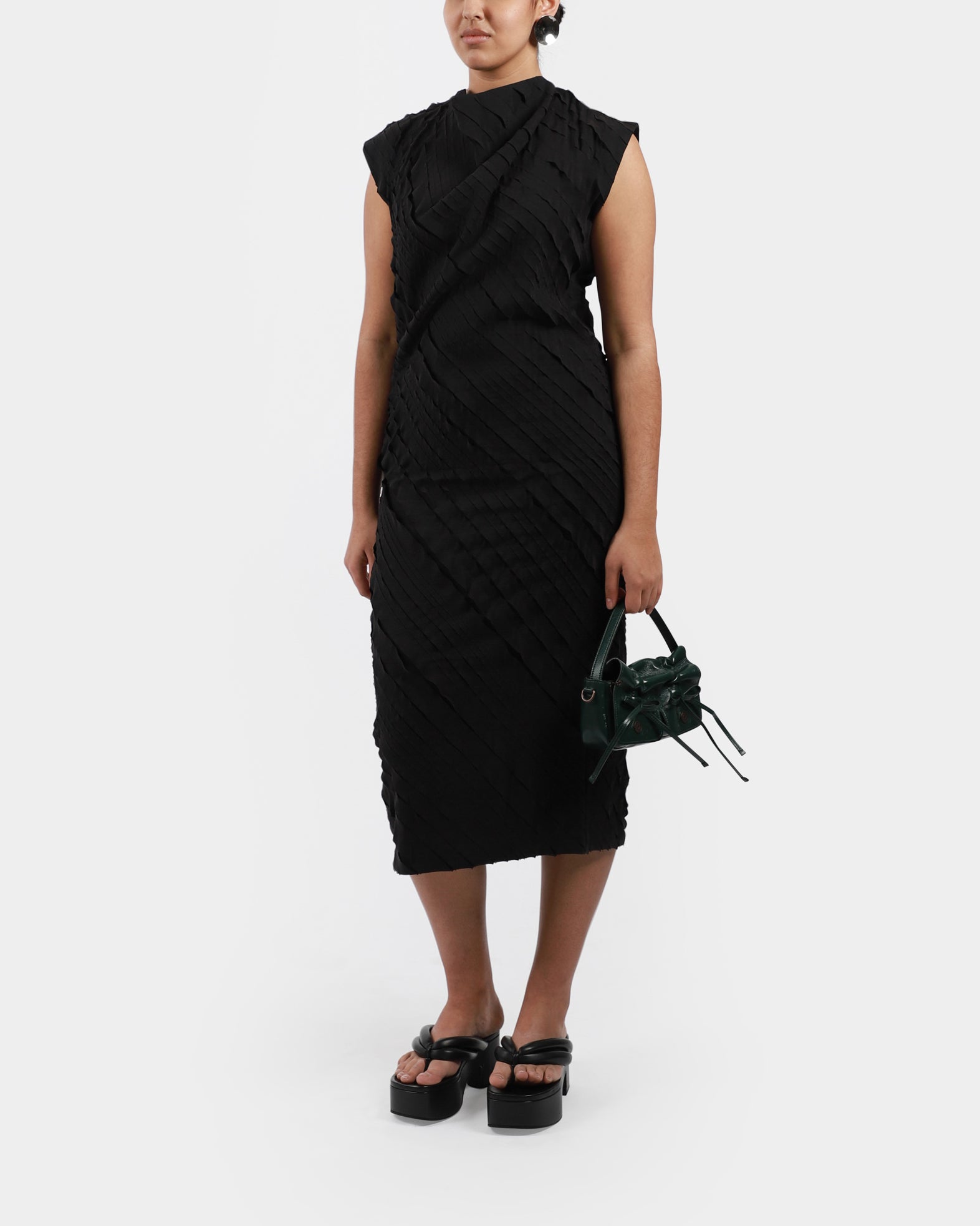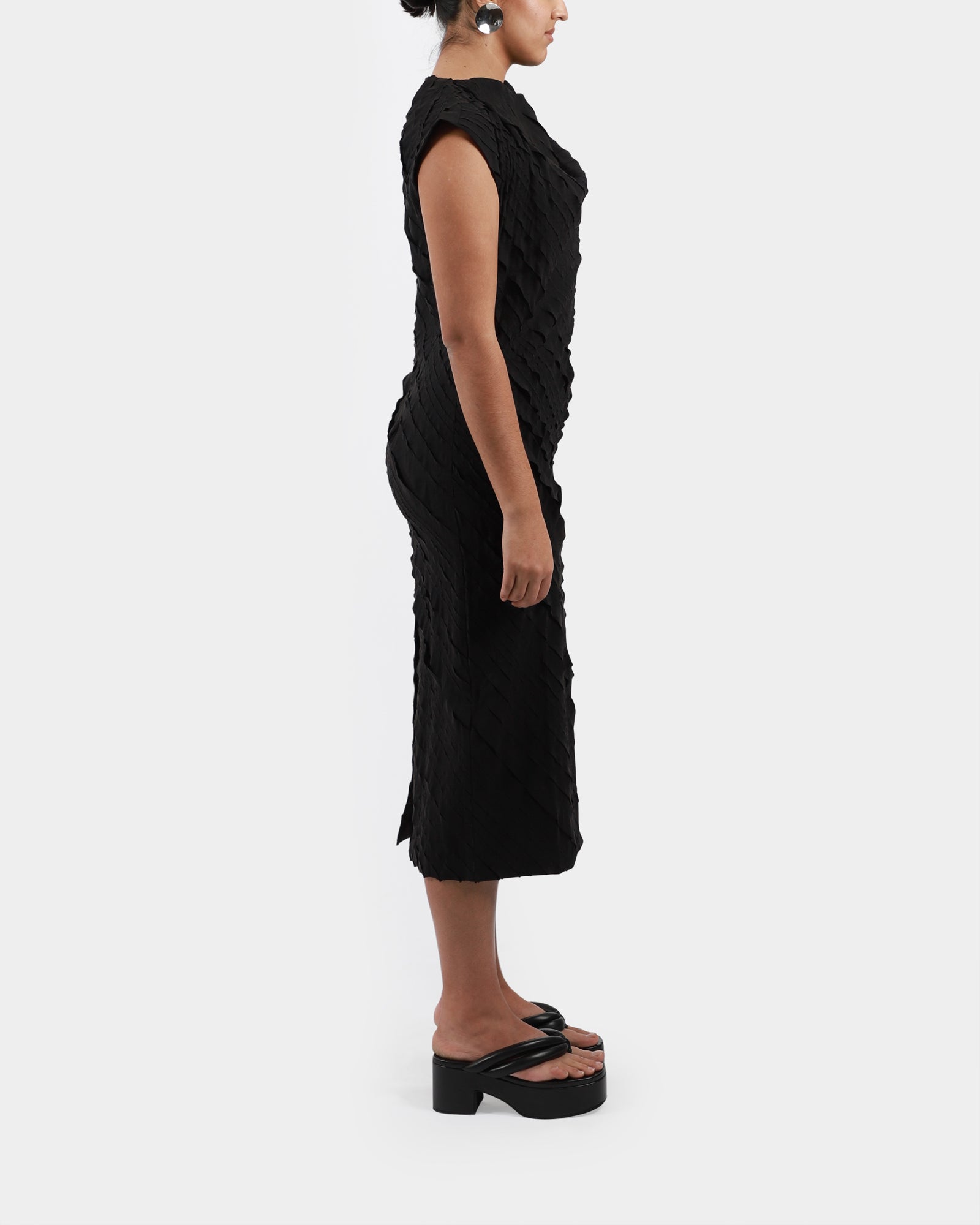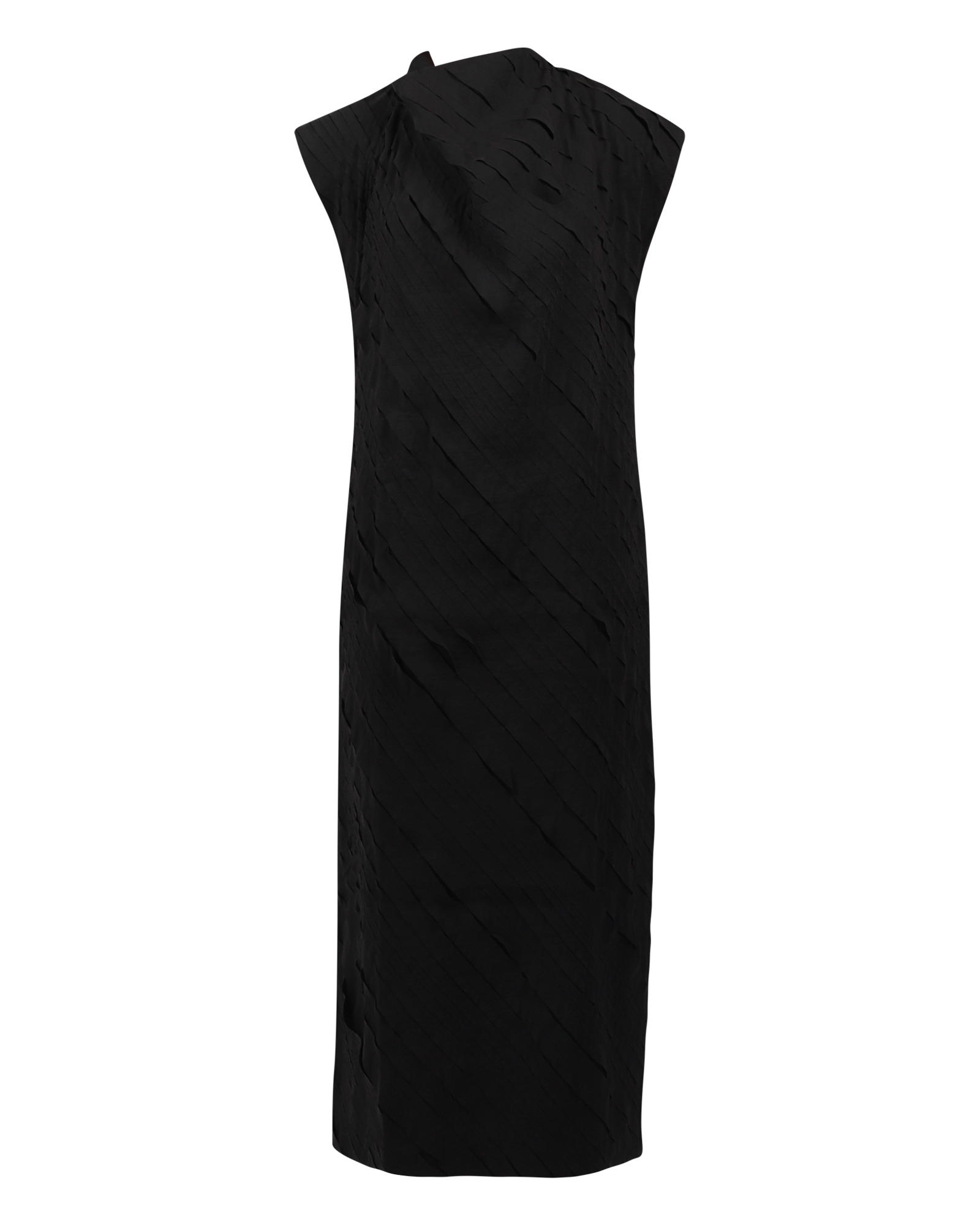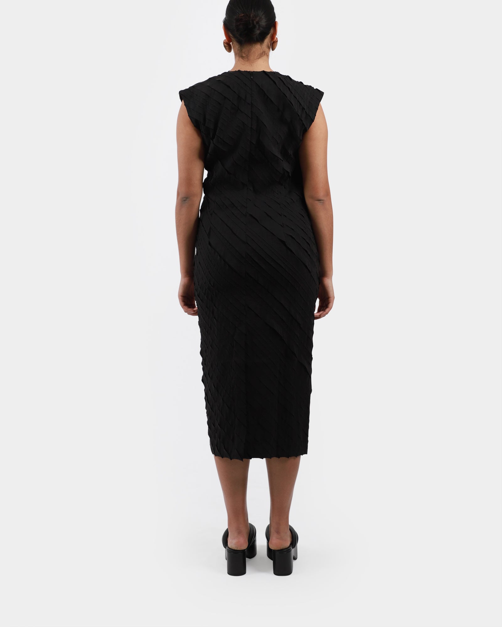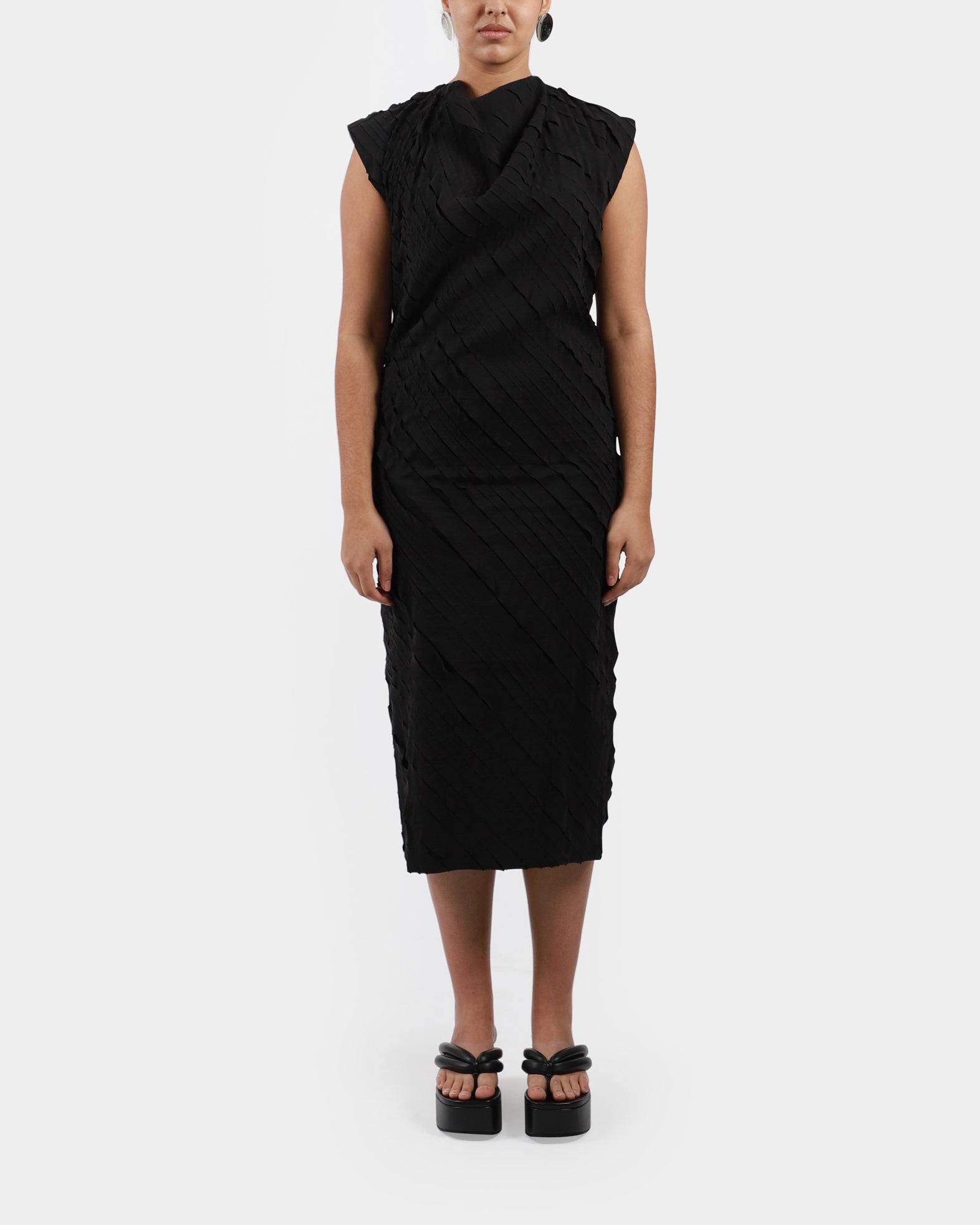 This sleeveless dress features sculptural double face fabric with hand cut diagonal slices, a draped neckline, and back vent. Below the knee length with a clean, architectural silhouette.