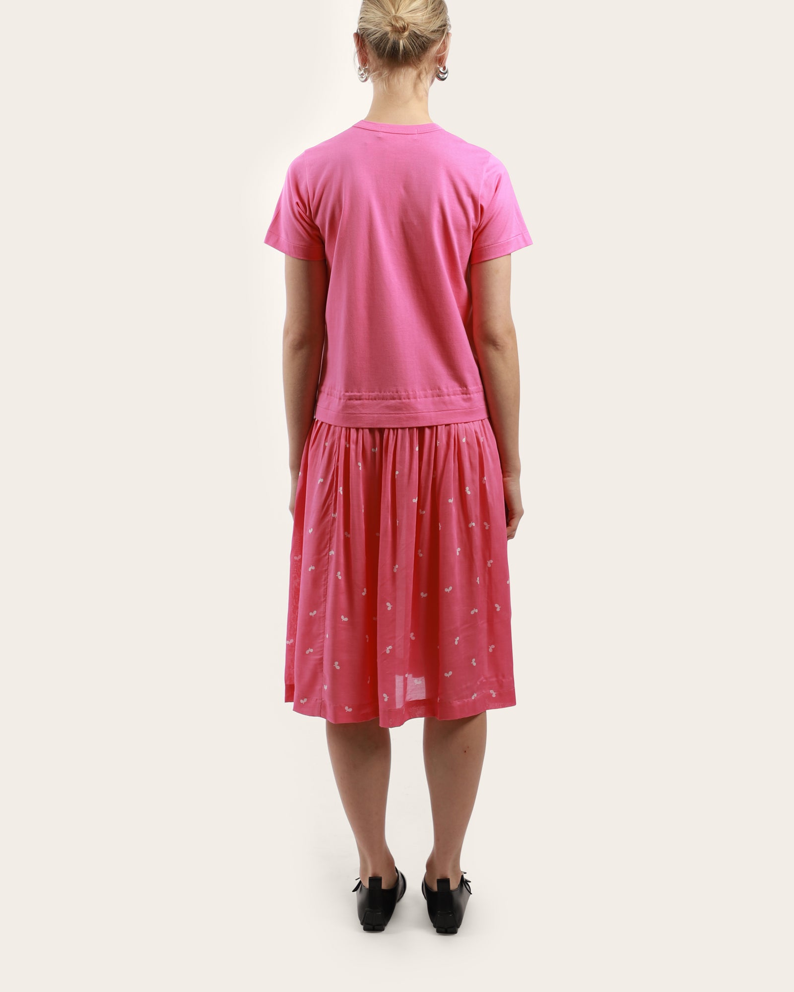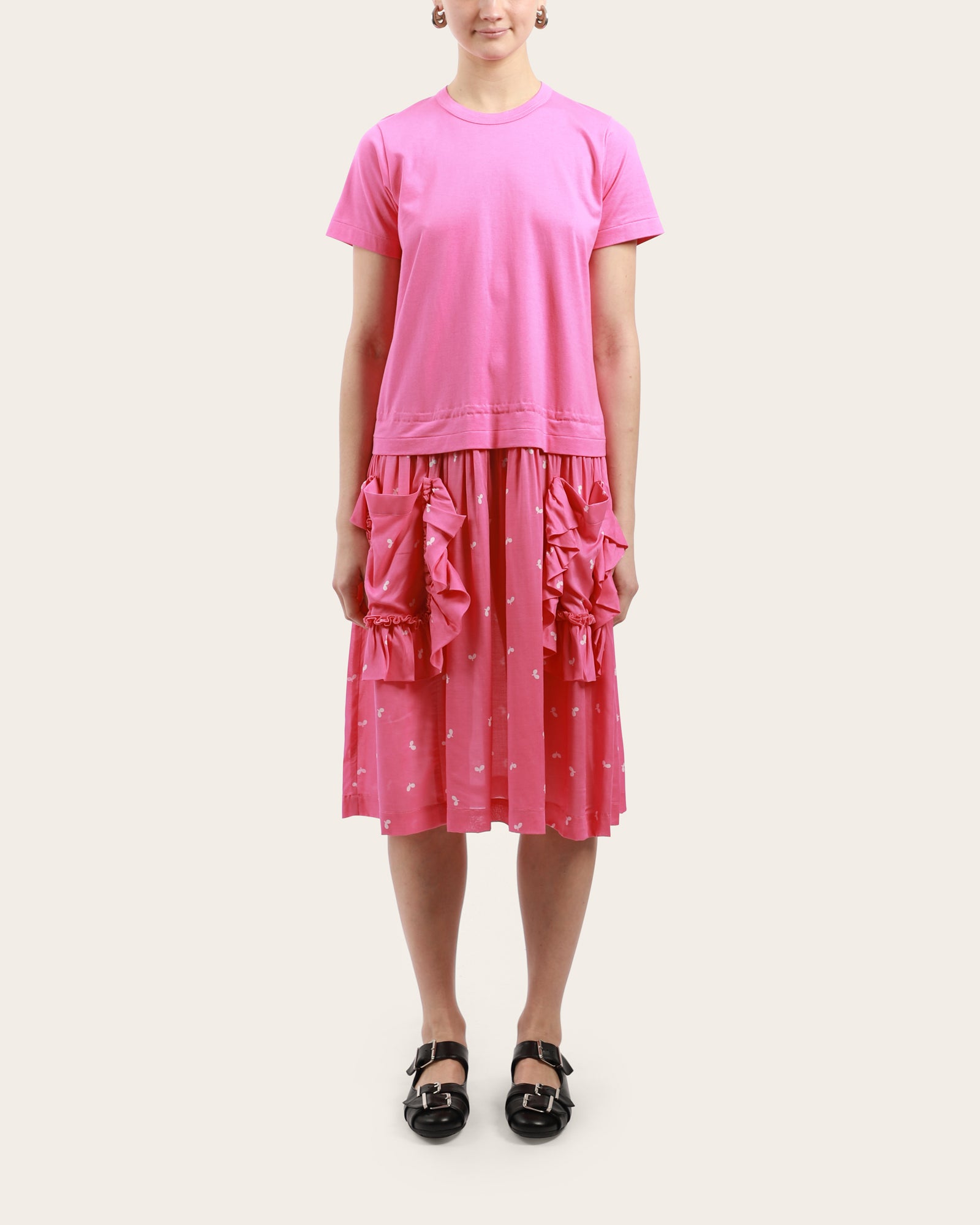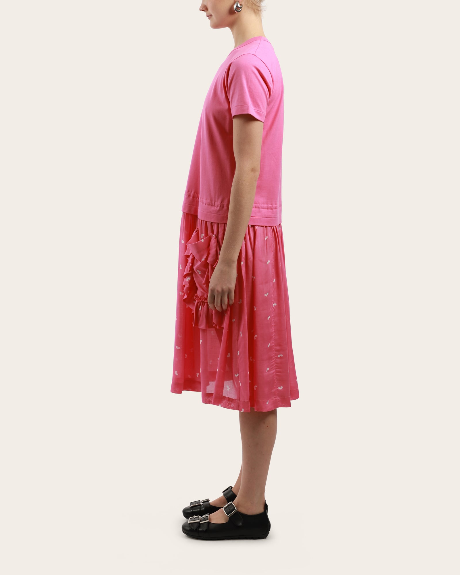 A t-shirt dress, featuring a round neckline, short sleeves, large ruffled pockets on the skirt, below the knee length. This dress has a regular fit and offers a relaxed silhouette. Made in Japan.