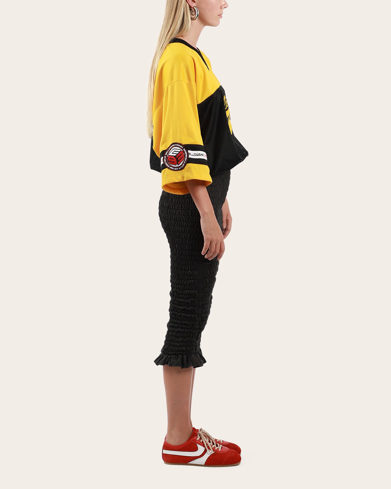• A modern take on effortless style, this smocked midi dress features a flattering body-hugging fit with all-over ruching that contours the figure. The stretch fabric moves comfortably with you, while the subtle ruffled hem adds a feminine touch. The relaxed jersey top, ads contrast to the garment, featuring a v-neckline, and short sleeves dropping on shoulders. Perfect for dressing up or down — pair it with sneakers for a casual daytime look or heels for an elevated evening vibe.