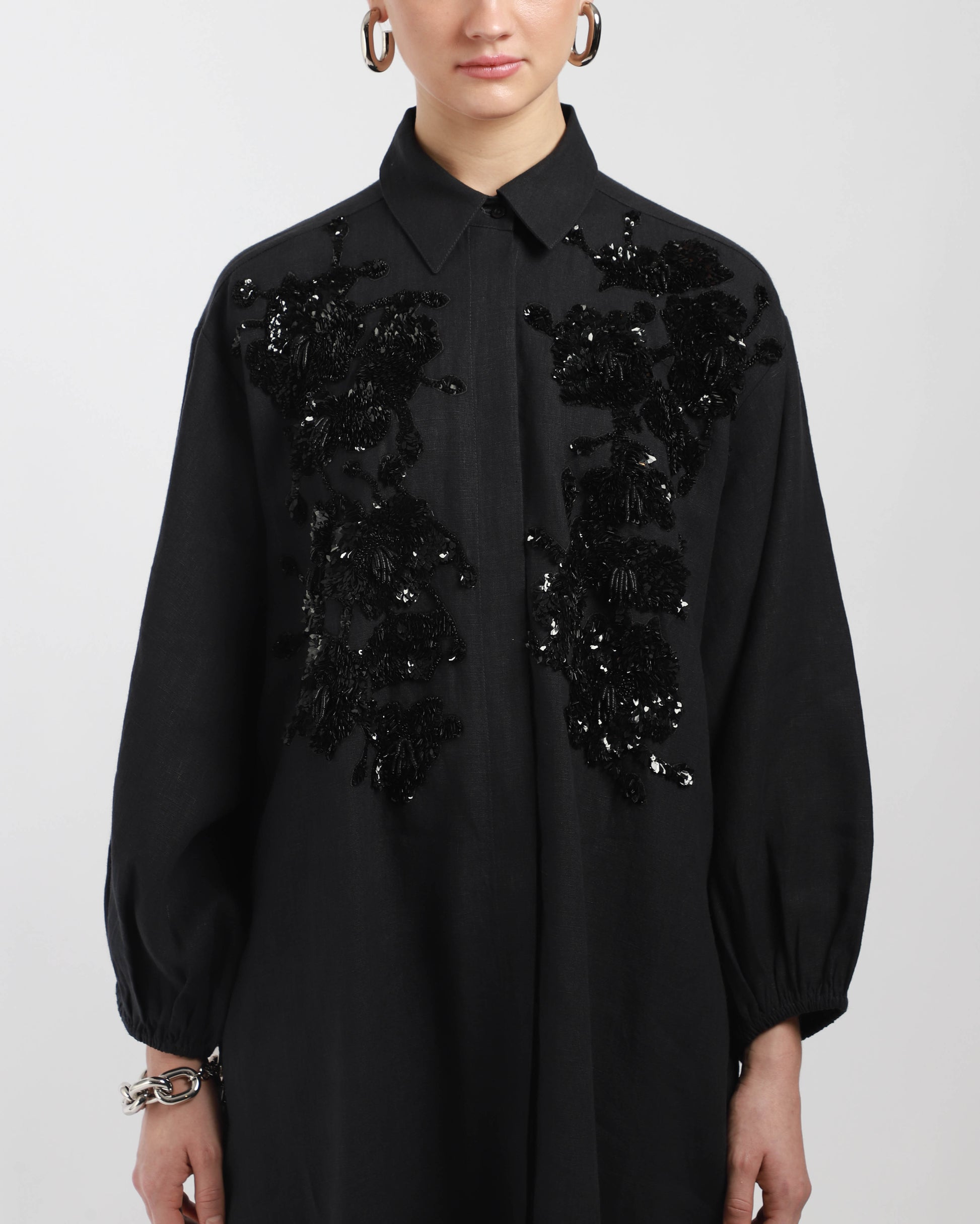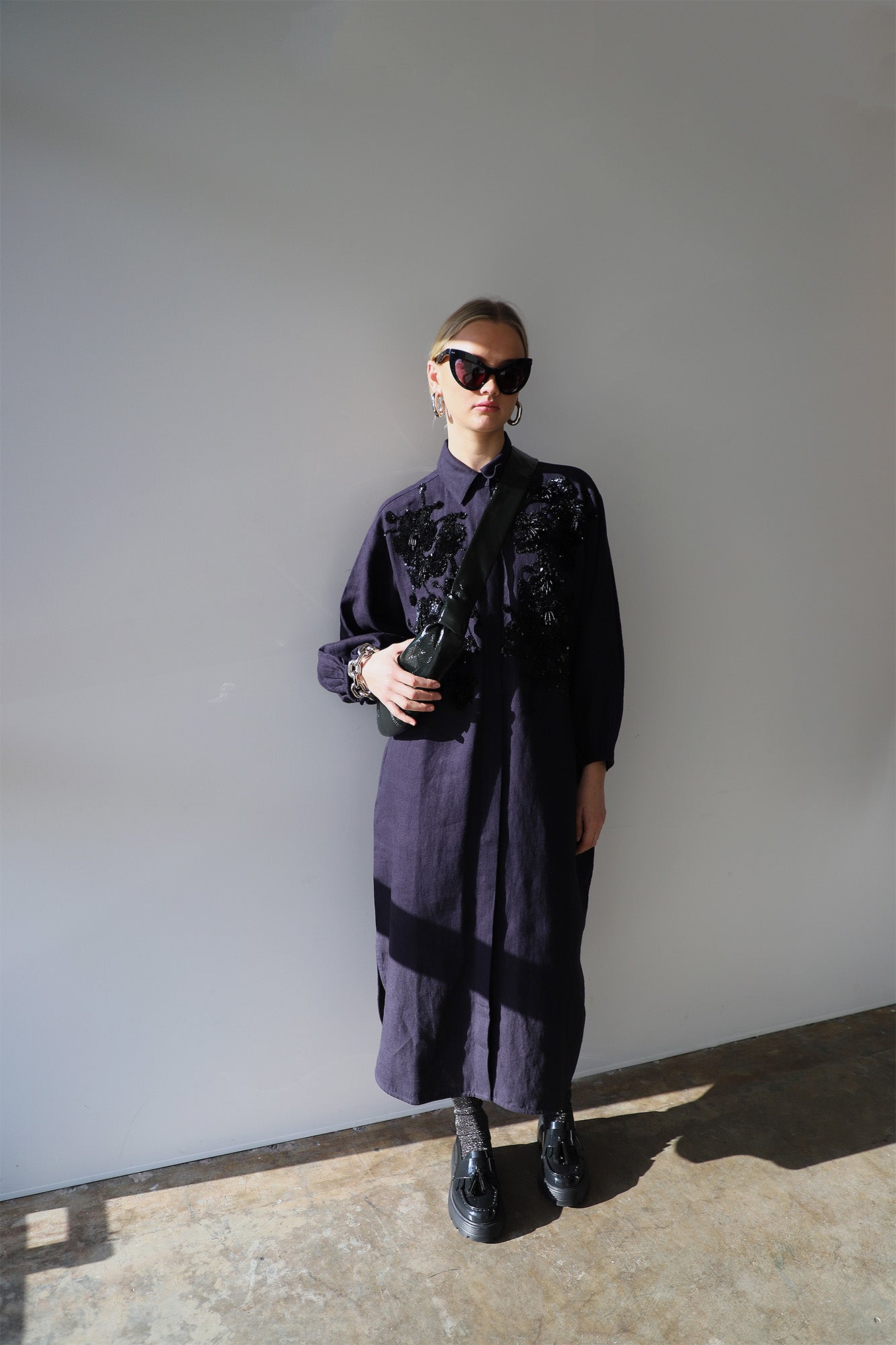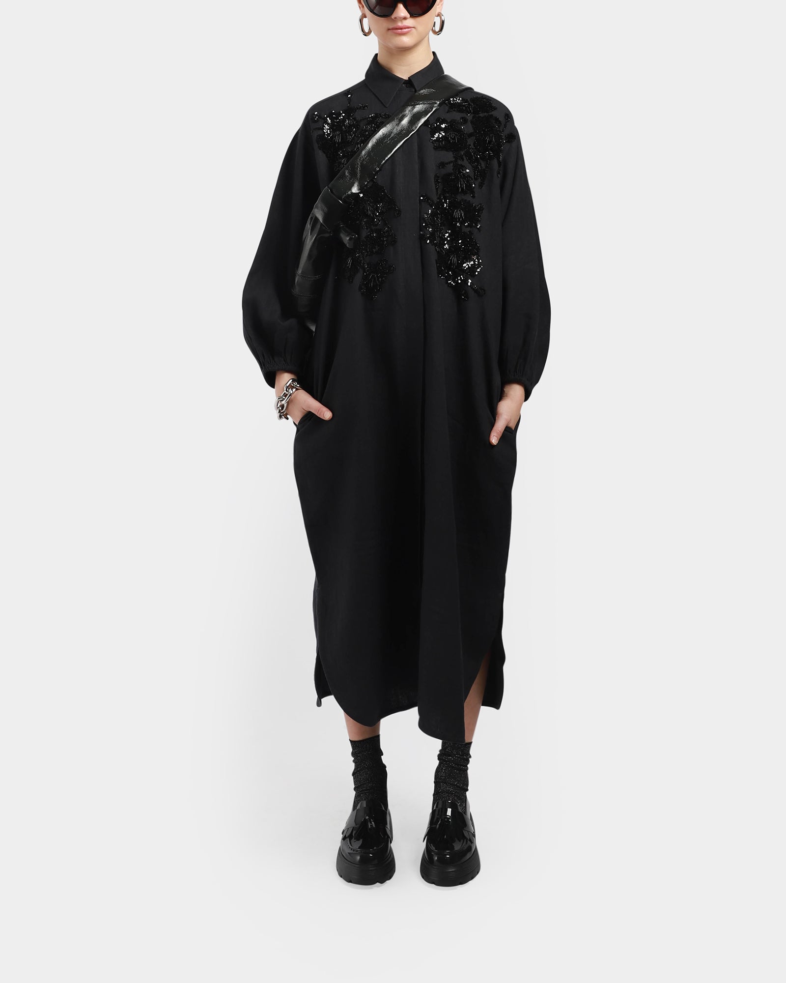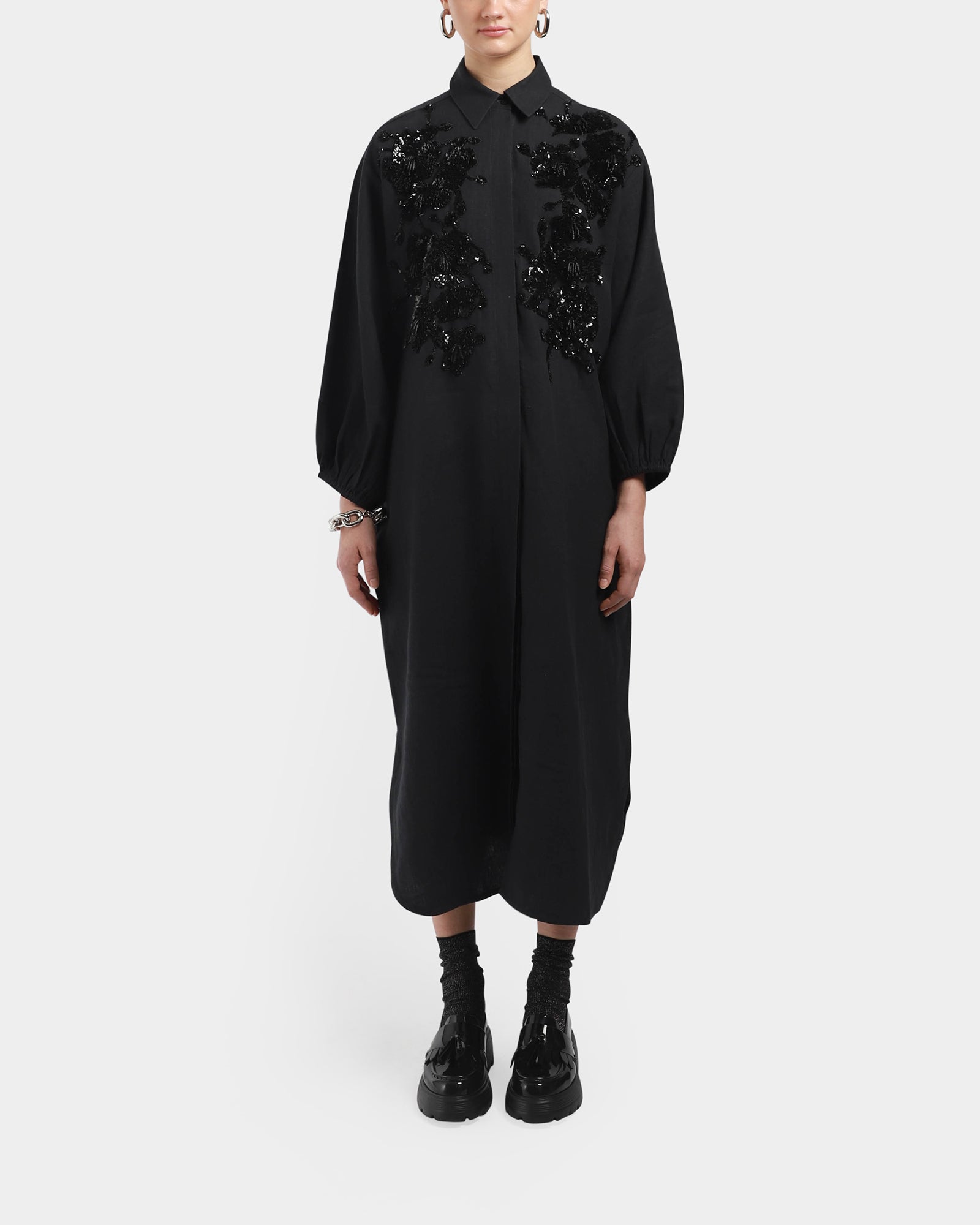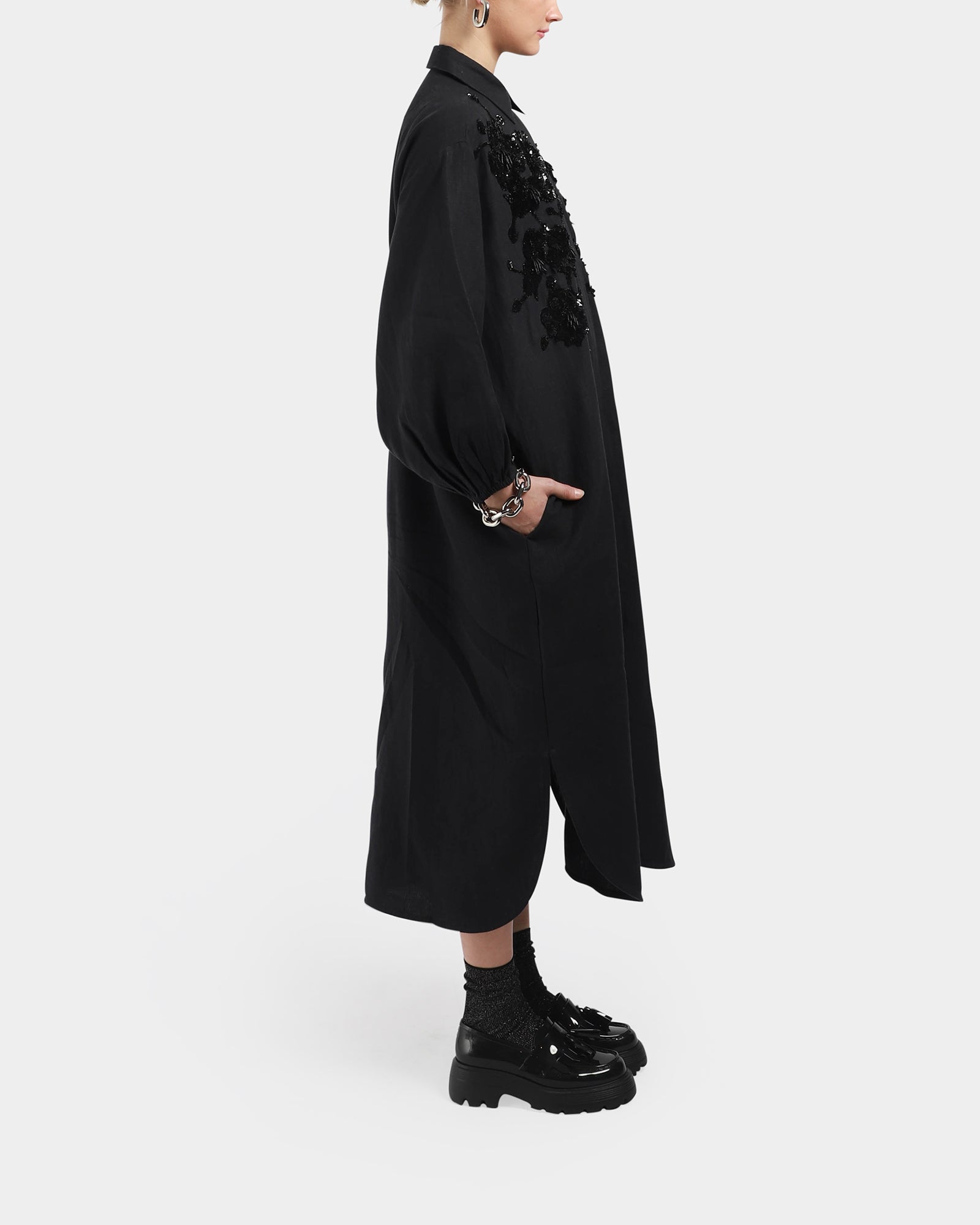 This shirt dress made from soft linen and cotton, features a classic collar, hidden buttons all the way down, 3/4 sleeve length with elasticated cuffs, side pockets, embroidered beads at front and an oversized silhouette.
