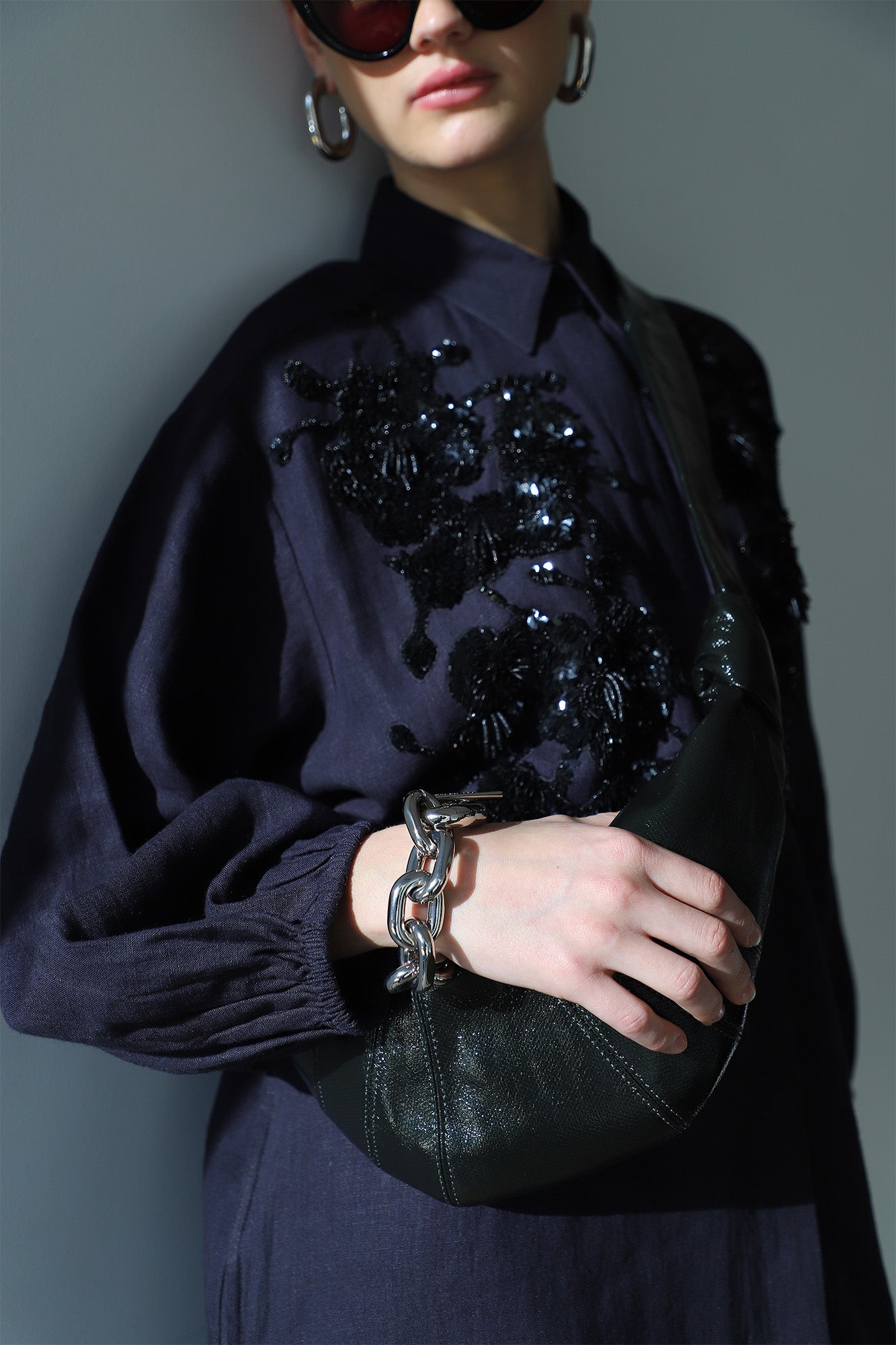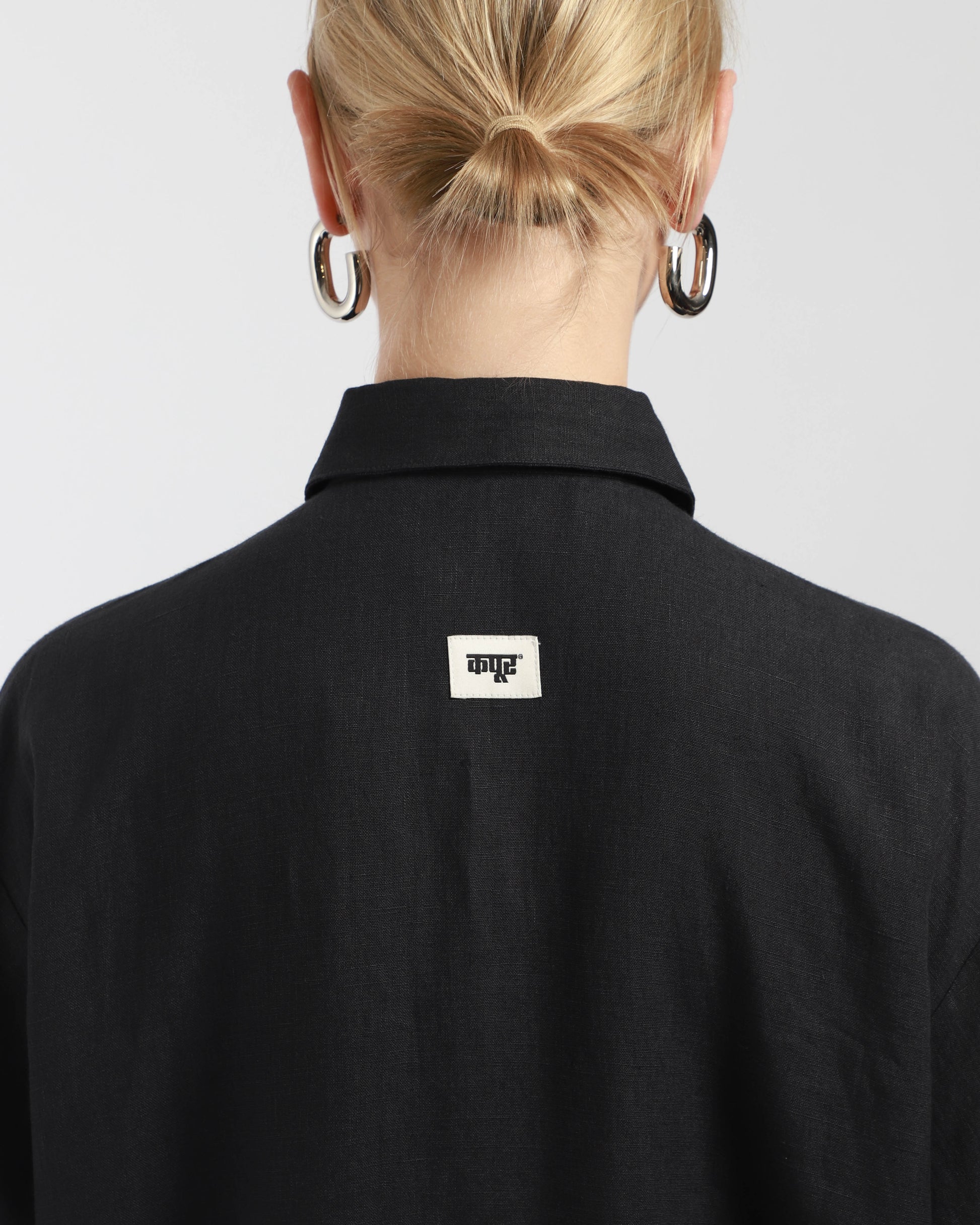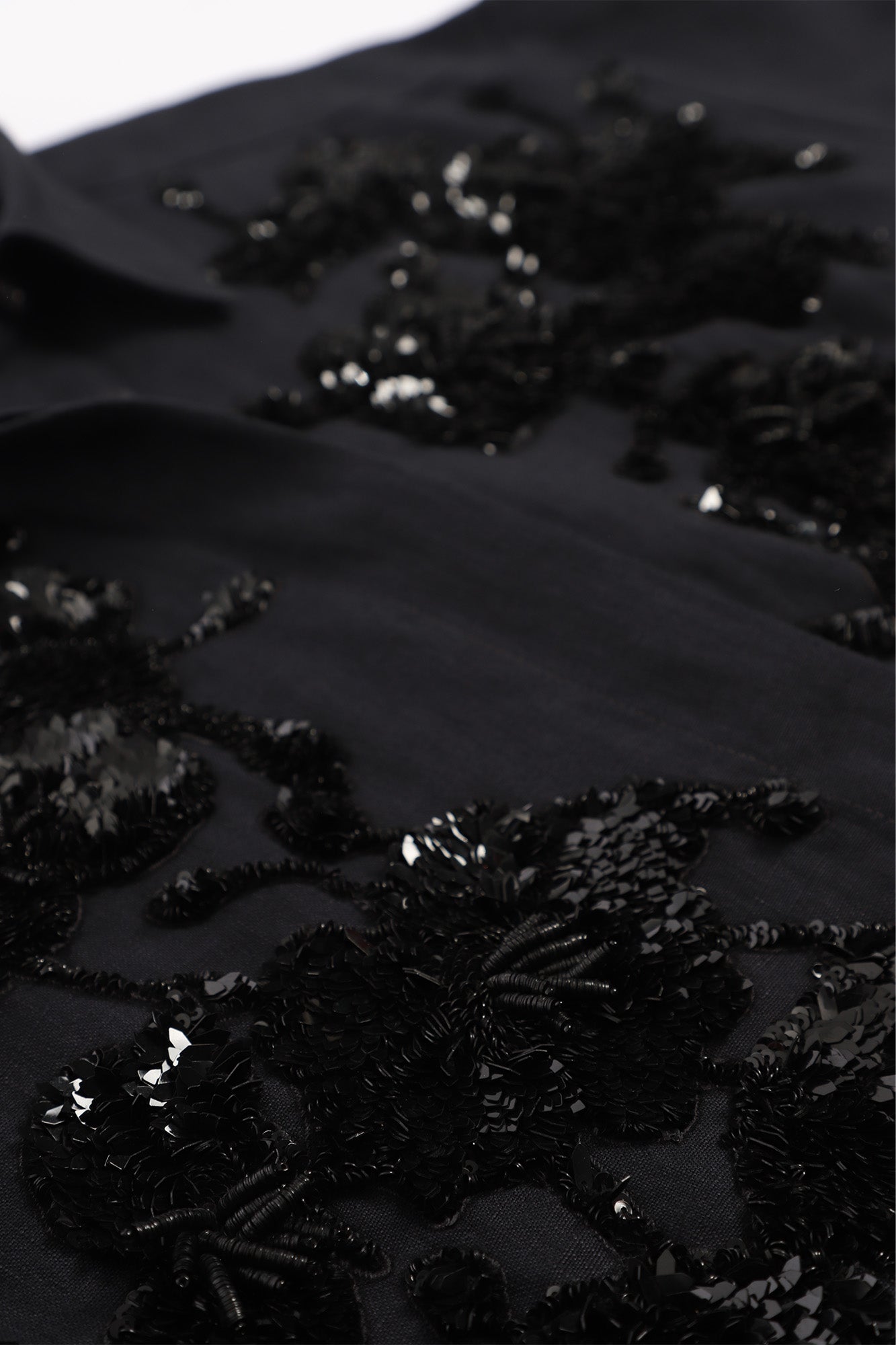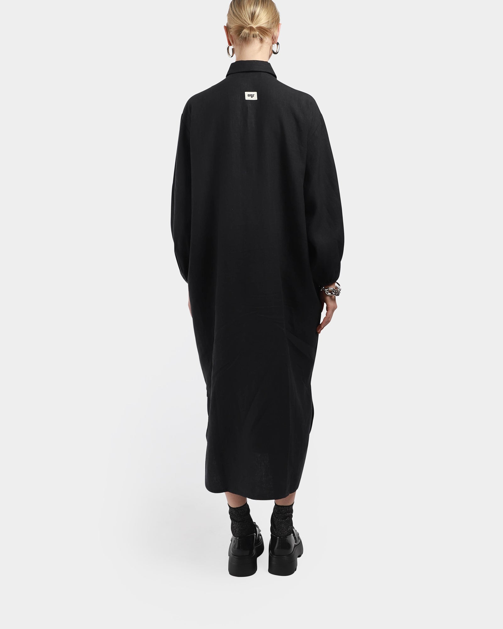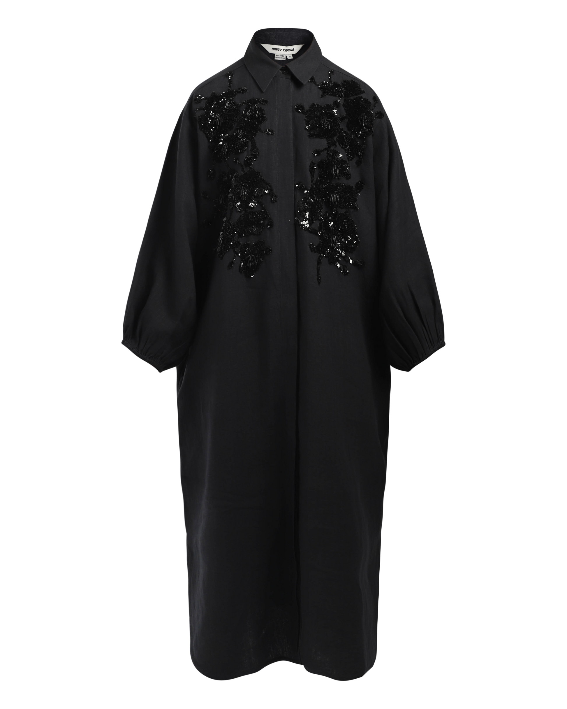 This shirt dress made from soft linen and cotton, features a classic collar, hidden buttons all the way down, 3/4 sleeve length with elasticated cuffs, side pockets, embroidered beads at front and an oversized silhouette.