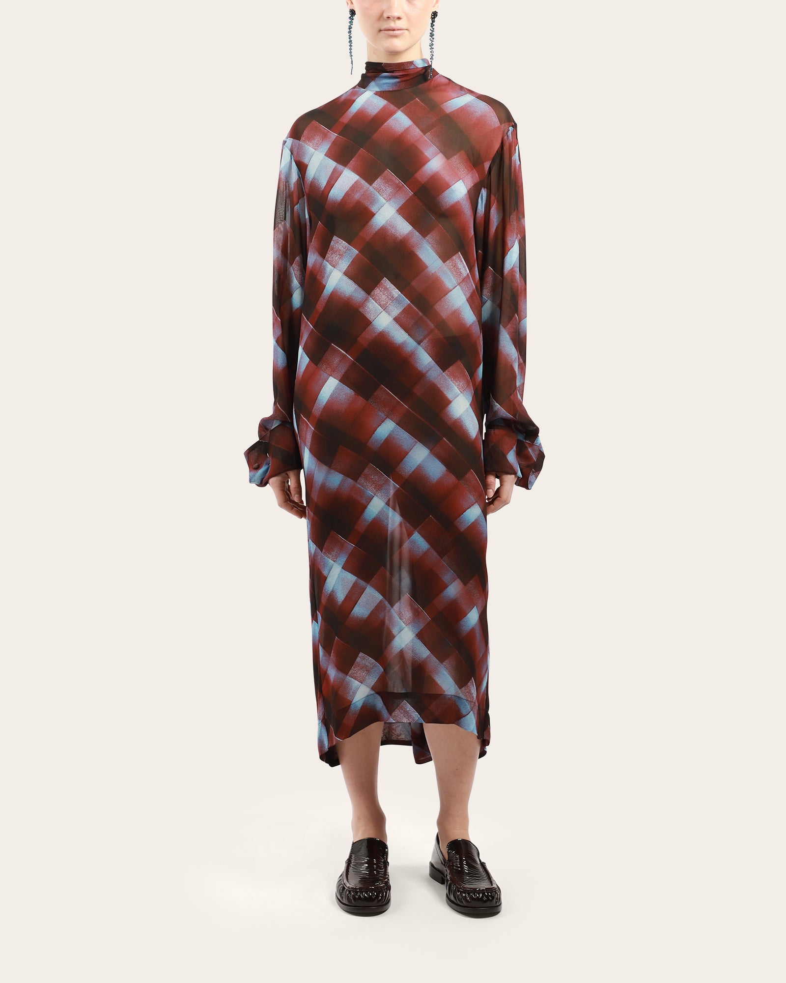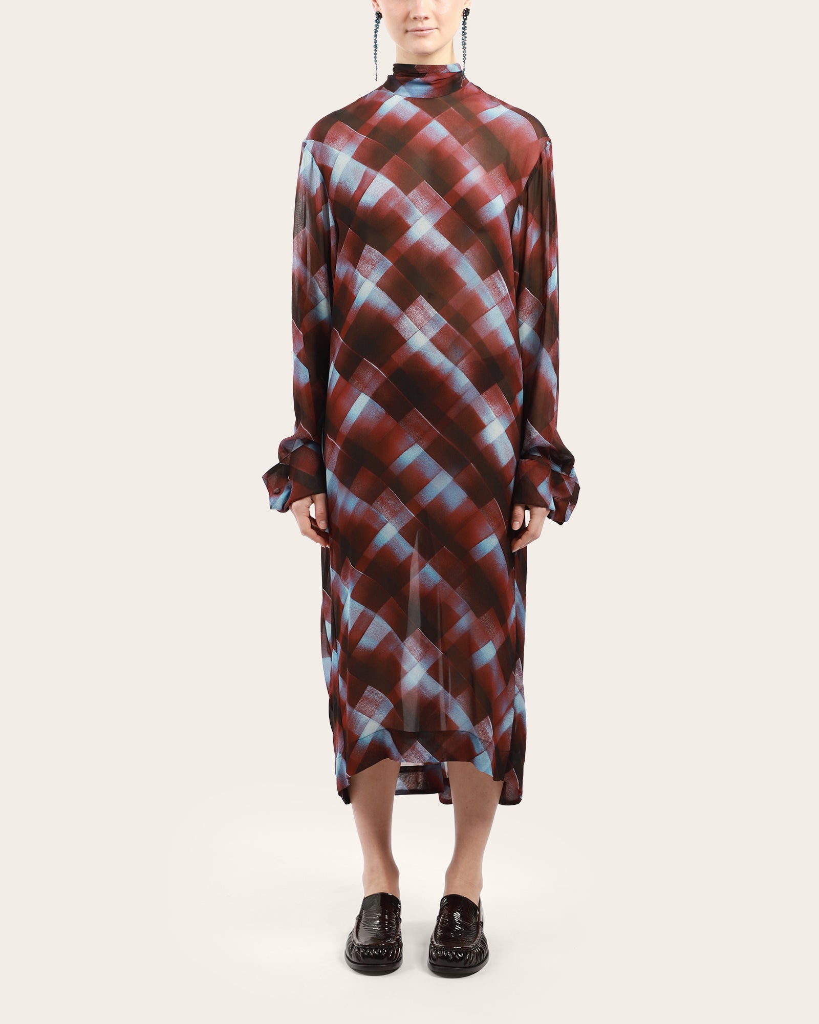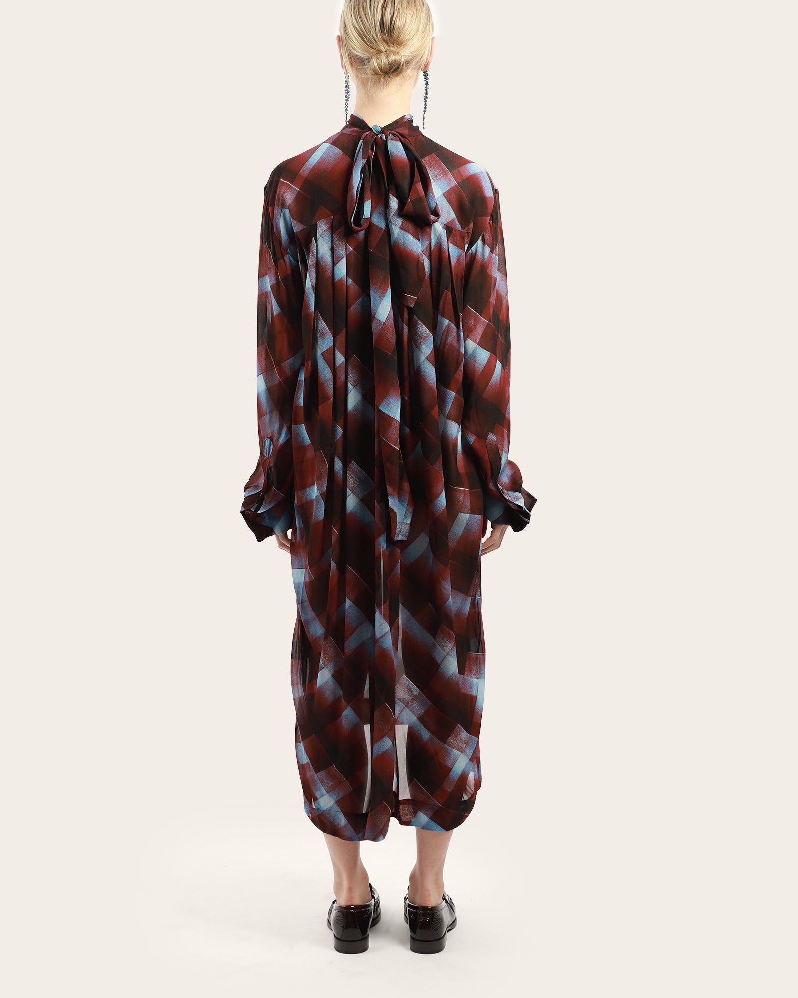 The Doddy dress, feature a tie fastening high neck, long balloon sleeves with buttons at cuffs, long back hem, midi length, regular fit.