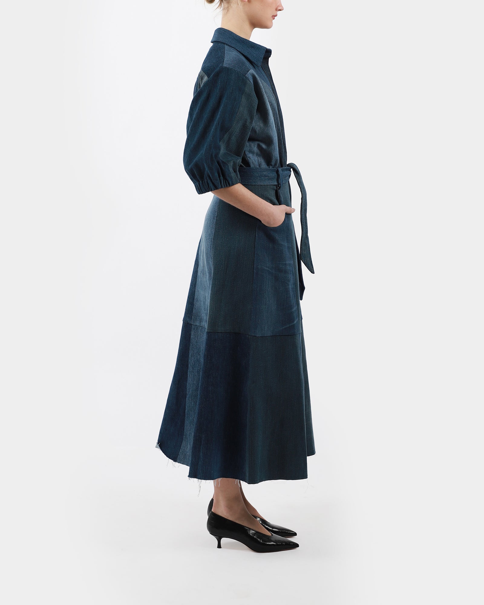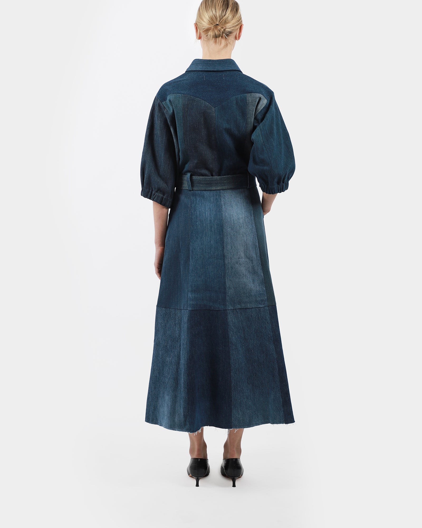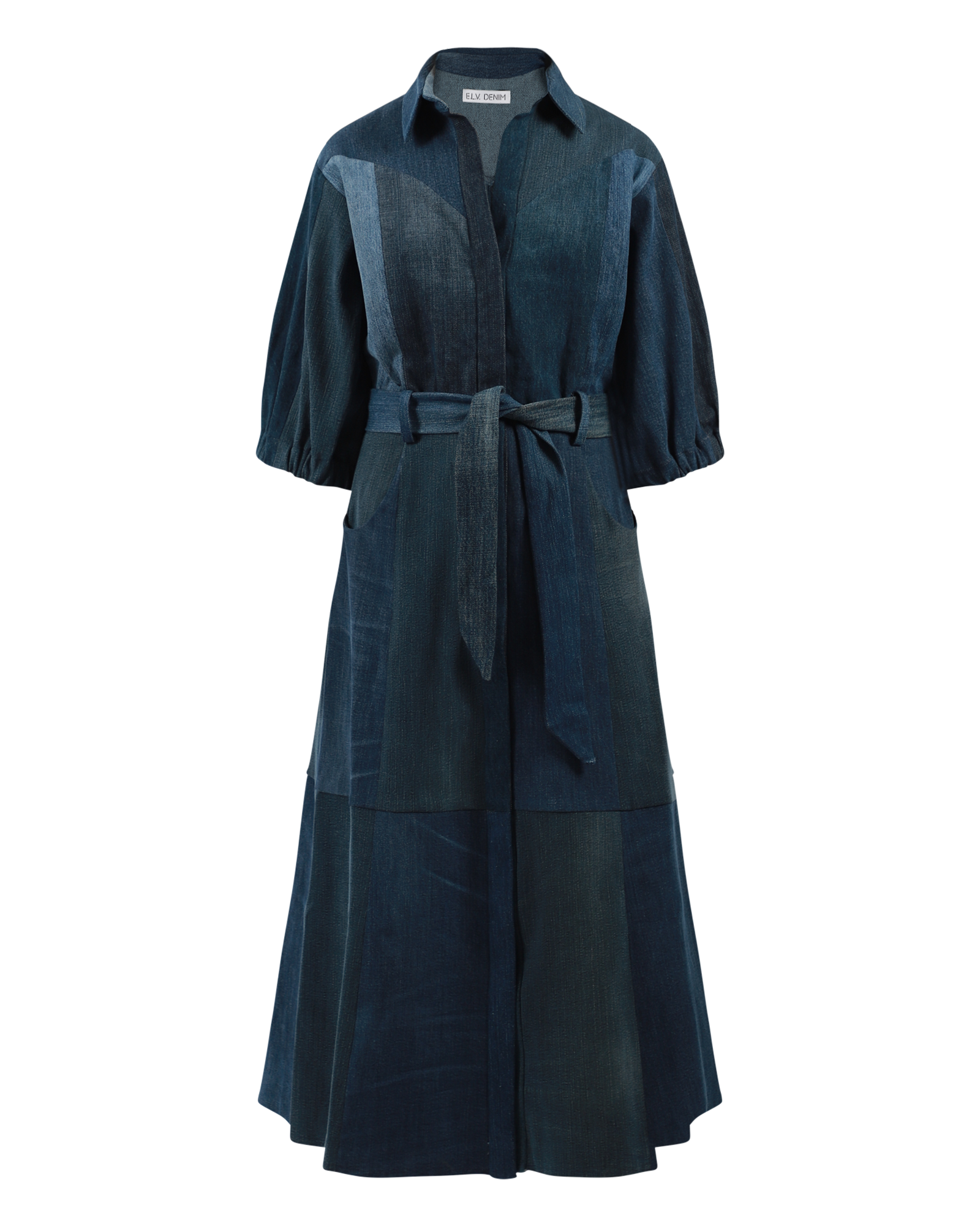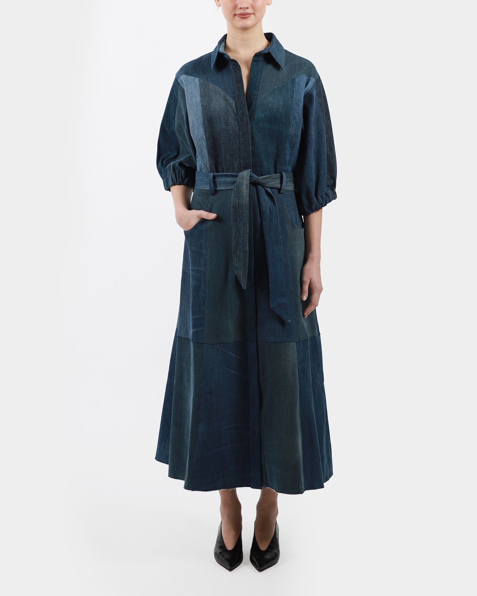 This up-cycled shirt dress, features a classic collar, hidden buttons at front to close, 3/4 sleeves with elasticated hem, side pockets, removable belt, denim patches all over and raw edges at bottom hem.