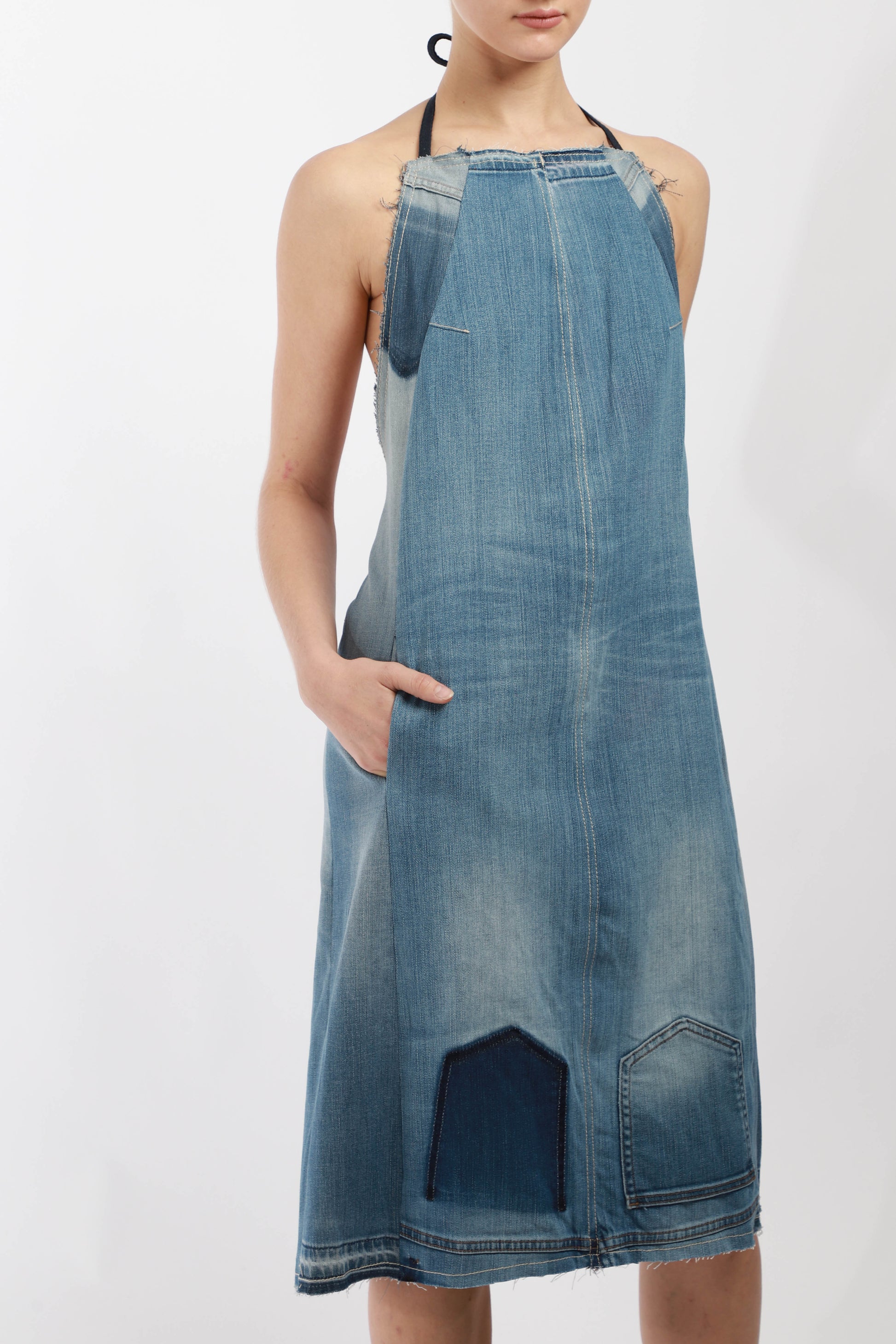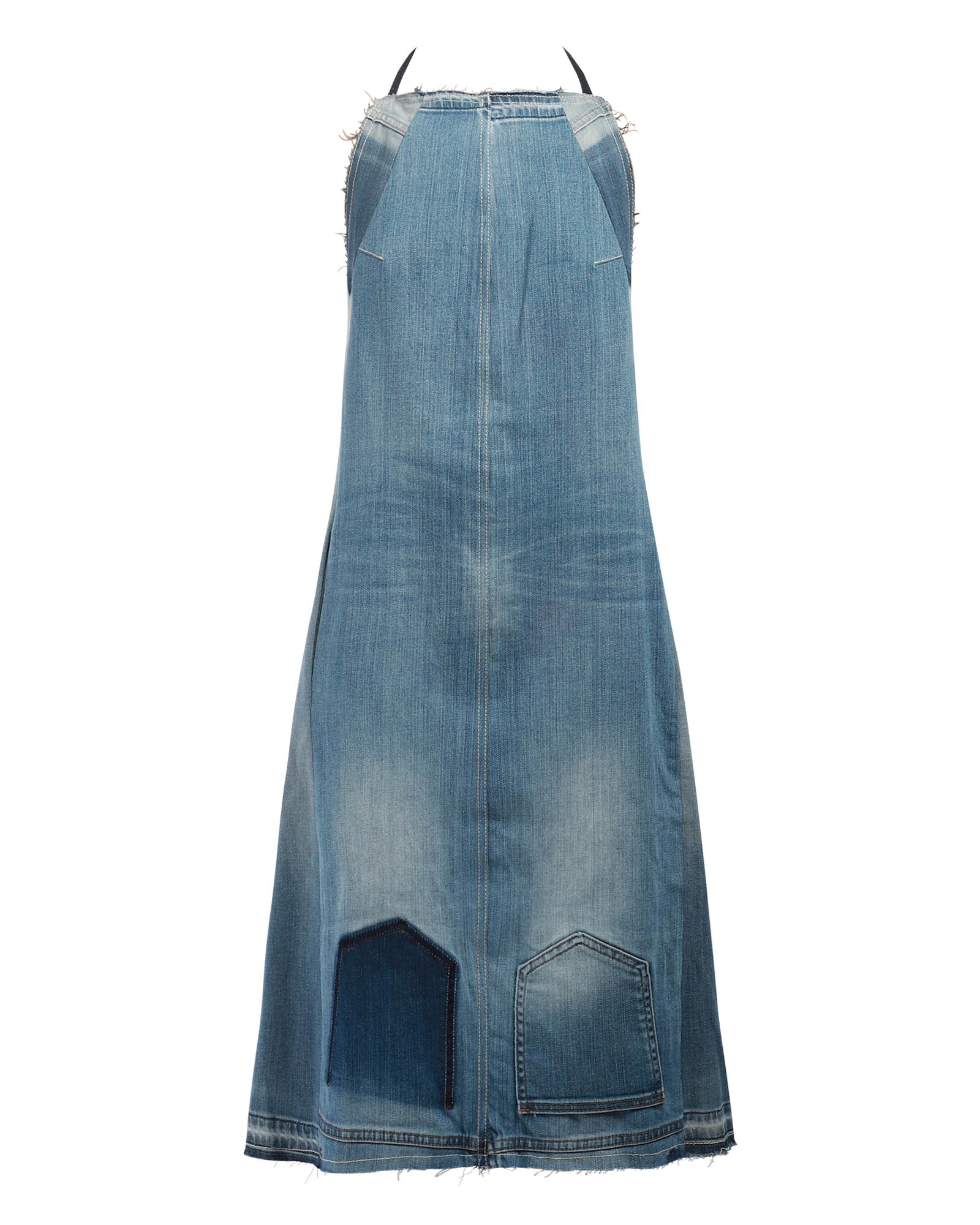 RORA is a one-of-a-kind apron dress made from secondhand denim, featuring raw edges, a knee-length cut, and an open back.