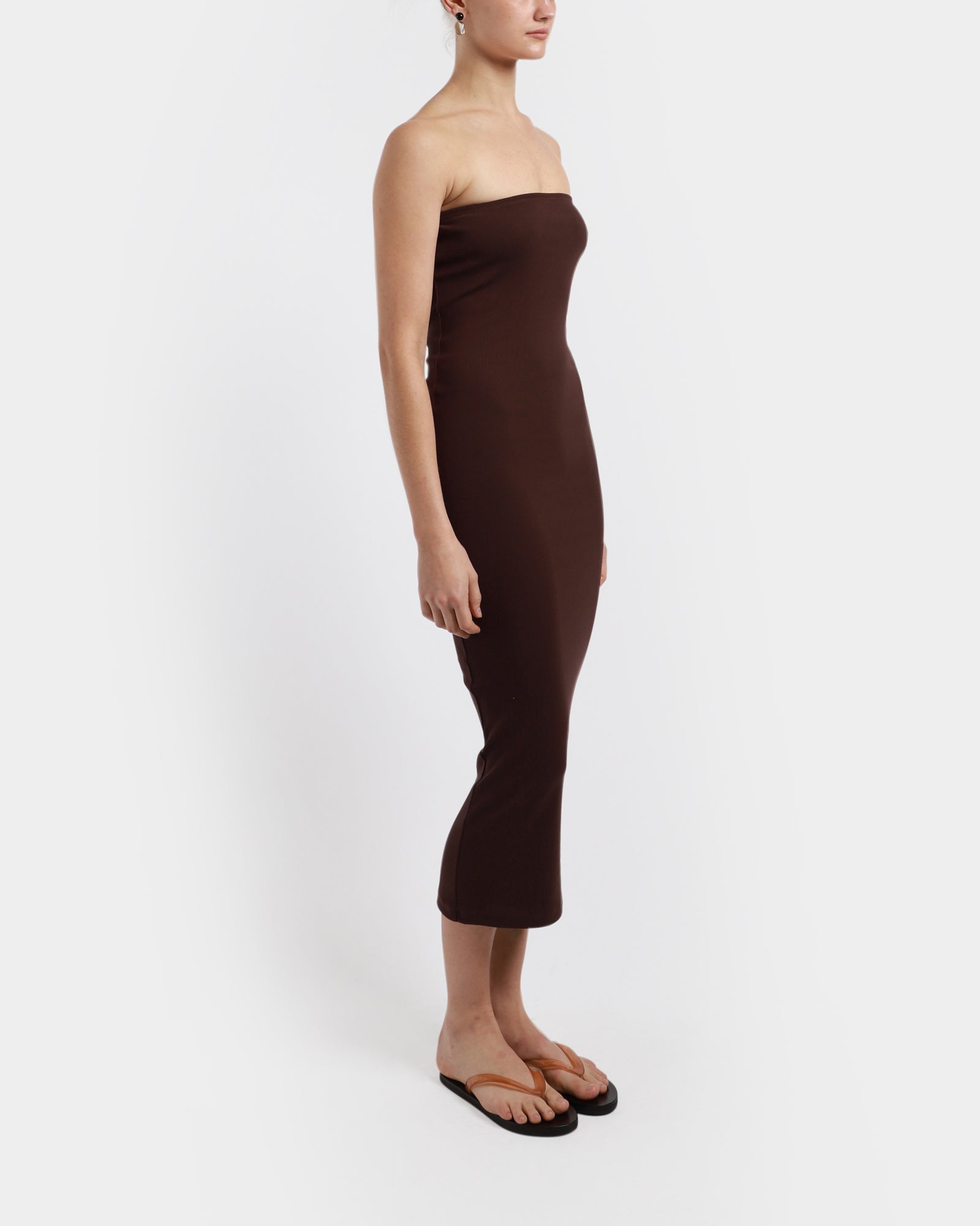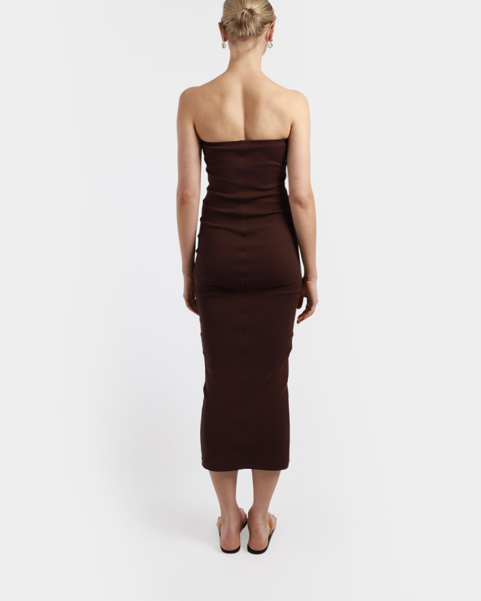 The Liv Dress is a midi-length pencil dress crafted from organic cotton with a fine ribbed texture throughout. It features a comfortable elastic waist and a double-stitched, cut-off seam detail at the back. Made in Portugal.