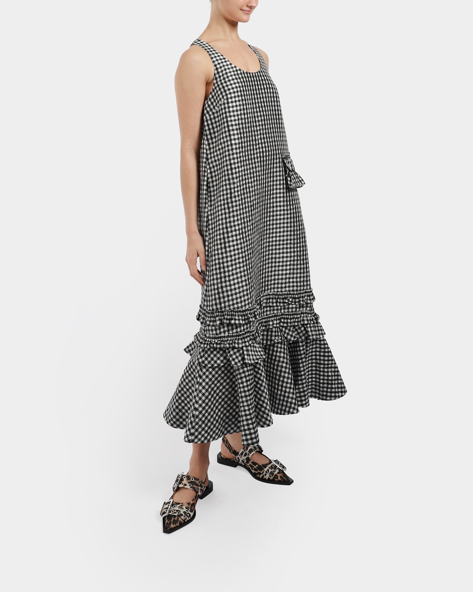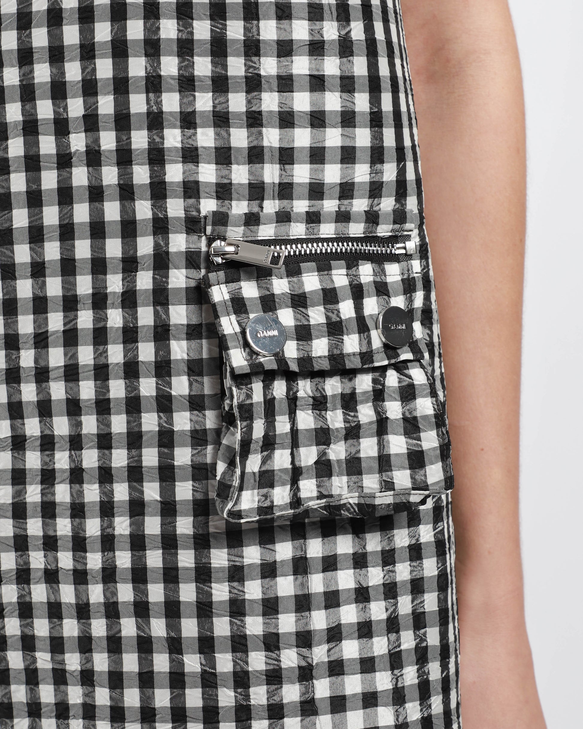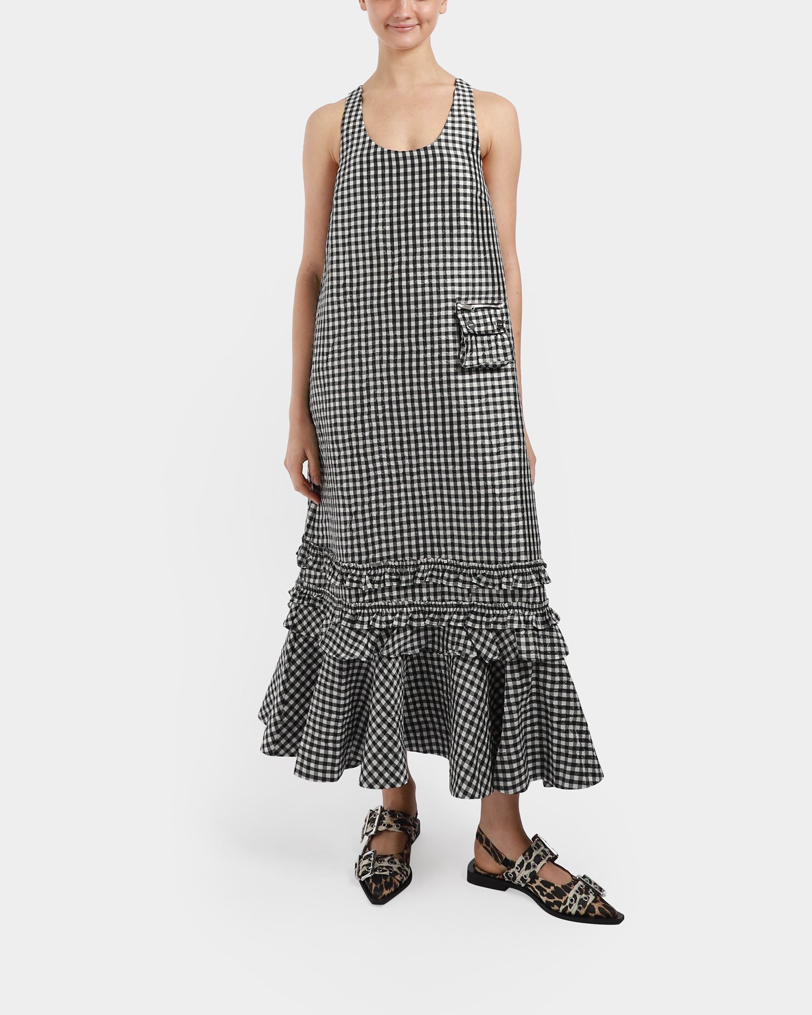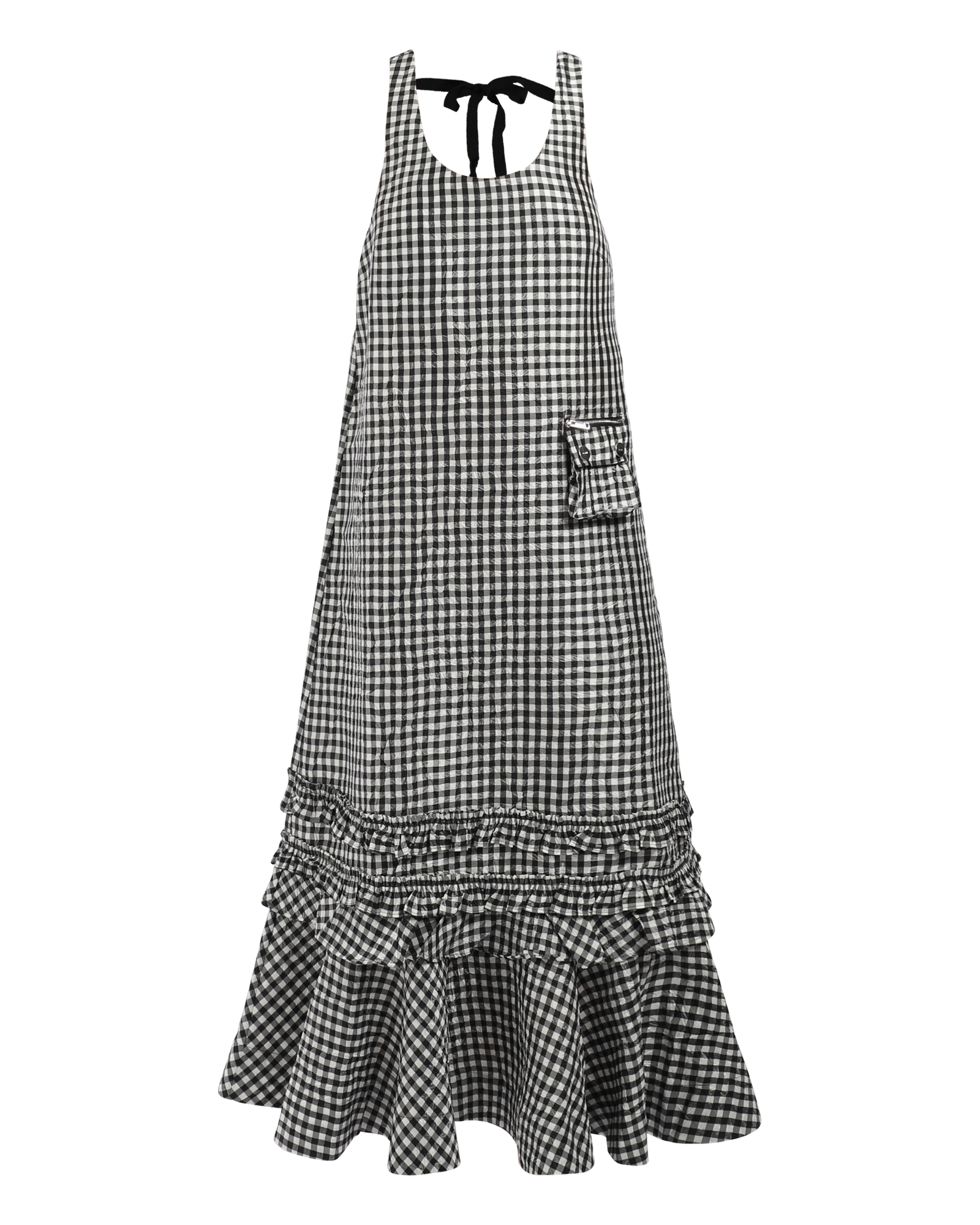 This check pattern dress, features a U-neckline, a zipped detachable front pocket, ruffled hem, side pockets and an open back with an adjustable tie detail.