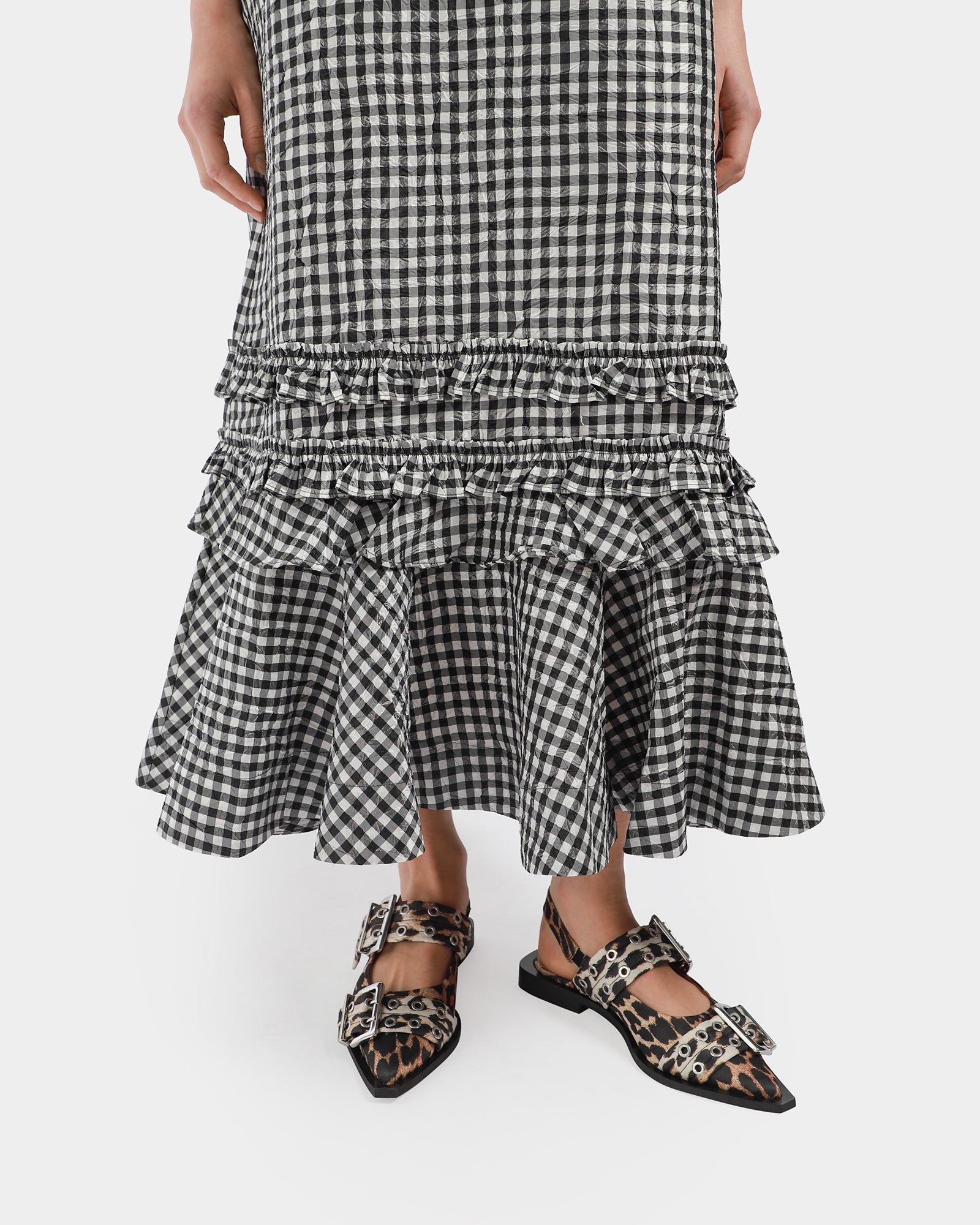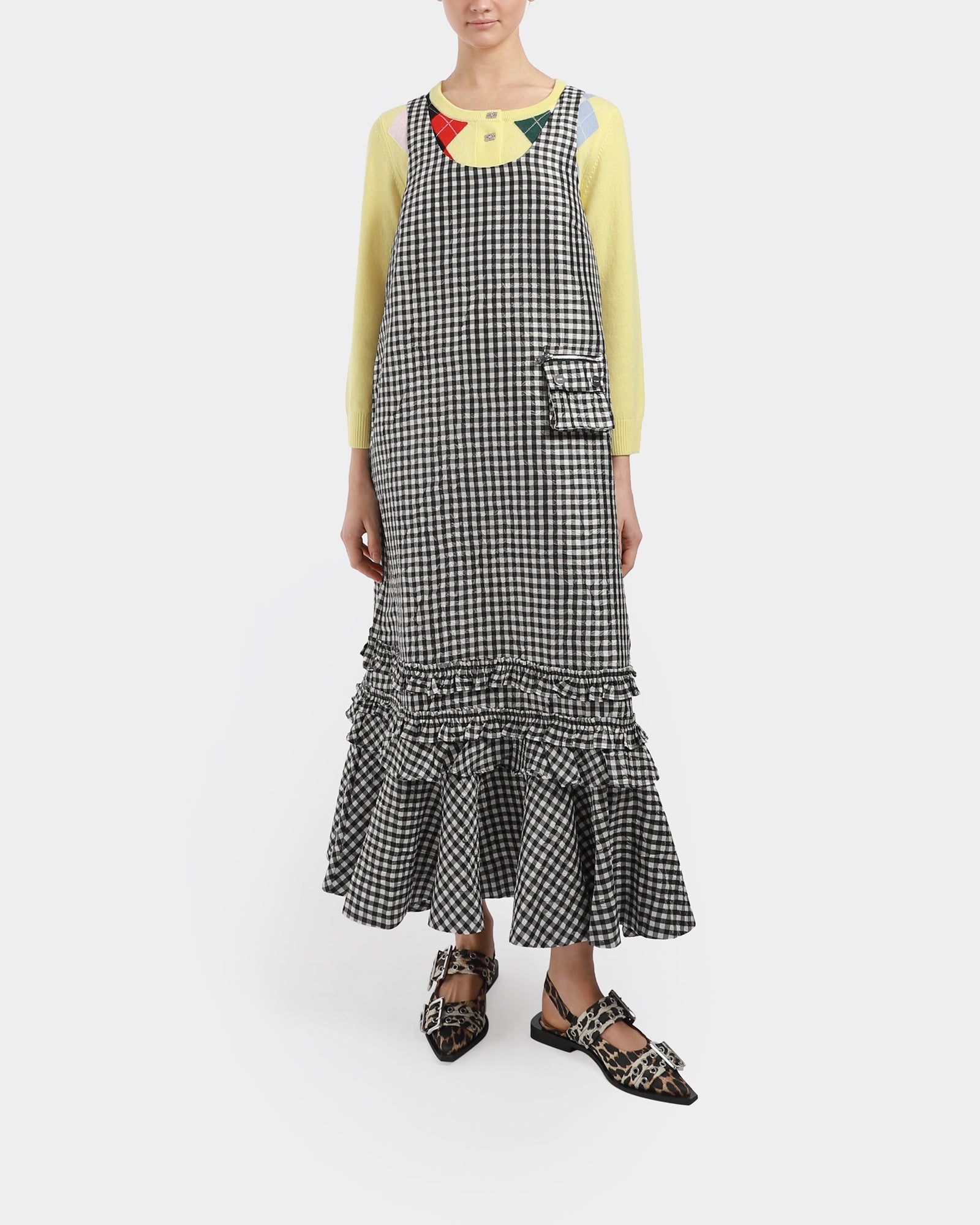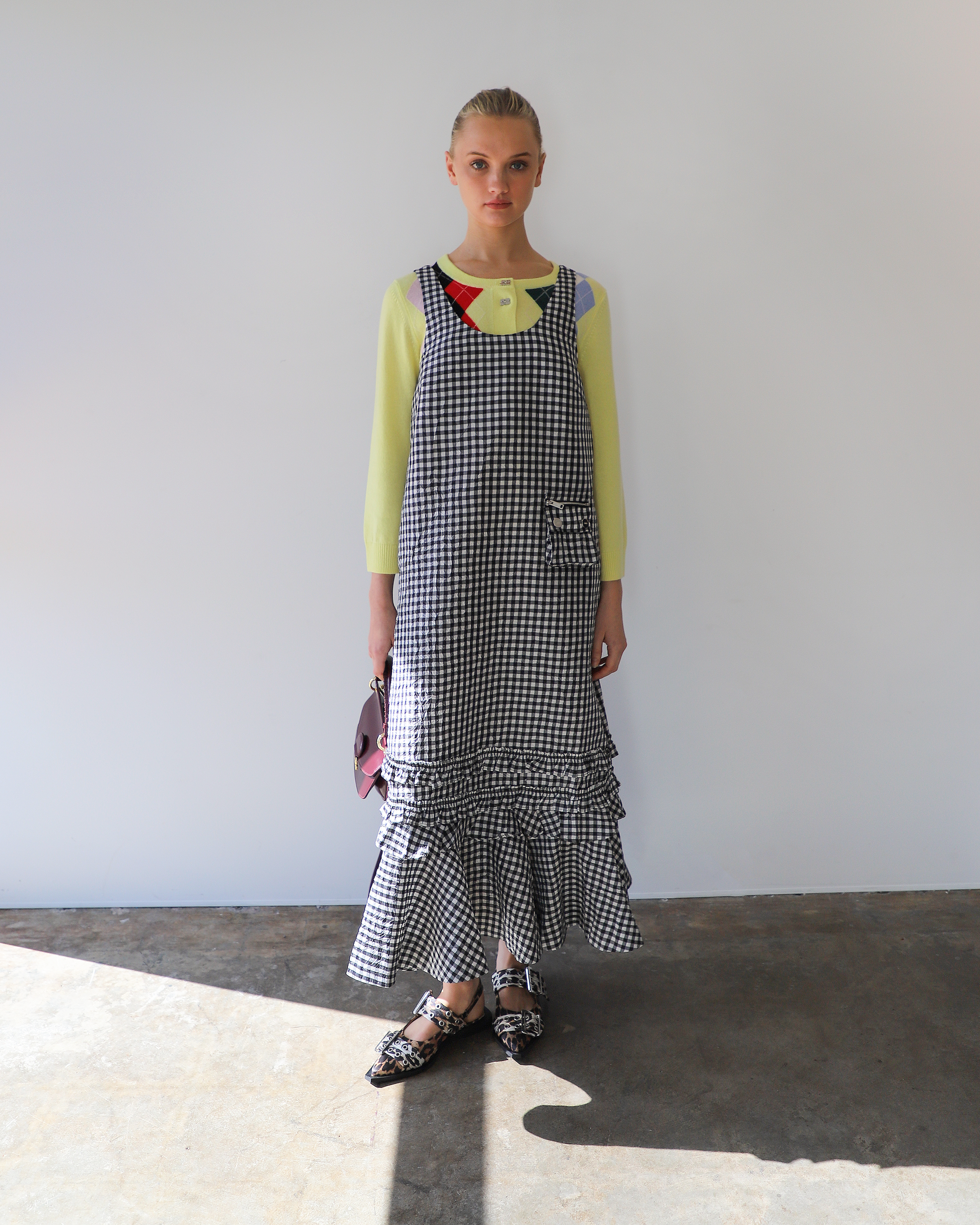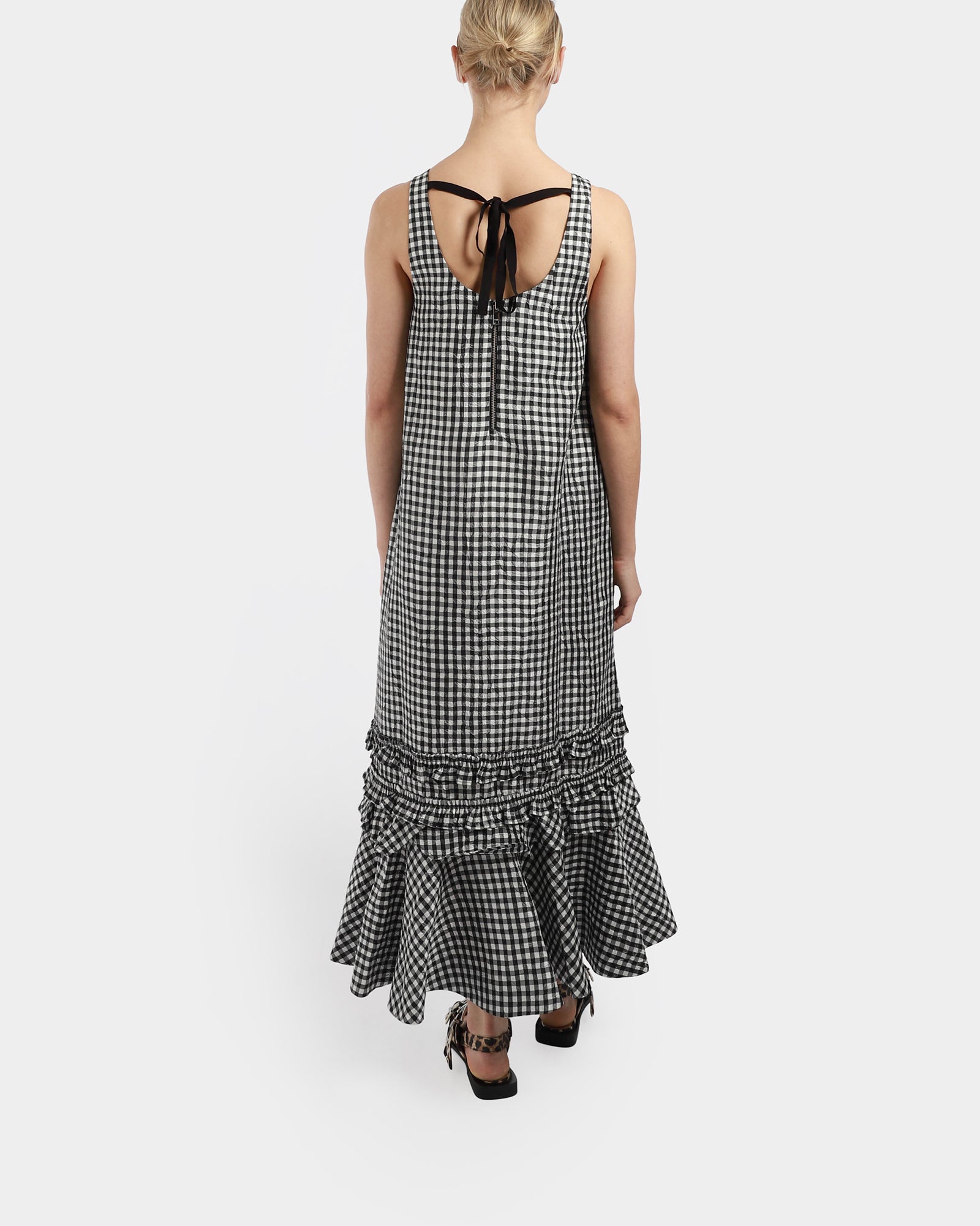 This check pattern dress, features a U-neckline, a zipped detachable front pocket, ruffled hem, side pockets and an open back with an adjustable tie detail.