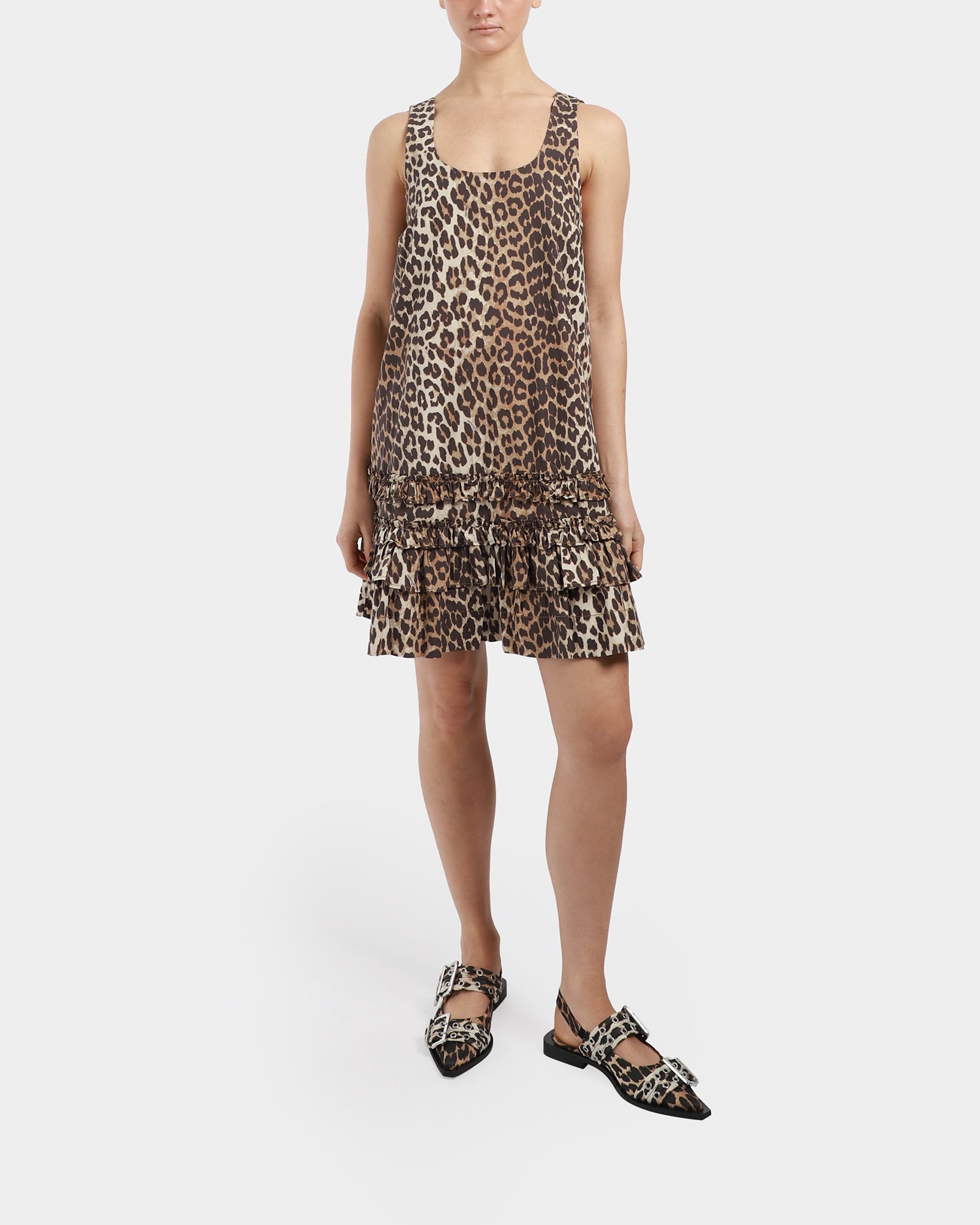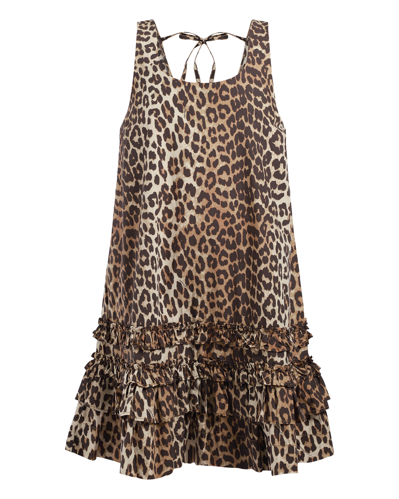 This printed leopard mini dress, features a U-neckline, a ruffled hem and an open back with adjustable tie closure.