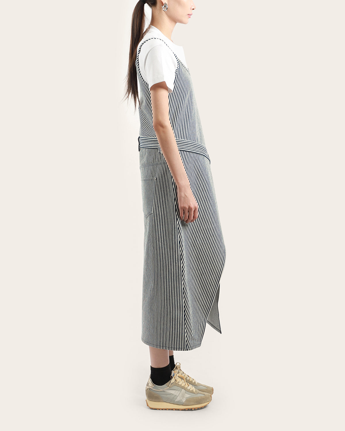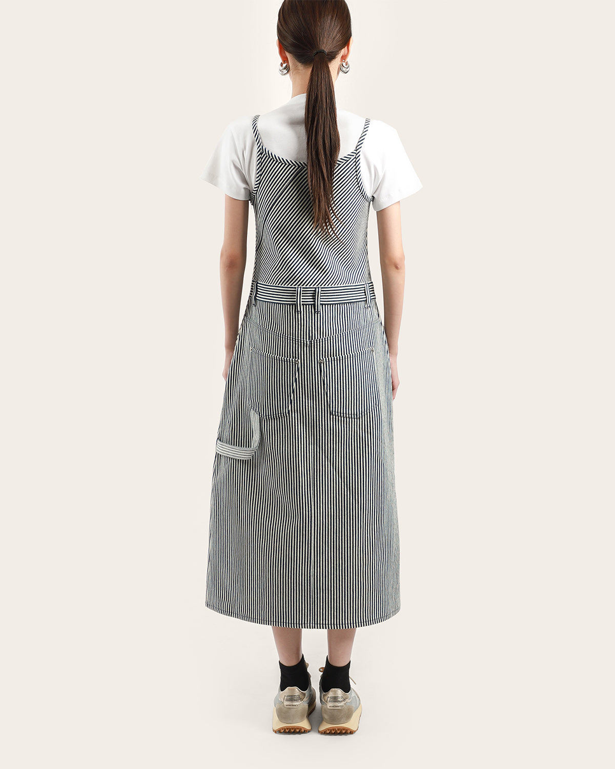 Workwear elements are elevated through thoughtful detailing, including adjustable shoulder straps, carpenter loop, and functional pockets, balancing practicality with modern edge.