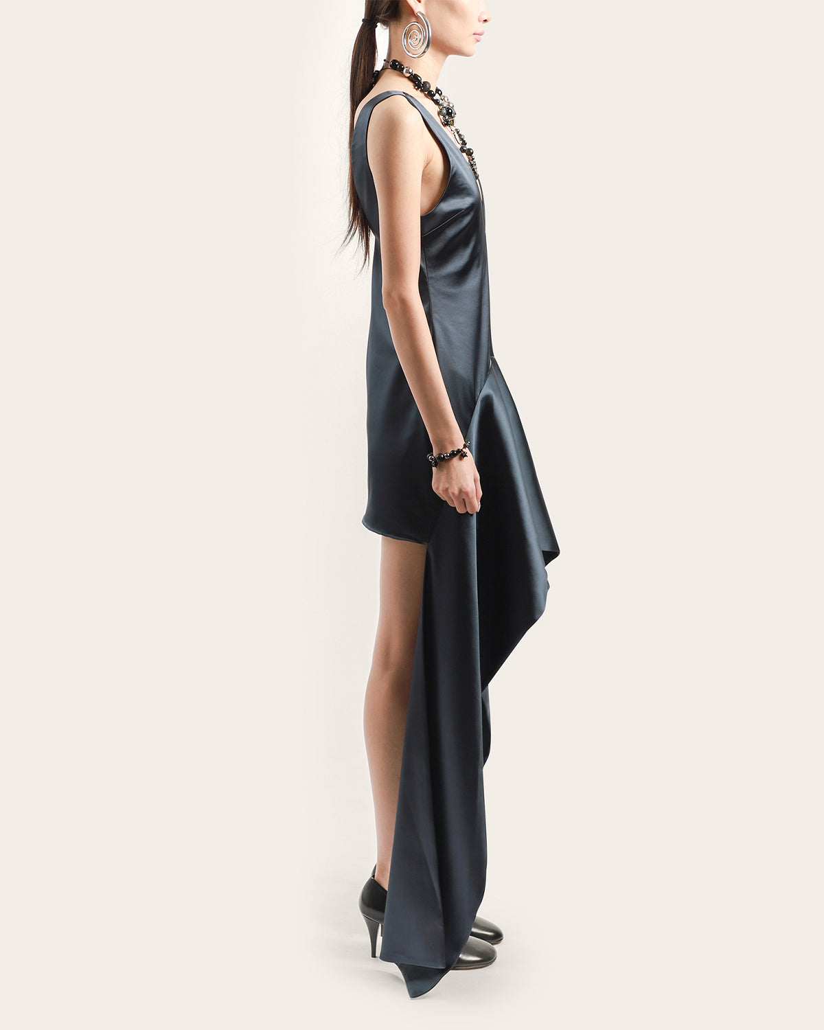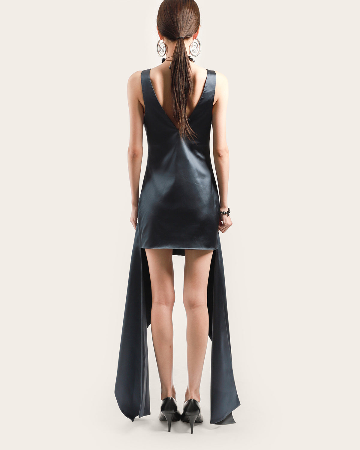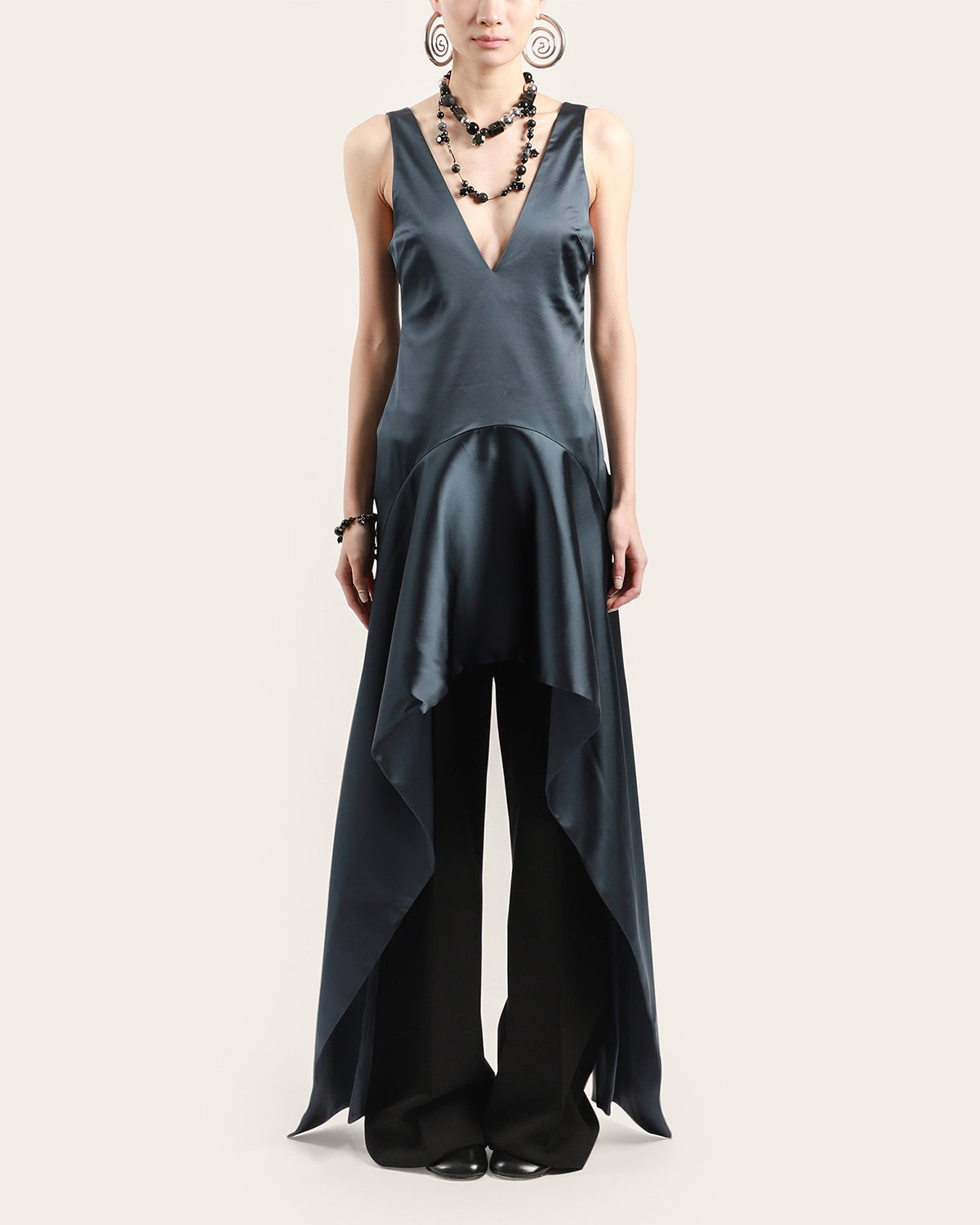 - V-neckline with curved draped hem
