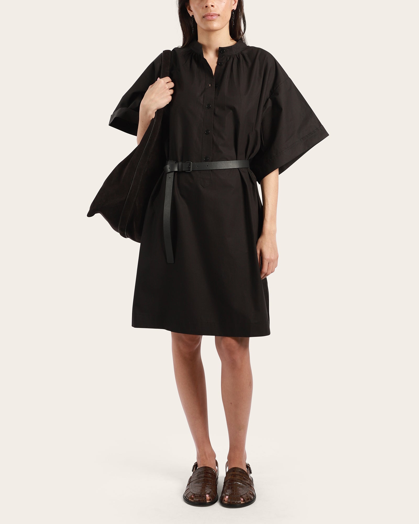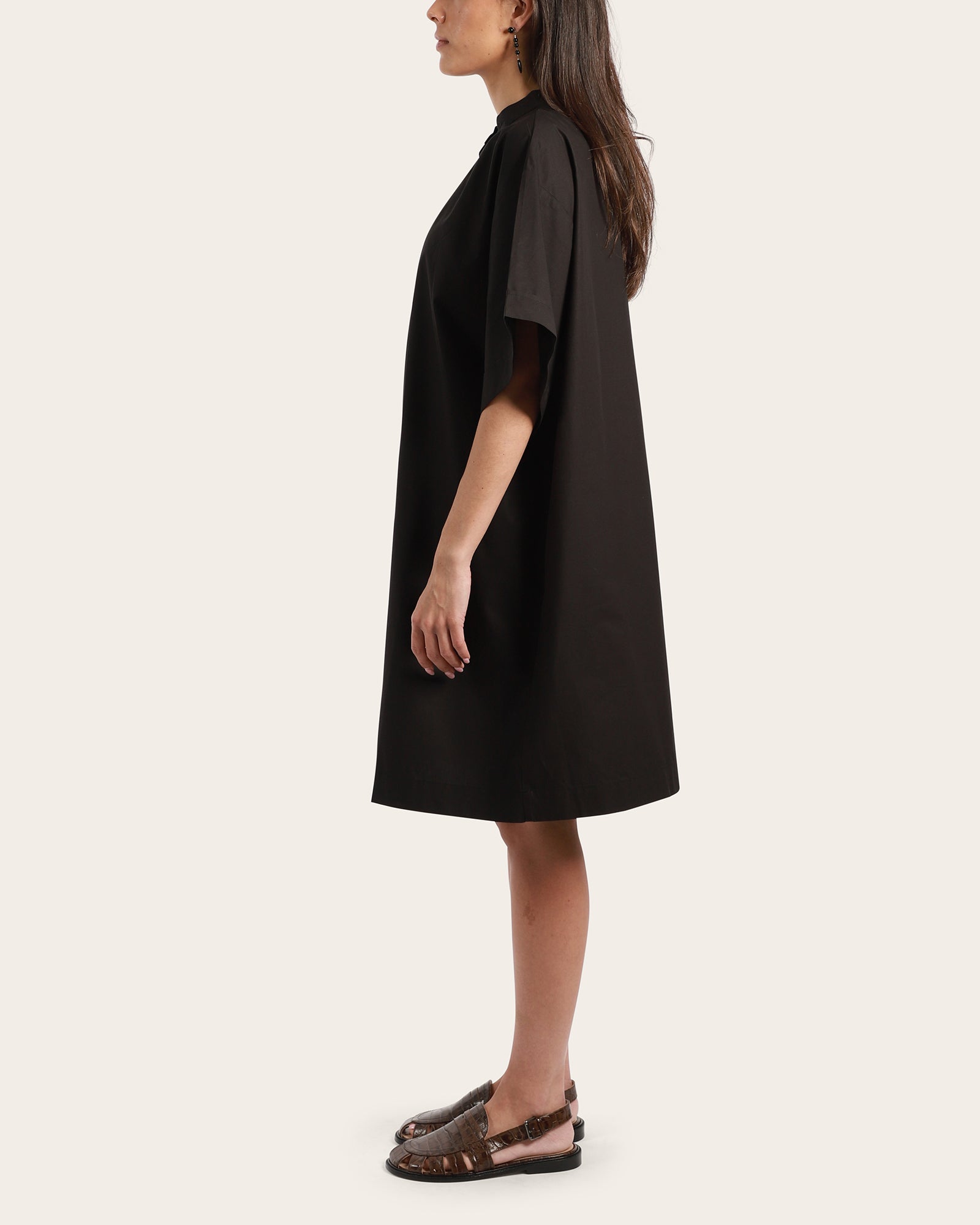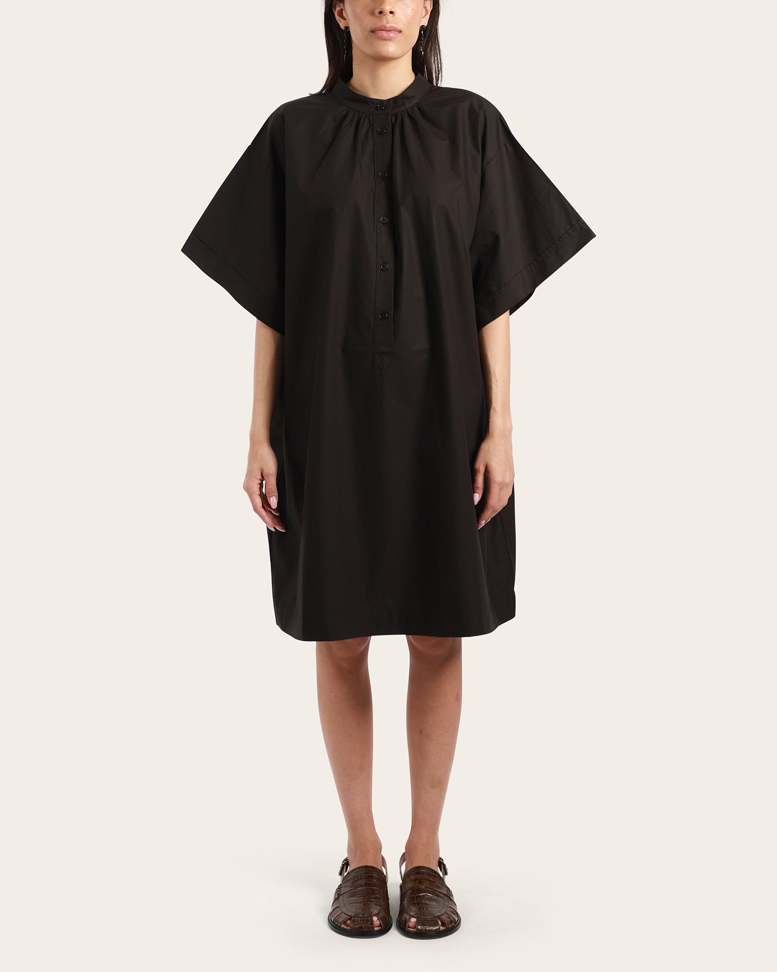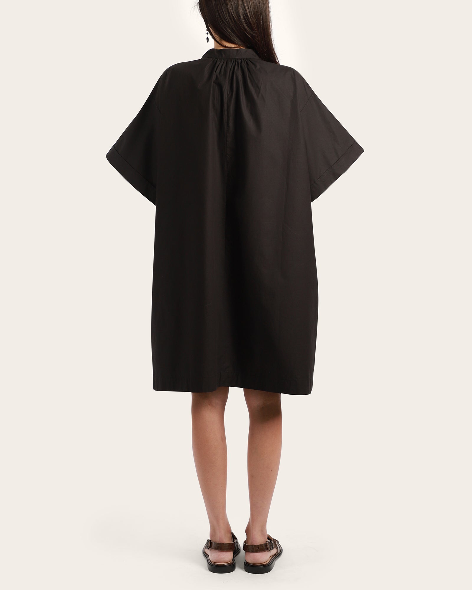 The Gallery Dress is made from crisp organic cotton poplin with an oversized fit and boxy, deep-cut sleeves for a striking silhouette. A softly gathered neckline with a shell button placket adds a refined touch, while inseam pockets and a knee-grazing length ensure everyday practicality.