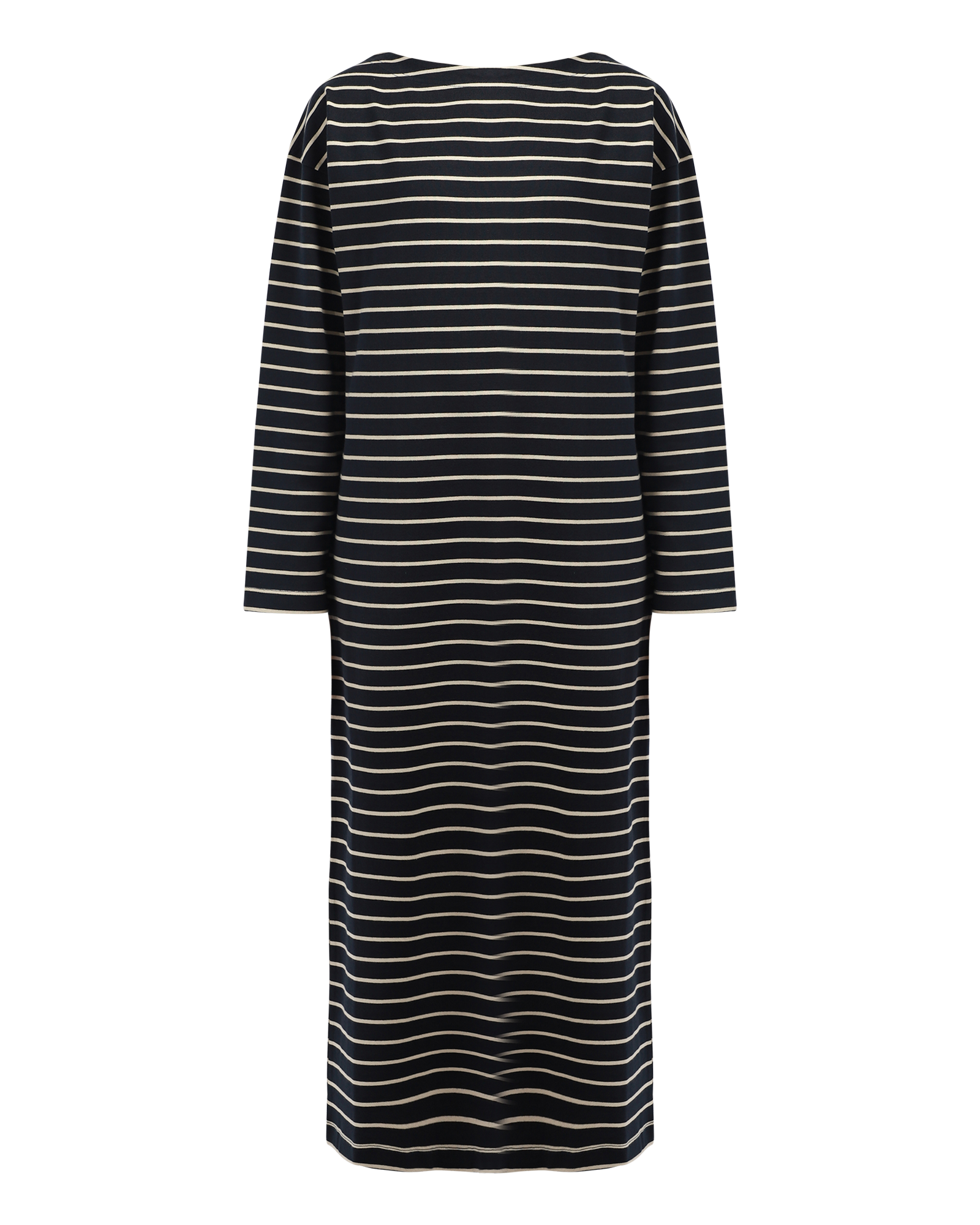 A boxy Breton-style dress in heavyweight organic cotton jersey with navy and greige stripes, drop shoulders, and a boat neck. Falls effortlessly above the ankle.
