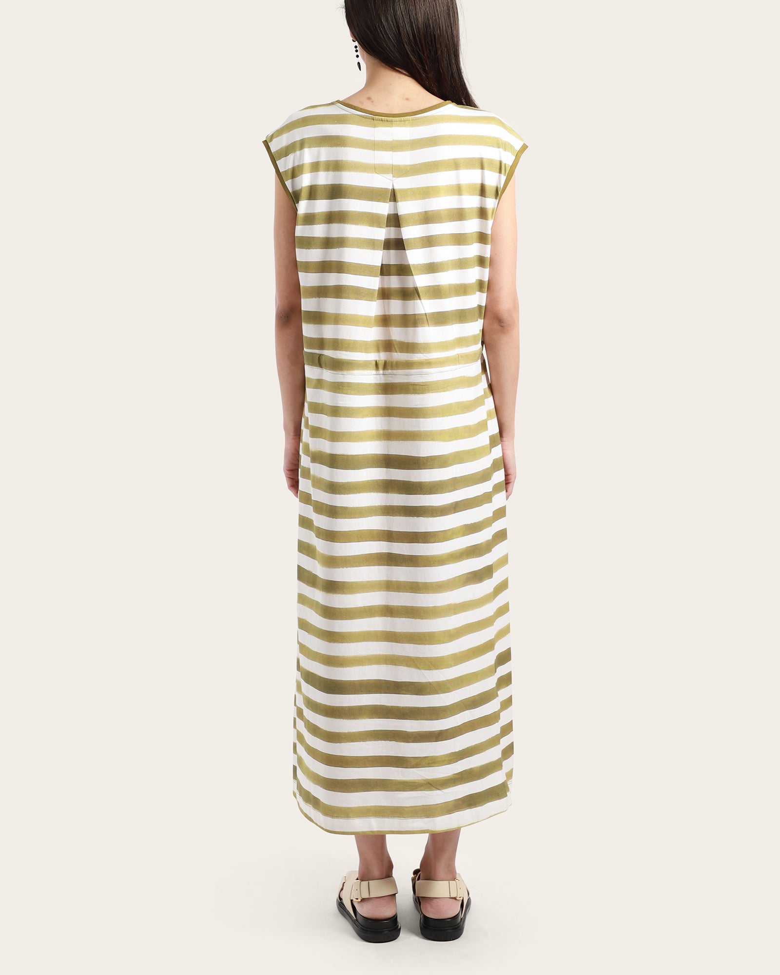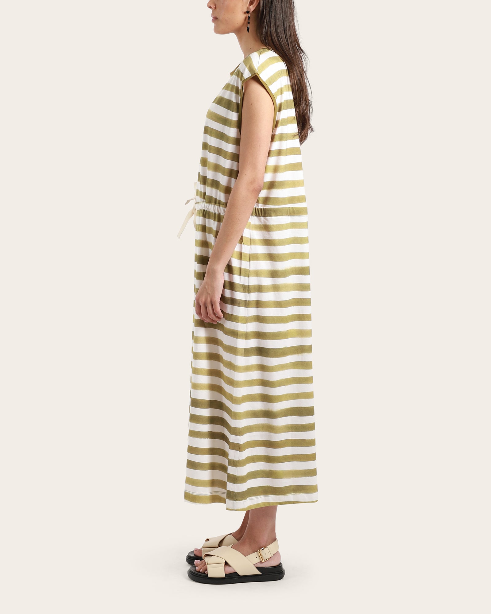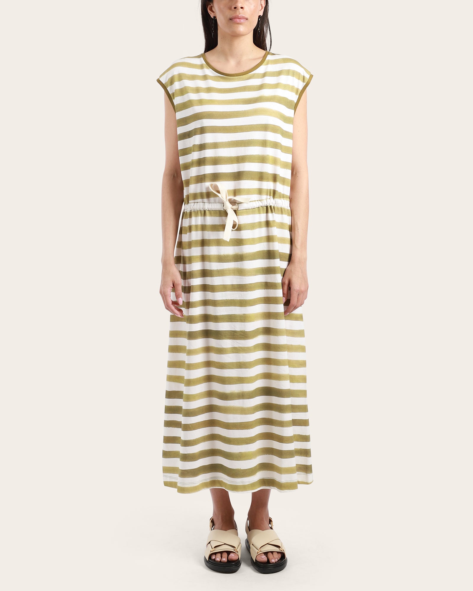 The Wave Dress is cut from soft organic cotton with a relaxed fit, cap sleeves, and a midi length. A drawcord and back pleat add shape, while the hand-painted Brushstroke Stripe print offers an artistic twist on the Breton stripe.