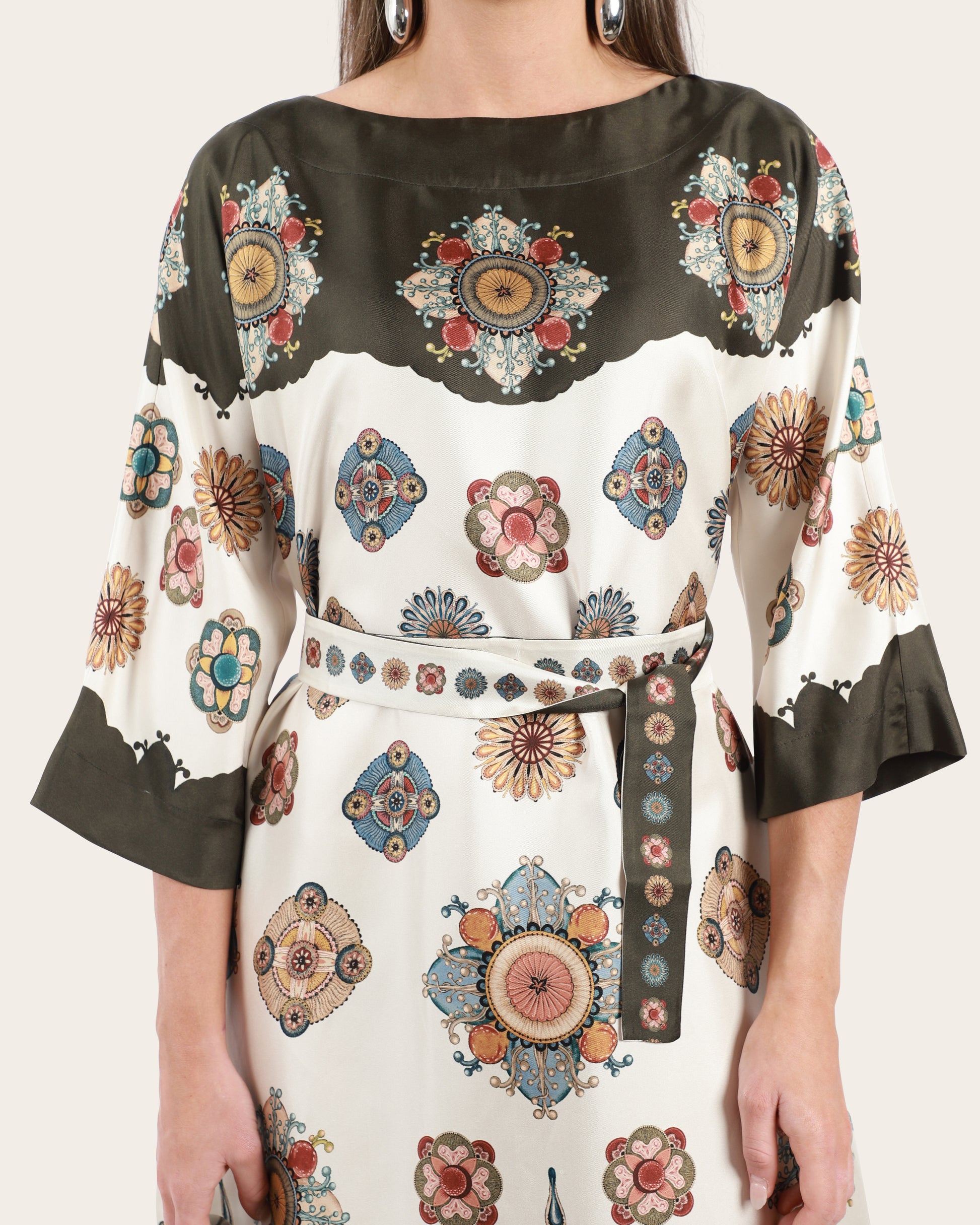 This 1970s inspired caftan is all about drama and luxury. Crafted from acres of Como made silk, its oversized fit and floor-sweeping length make it perfect for elegant Italian soirées. Featuring a stunning Byzantine inspired Nucleus print, just add flats and statement earrings for effortless glamour.