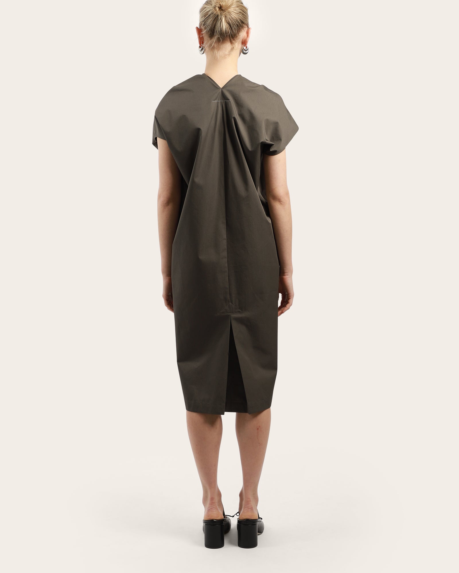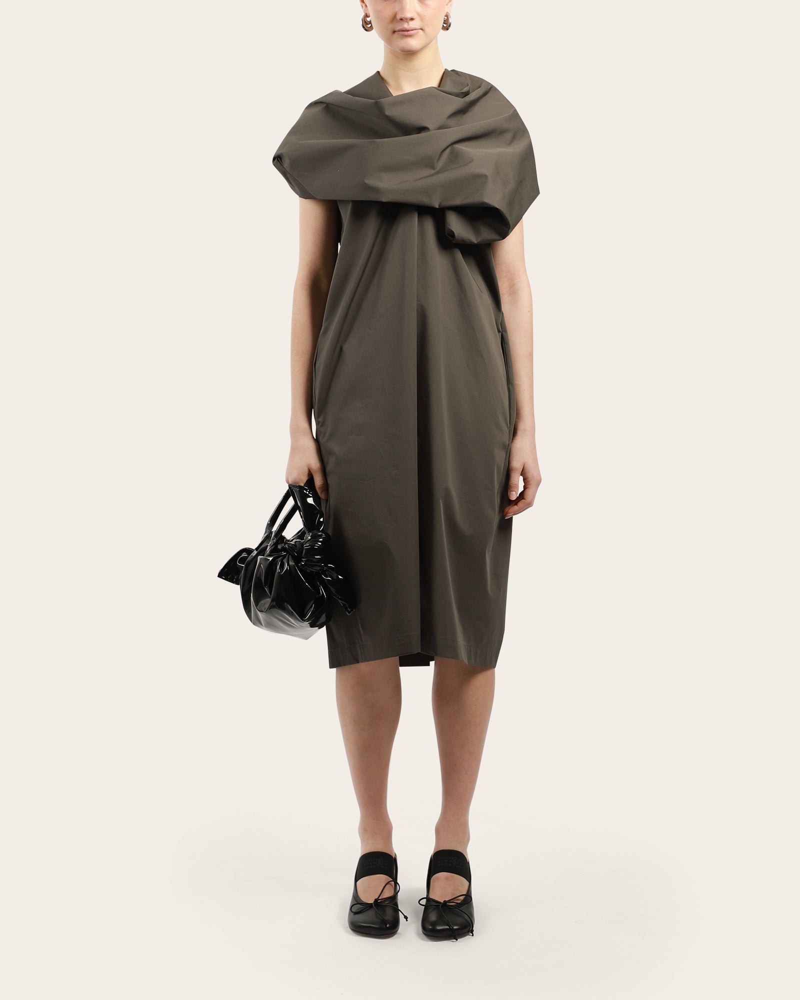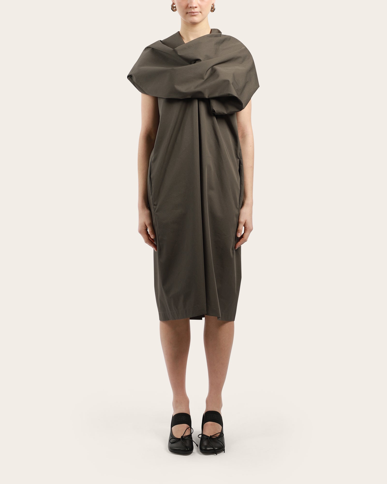 A dress, made from 100% cotton, featuring a detail ruffled fabric at neckline and shoulders, regular fit and midi length with side pockets. Made in Italy.