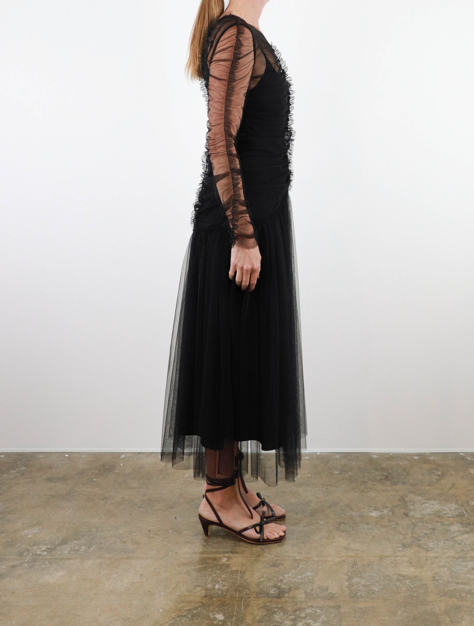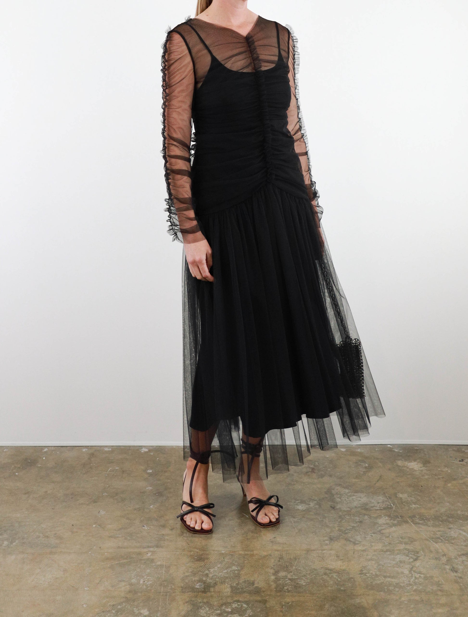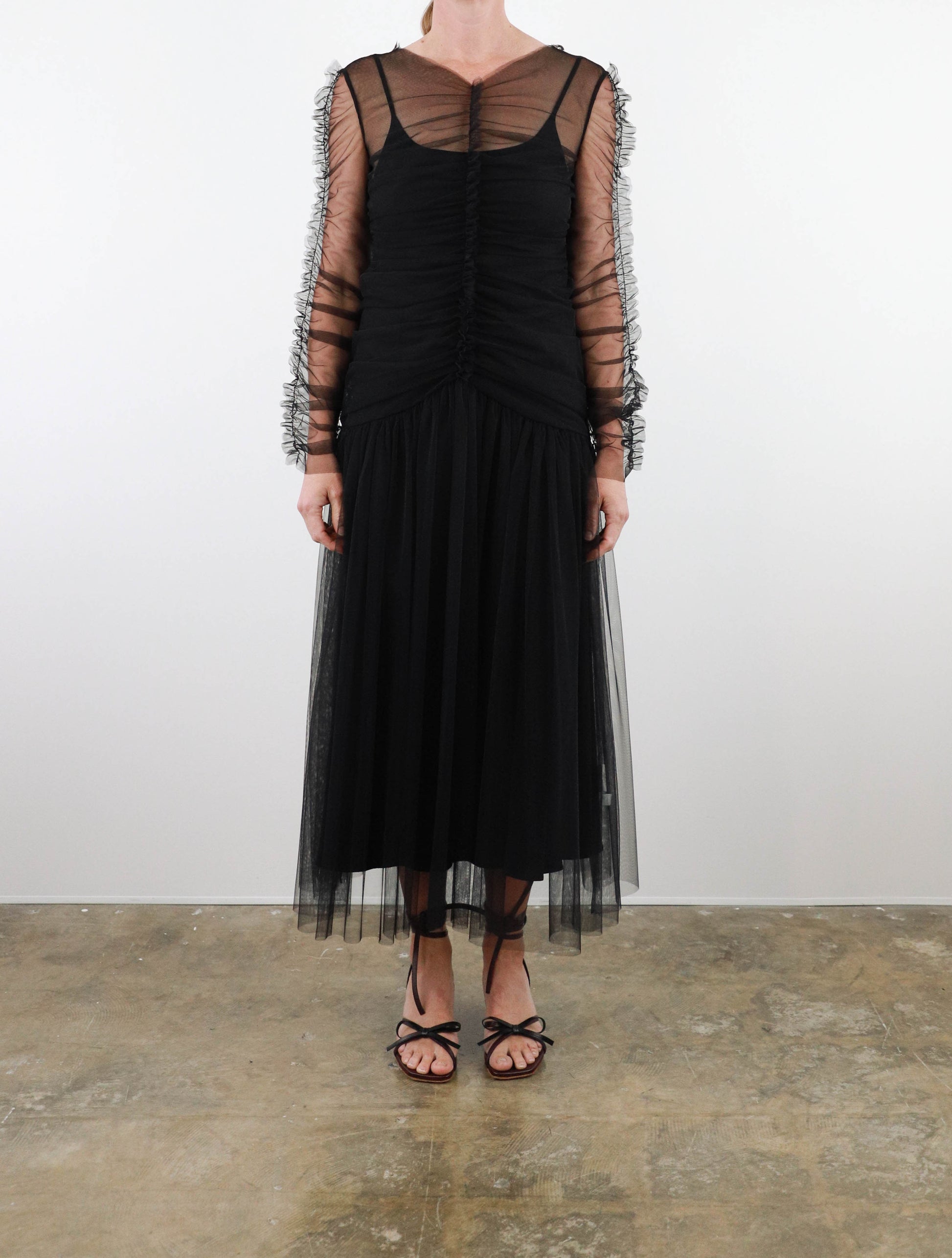 Midi length dress from Molly Goddard in sheer soft tulle, featuring fitted upper with ruched vertical seam and frill detail, ruched sleeves with frill seam, gathered dropped waist with full skirt and multi-layered tulle. Comes with separate lining slip dress.