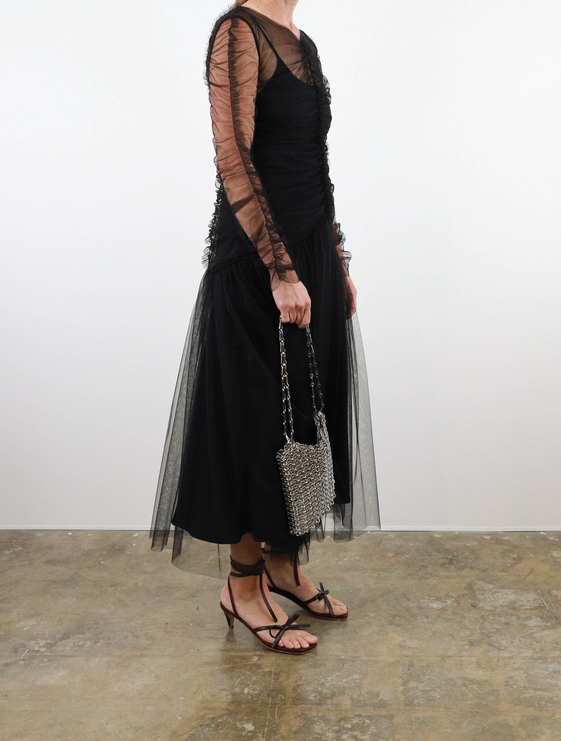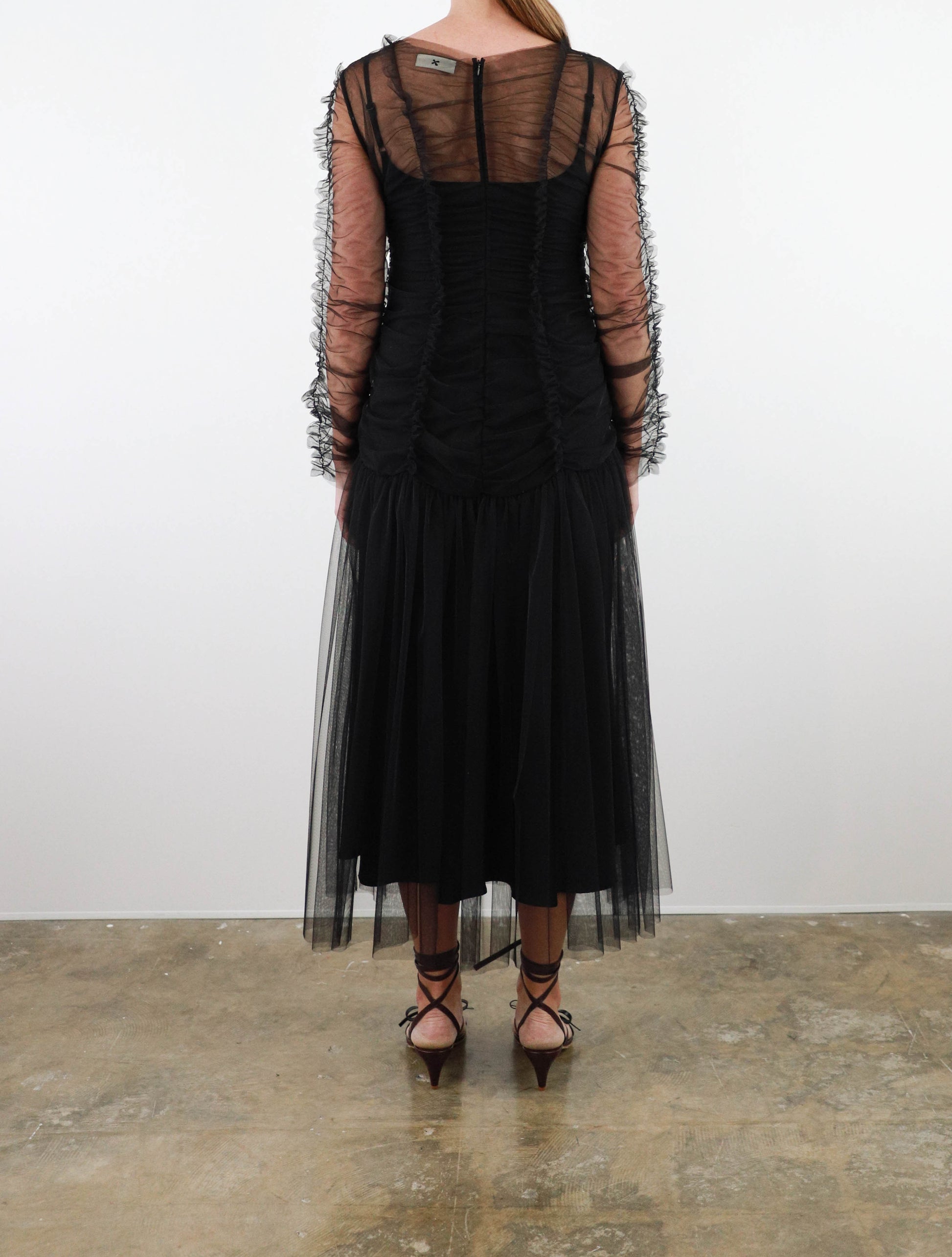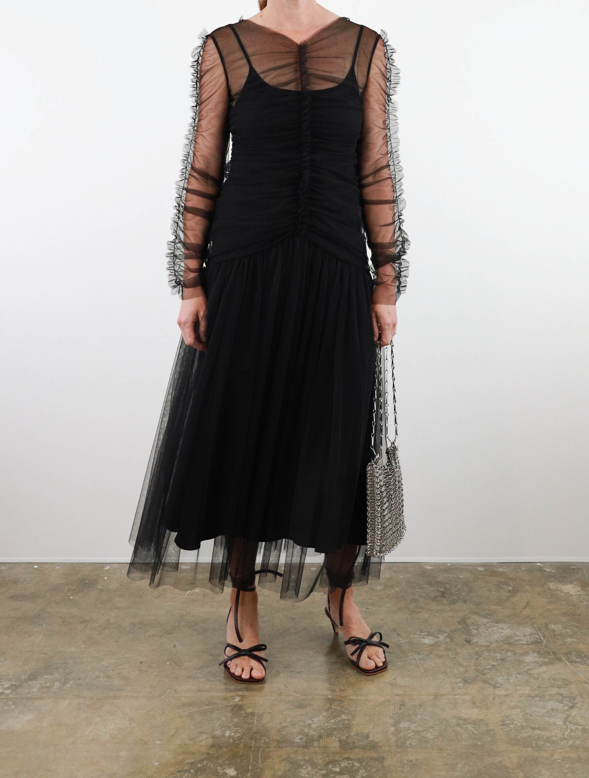 Midi length dress from Molly Goddard in sheer soft tulle, featuring fitted upper with ruched vertical seam and frill detail, ruched sleeves with frill seam, gathered dropped waist with full skirt and multi-layered tulle. Comes with separate lining slip dress.