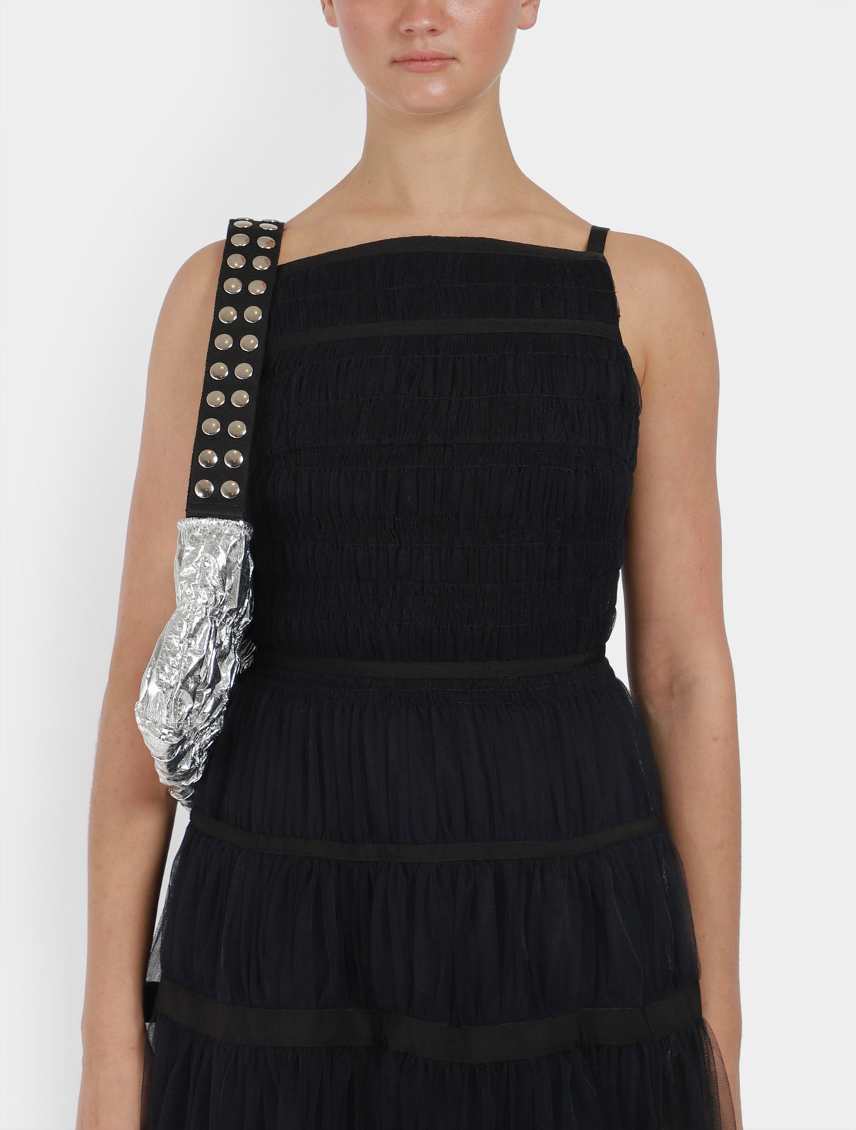 Molly Goddard dress in soft tulle fabric, multi-layered constructions, cotton ribbon detailing throughout to created structure, dress is partially lined and closes with invisible zip.