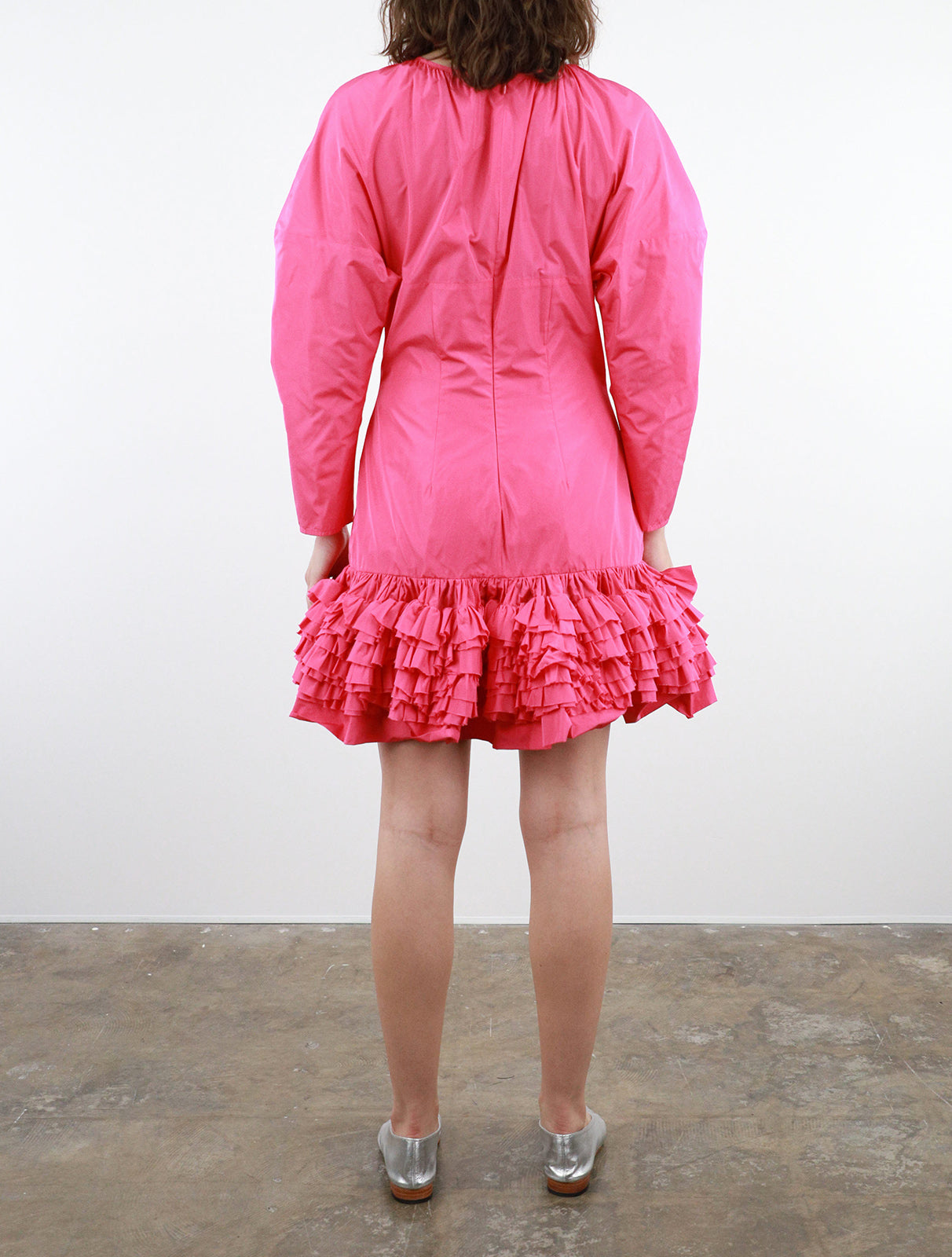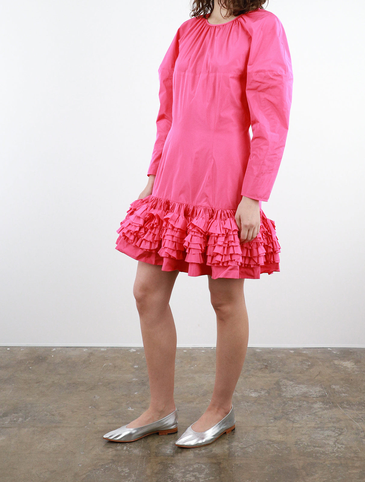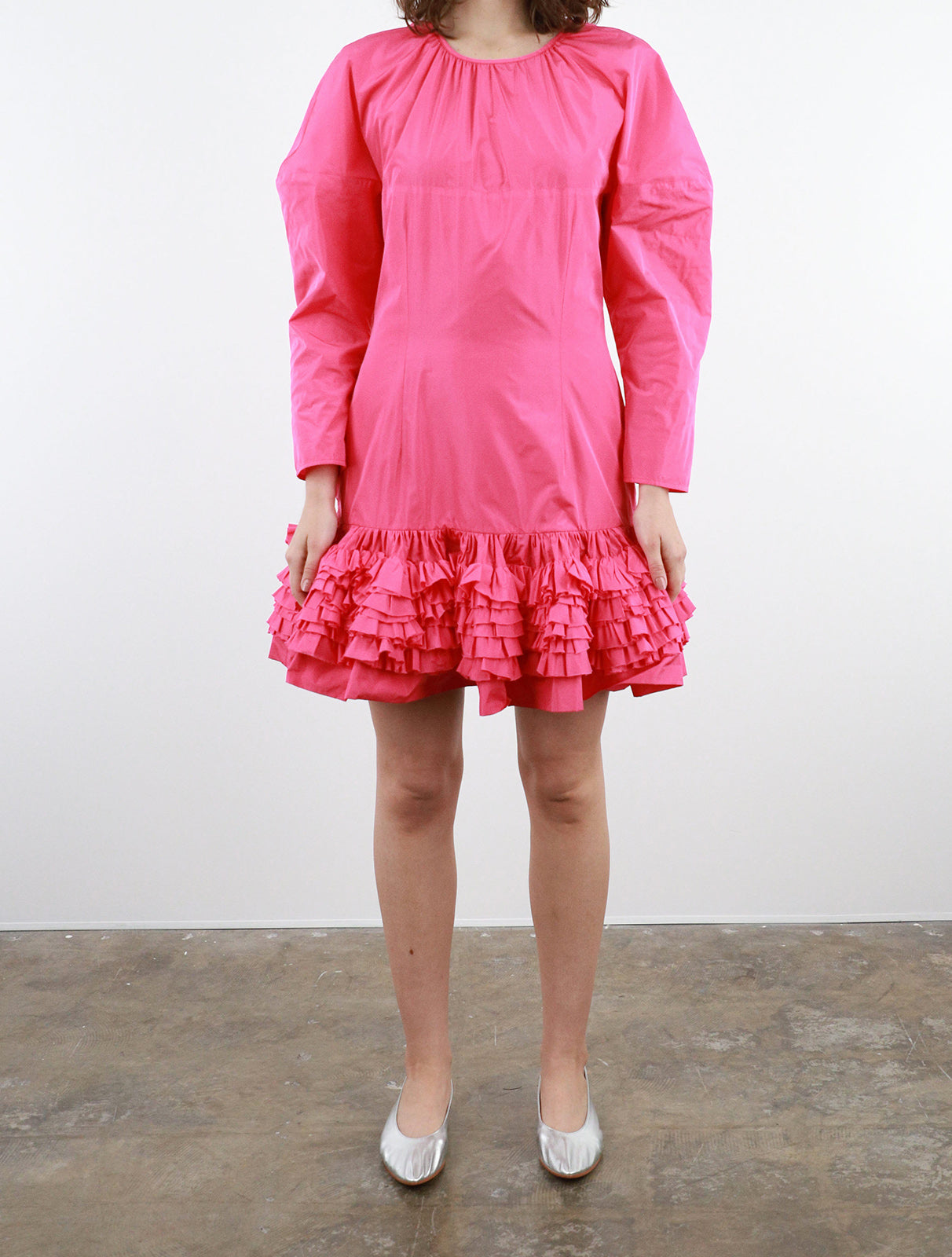 Long sleeve dress from Molly Goddard featuring taffeta fabric, gathered scoop banded neckline, tapered sleeves, close fit body, layered frill skirting and concealed zip back.