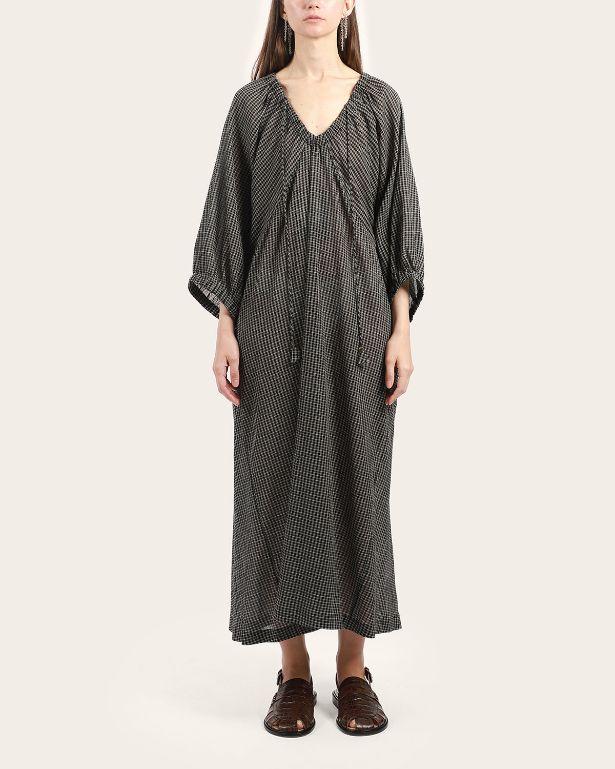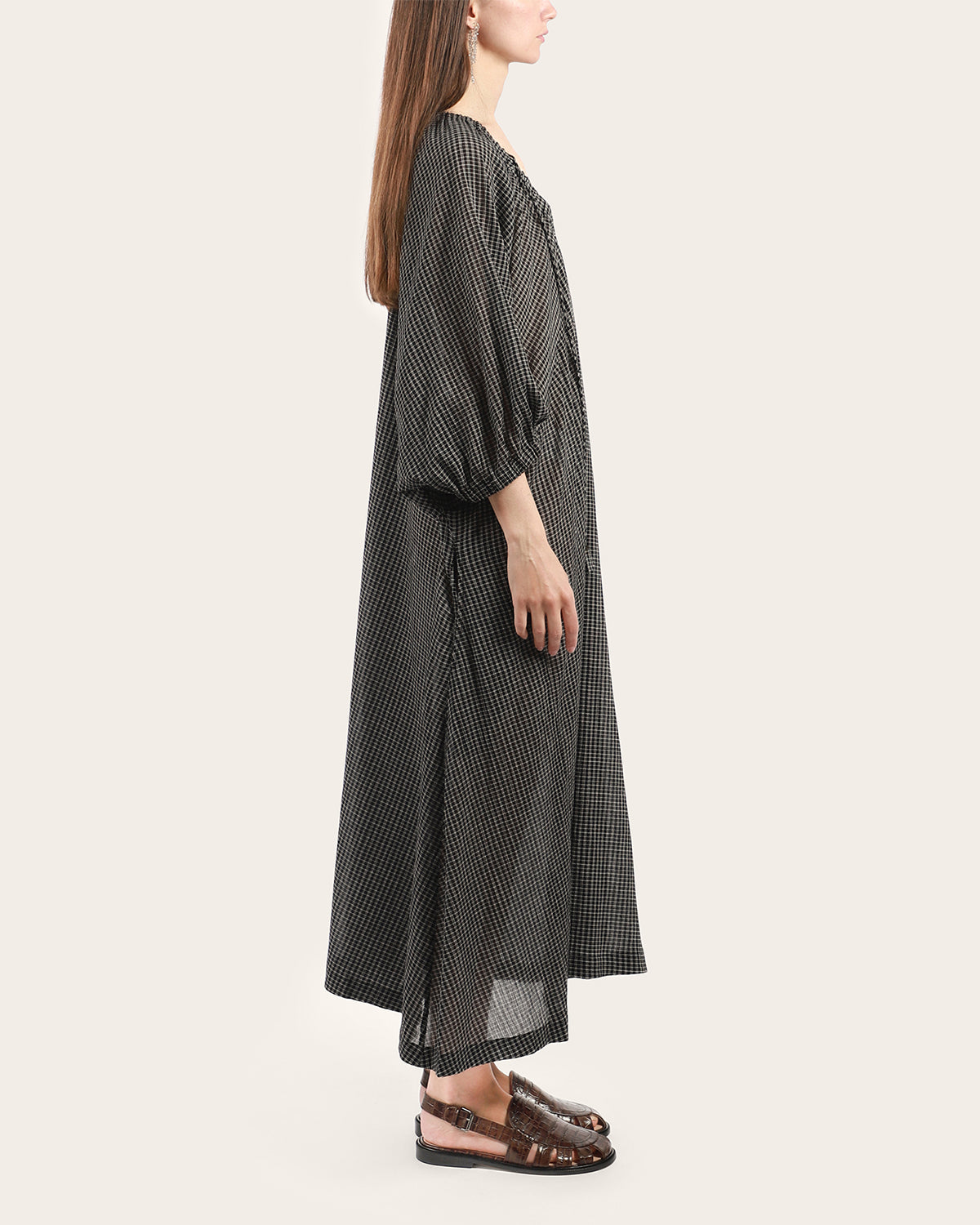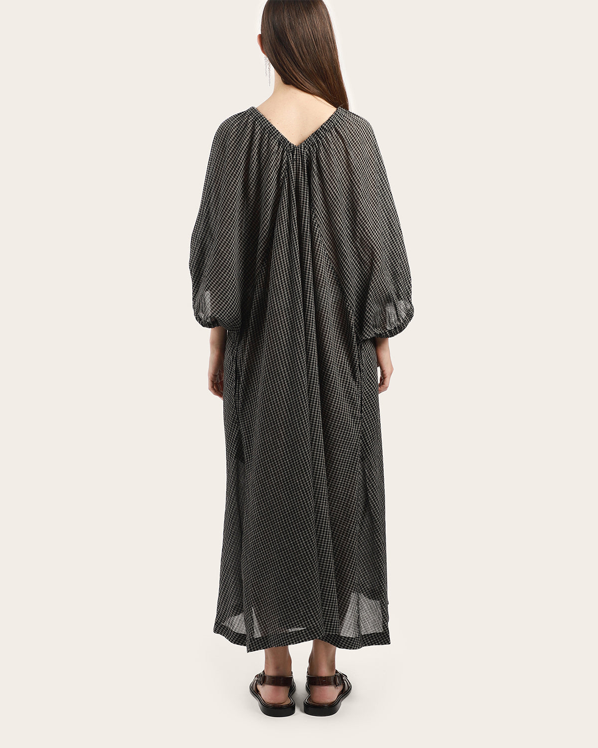 A relaxed fit dress with a subtle black check pattern, made from 100% cotton, featuring a gathered V-neckline & backline, wide three-quarter sleeves, side pockets. Lightweight and airy, it drapes beautifully for an effortless, modern look. Perfect for layering or wearing solo with boots or sandals.