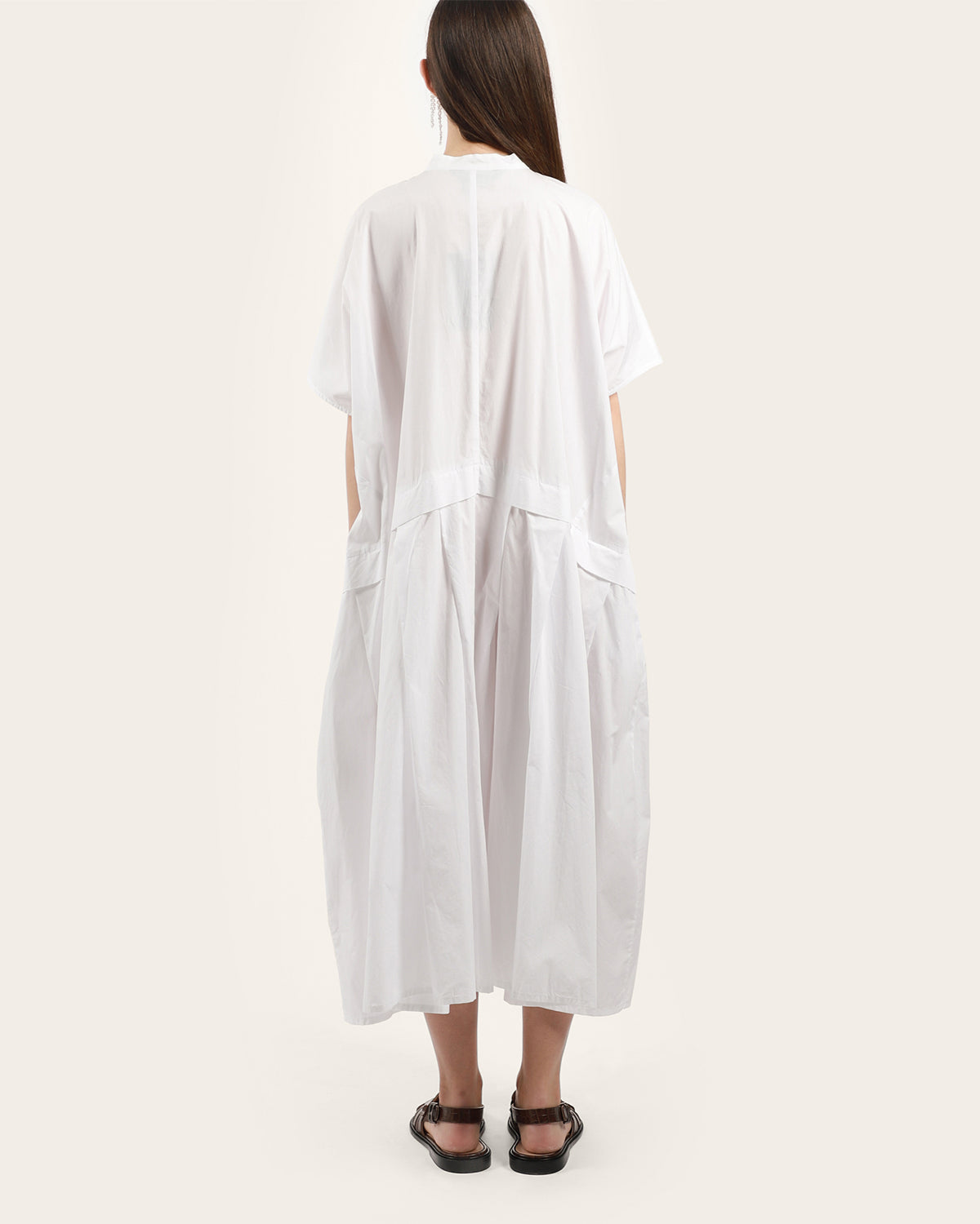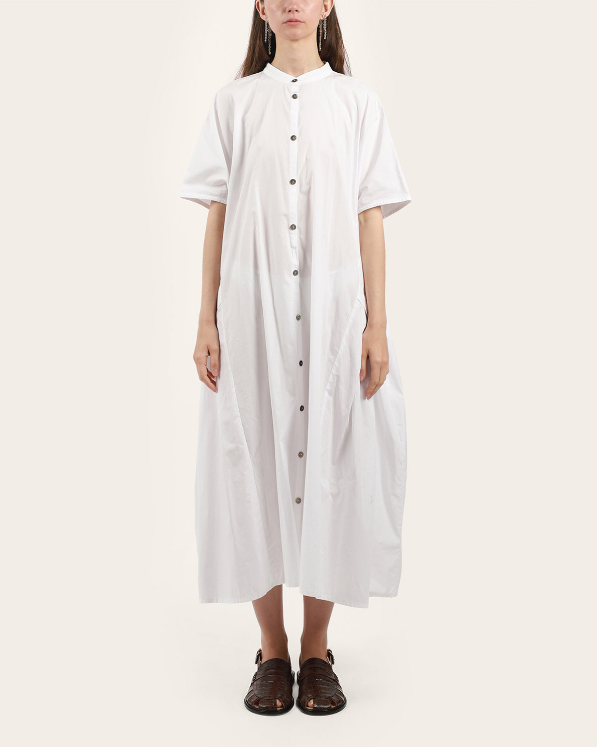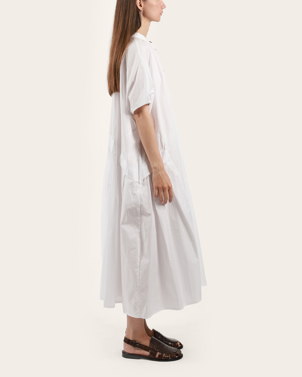 The Moyuru Side Pleat Button-Up Dress in white redefines modern minimalism. Designed with a relaxed silhouette, this airy dress features a classic stand collar, a full button front, and sculptural side pleats that add movement and dimension. Subtle seam pockets complete its practical elegance. Wear it alone for a clean statement or layer it for a versatile, contemporary look.