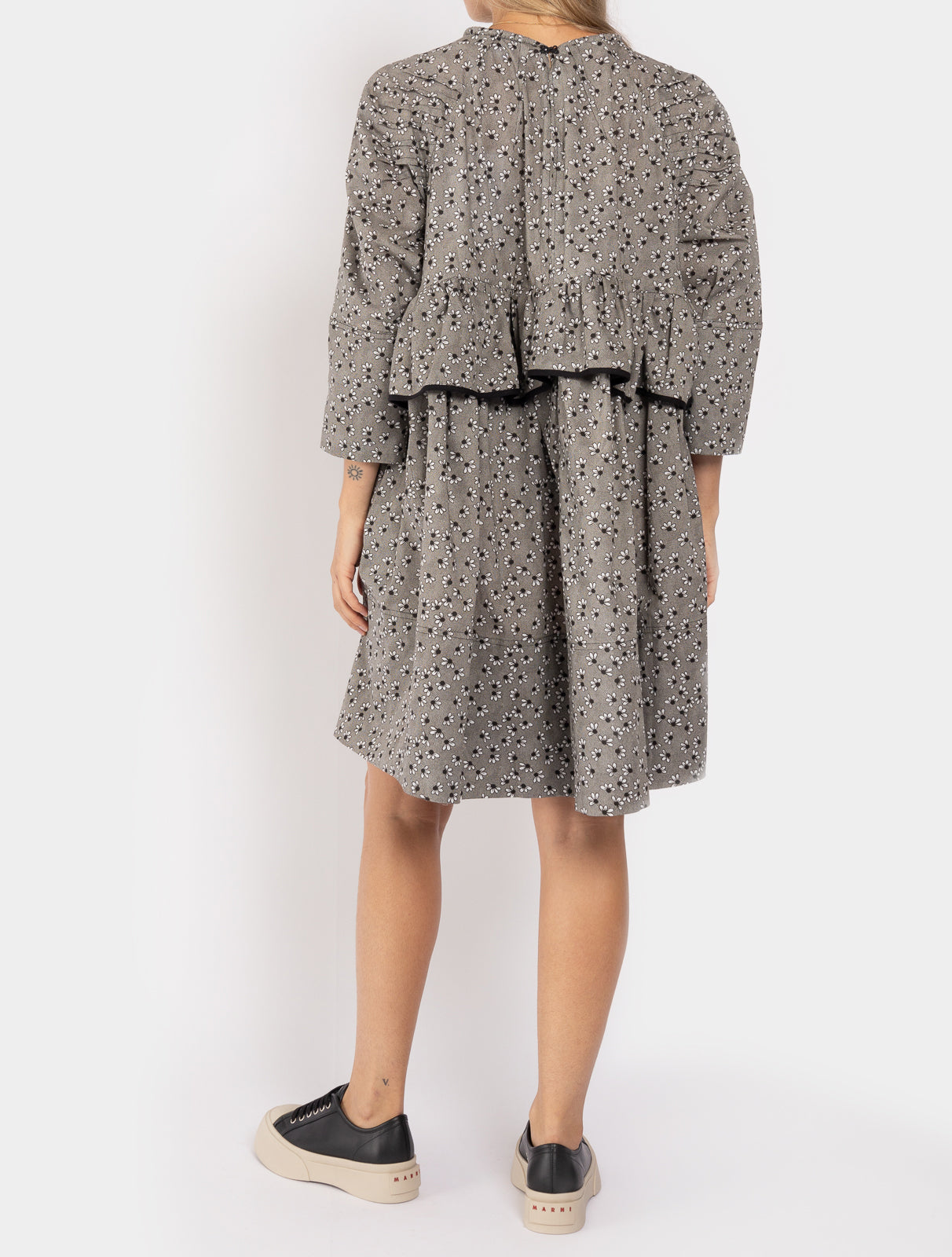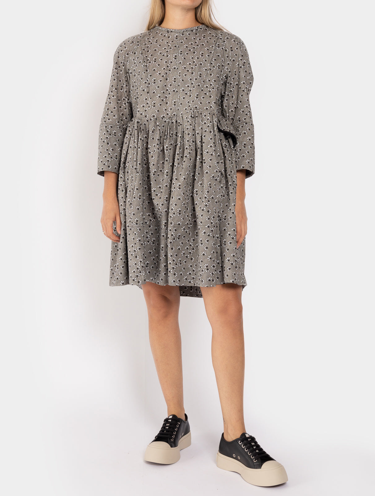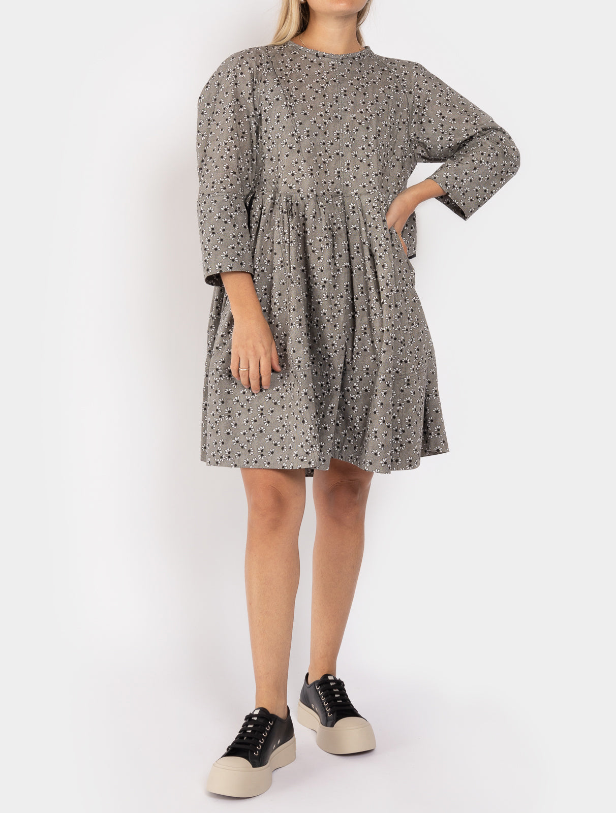 Nackiye dress in light-weight cotton poplin Liberty print fabric, featuring reverse seam detail through-out, three-quarter length sleeves, faux flap side pockets, mini length, dress closes at back with hook and eye fastening.