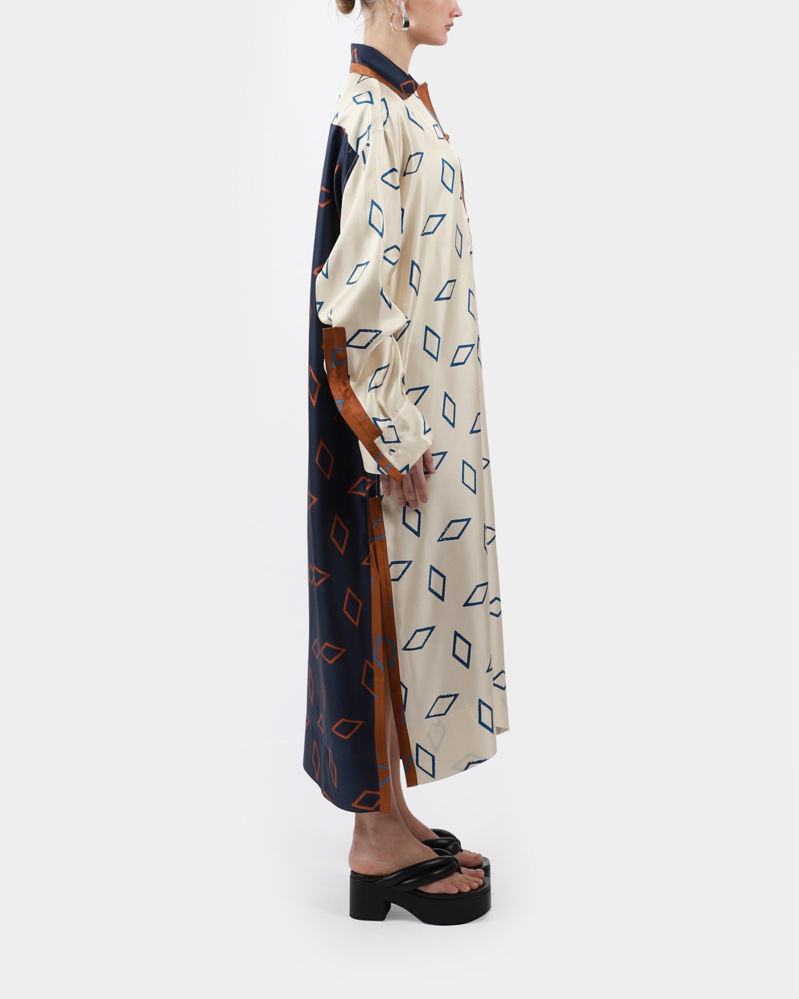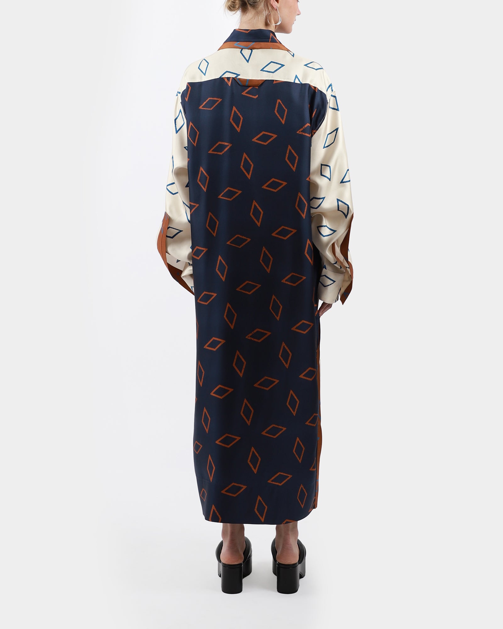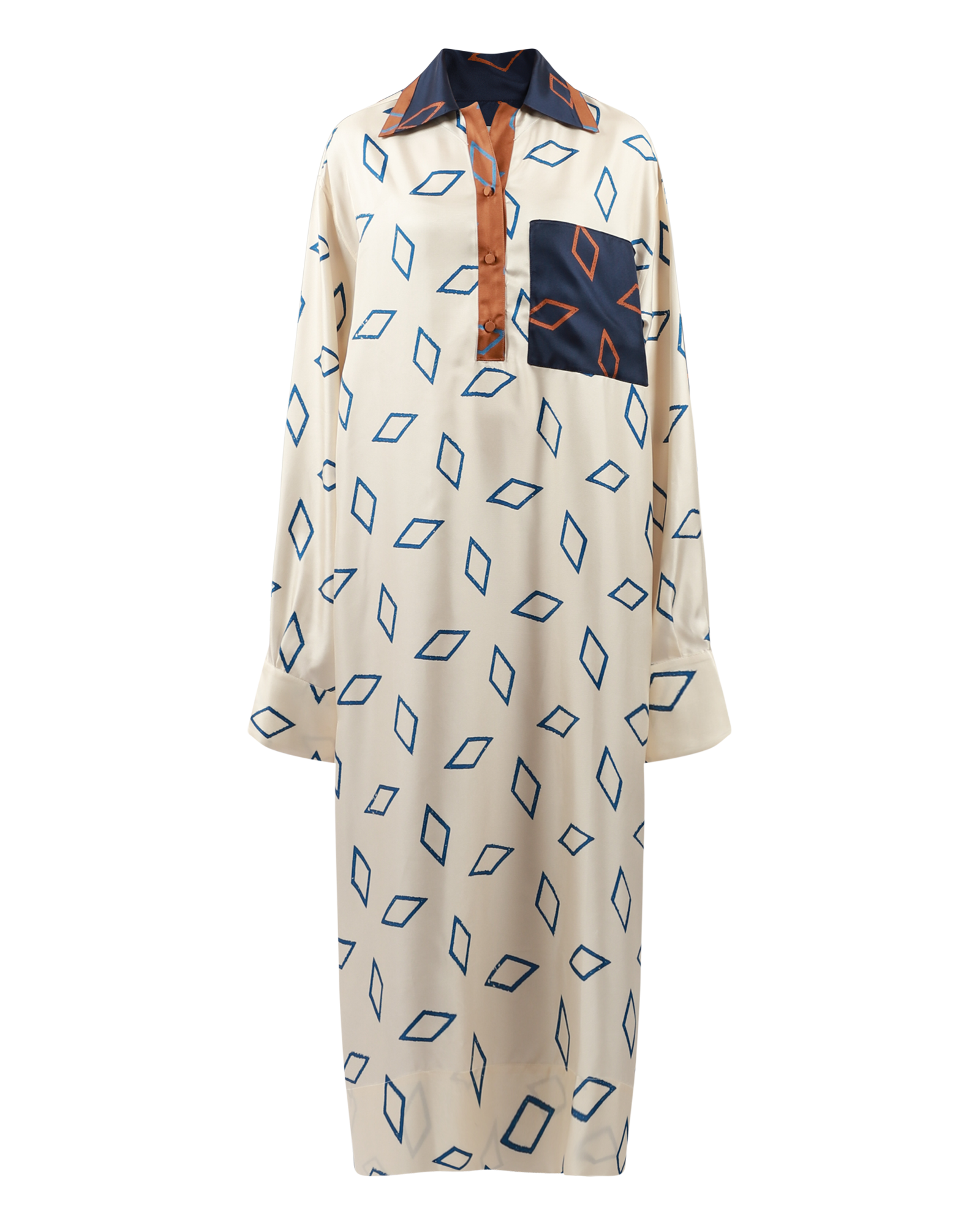 The Giorgia tunic dress, feature a contrast collar with buttons and chest pocket at front, contrast back panel, long wide sleeves with button at cuff, slit at hemline.