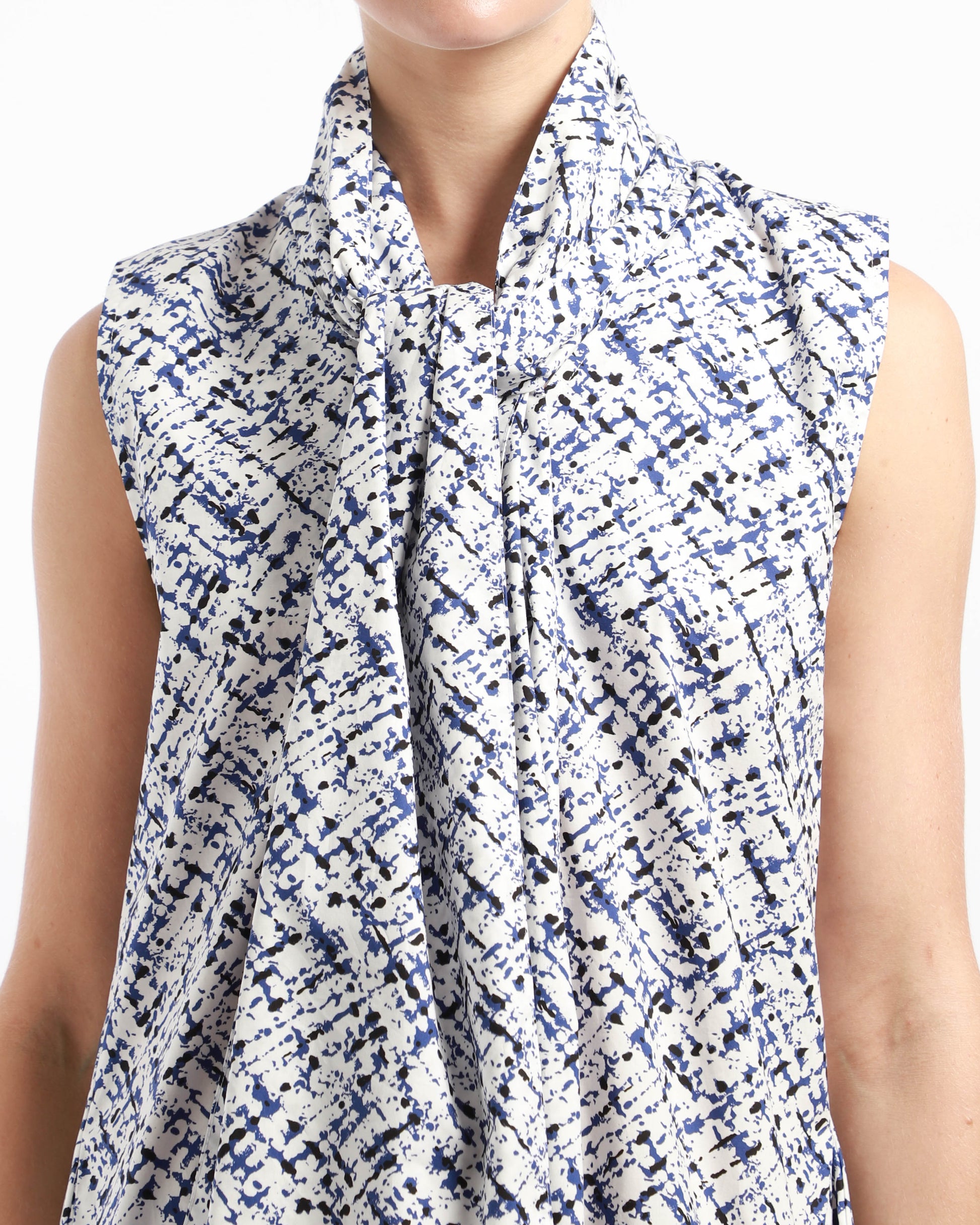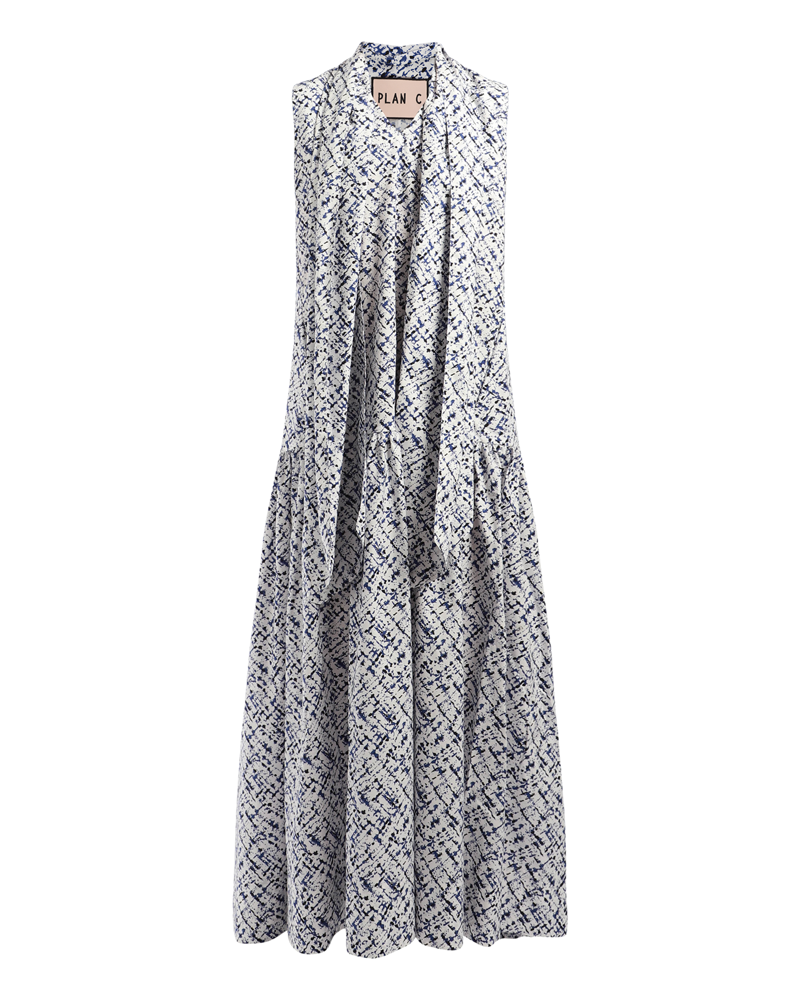 This summery sleeveless long dress offers a slight v-neckline and pleats around the hip line for a voluminous look. The garment has a neck tie, attached with three hidden buttons at the back. The neck tie can be tied in different ways and is detachable which offers versatility.