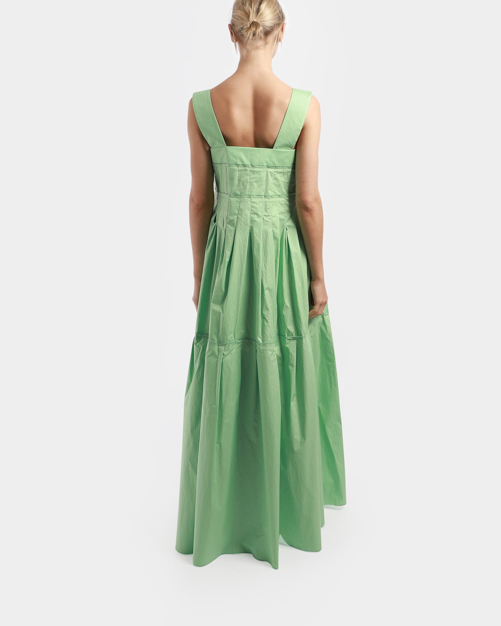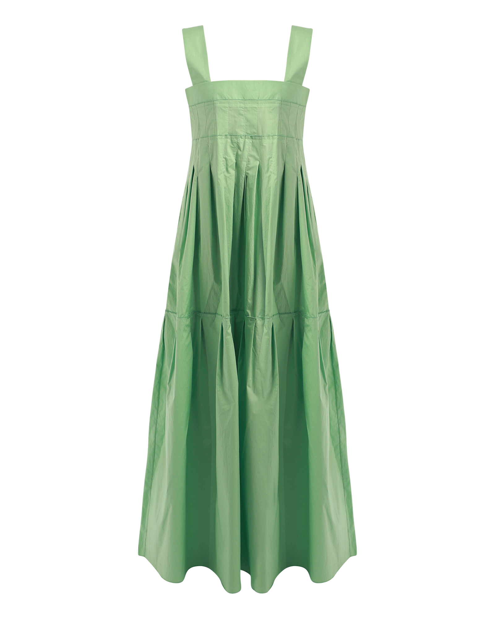 A maxi dress offering a low square neckline with thick straps. The garment has a relaxed fitting, with pleats details from waistline. This maxi dress features side pockets and lightweight fabric. Made in Italy.