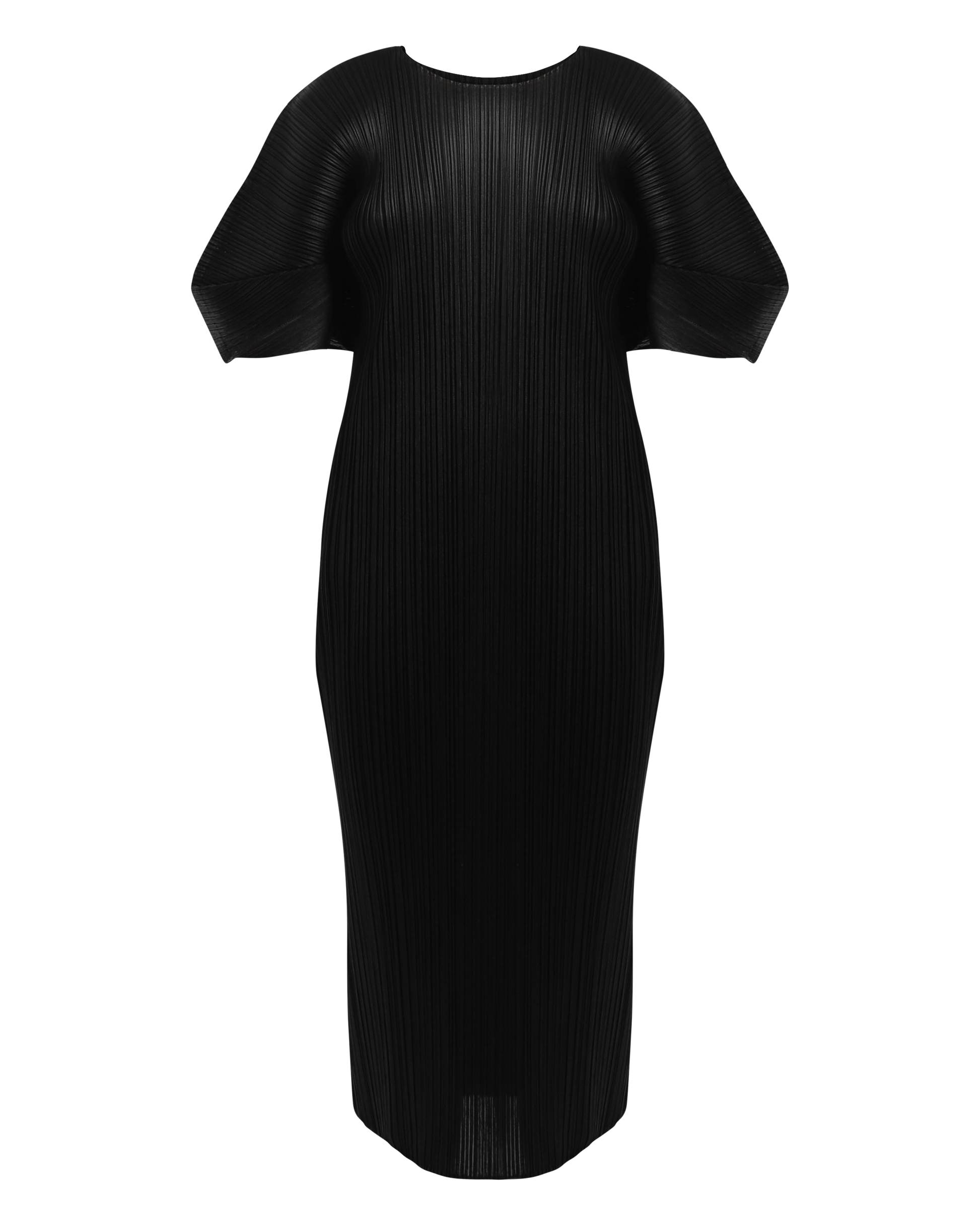 This dress features structured balloon sleeves, tapering through the lower body to a hem just below the knee. Made in Japan from fully pleated, ultra-stretchy fabric.