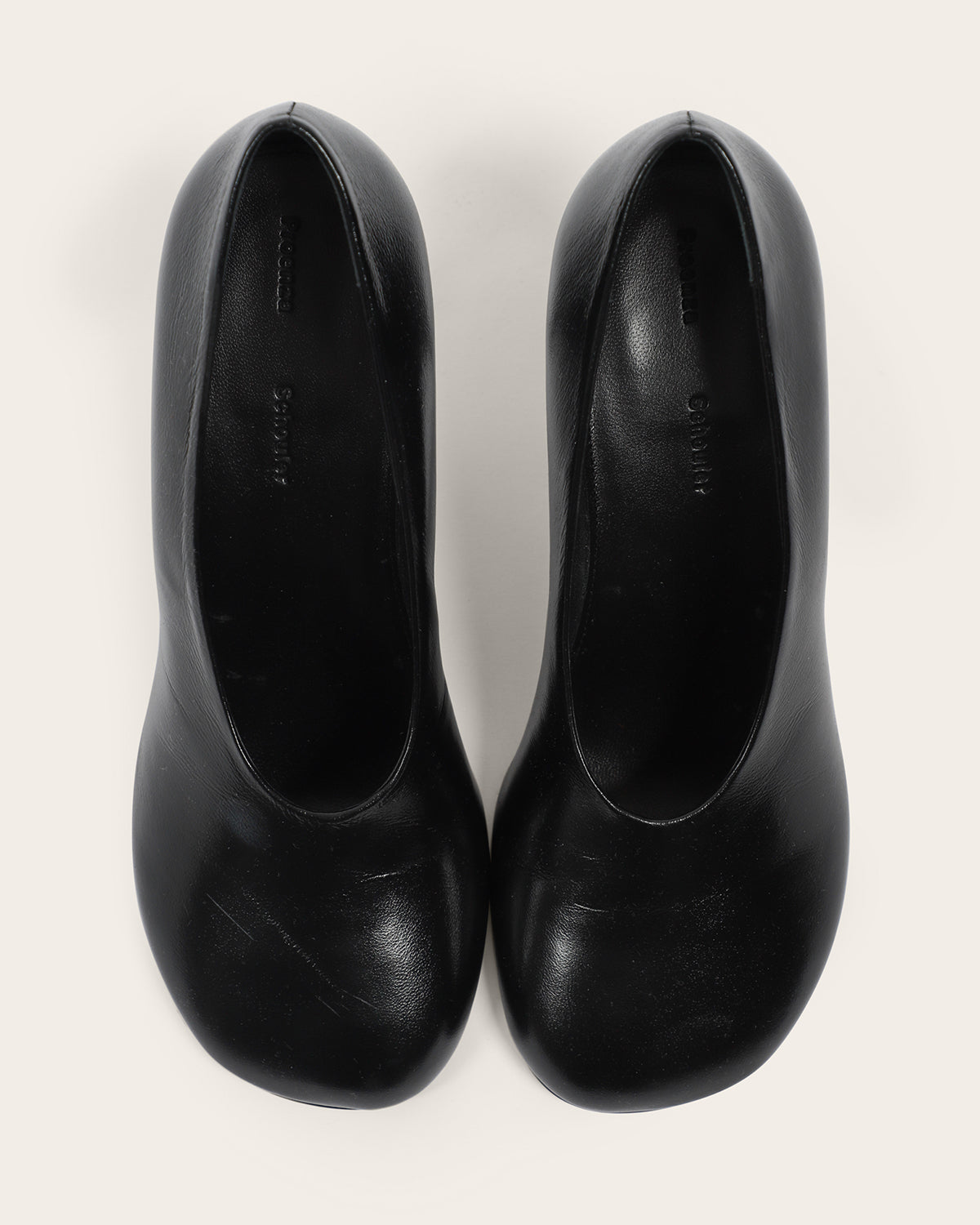 The Glove Heels feature glossy leather and a molded shape, set atop a sculptural cone heel.