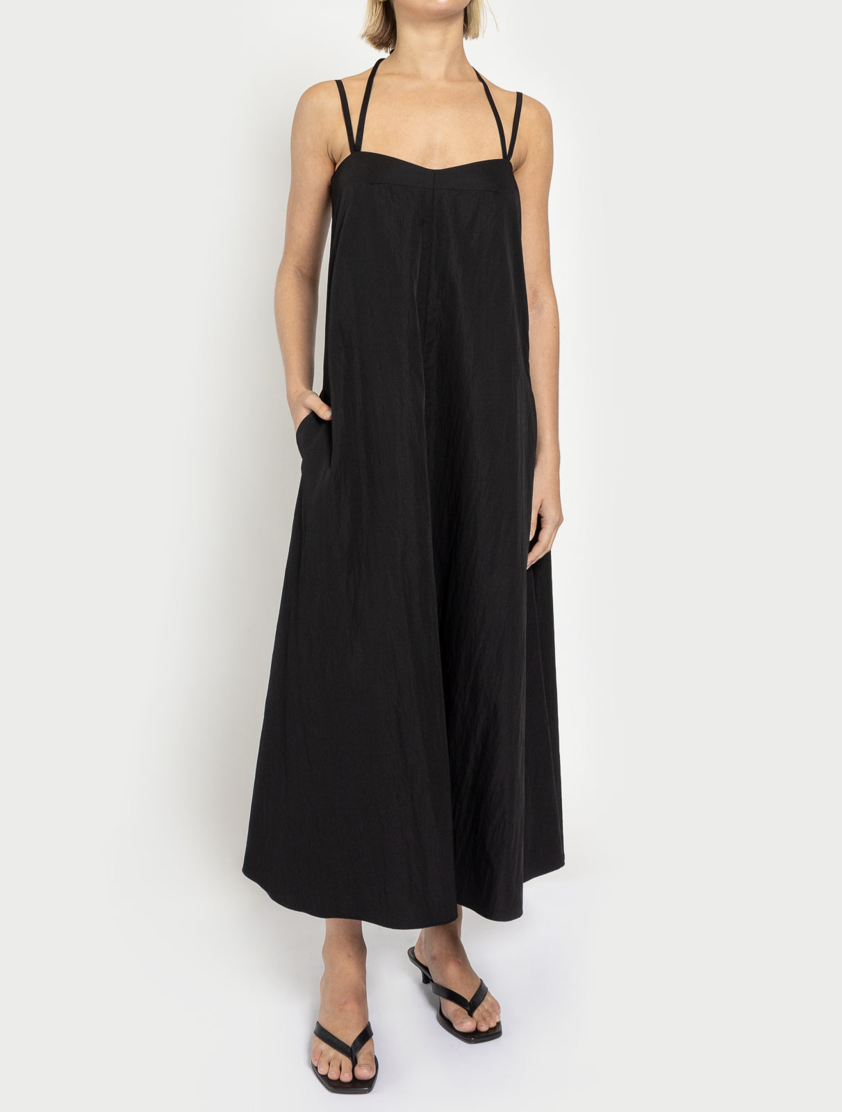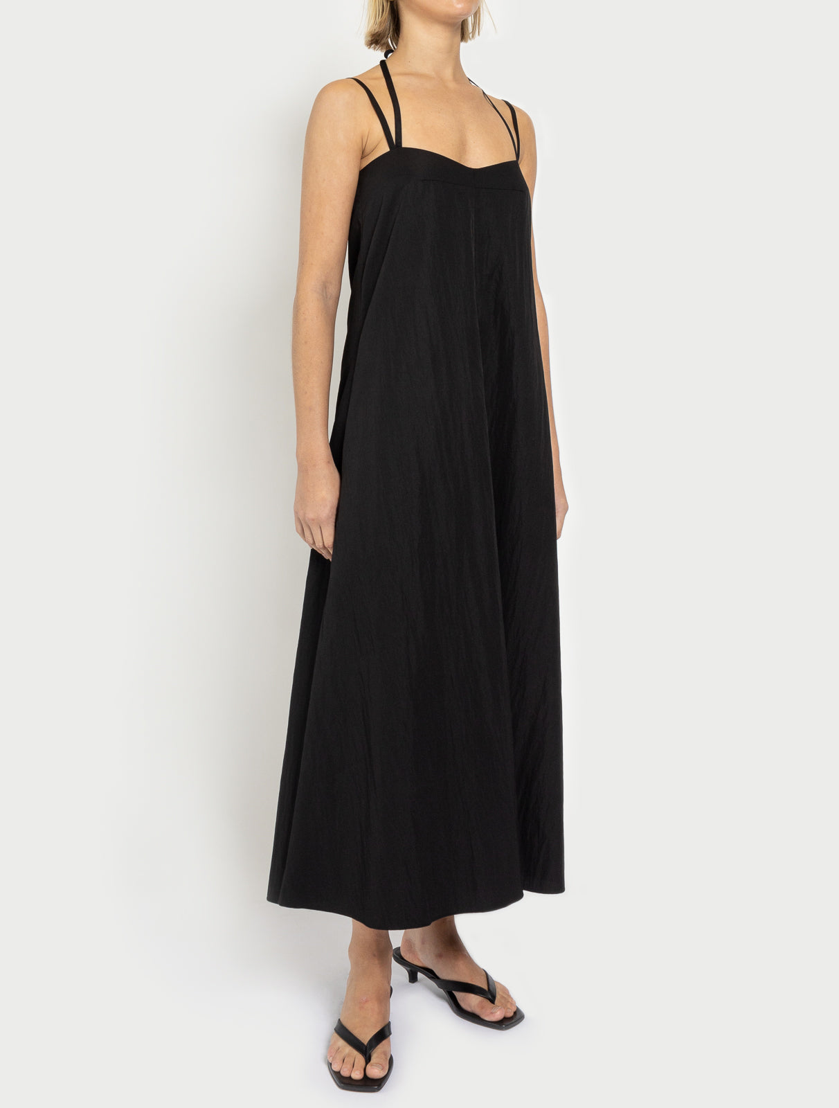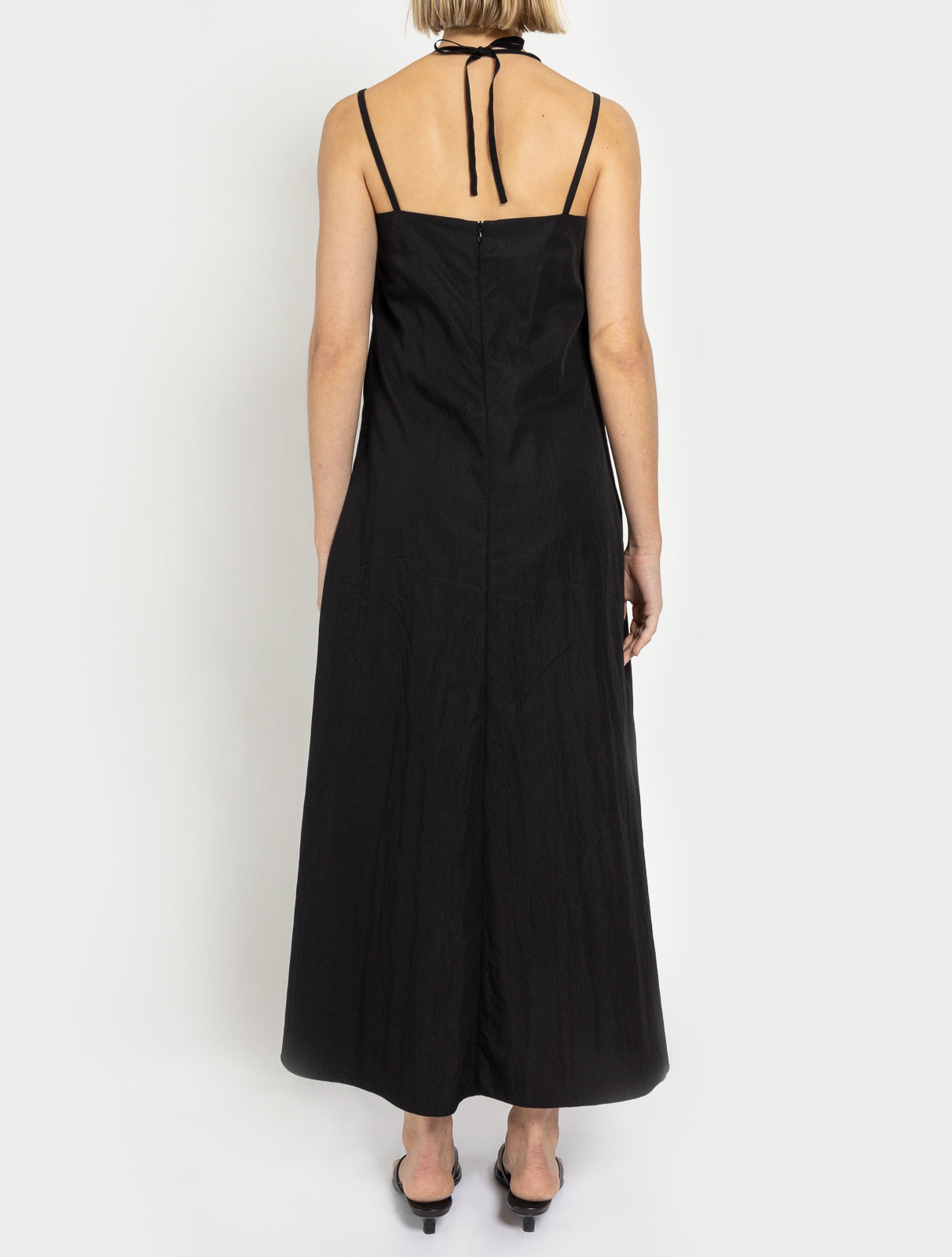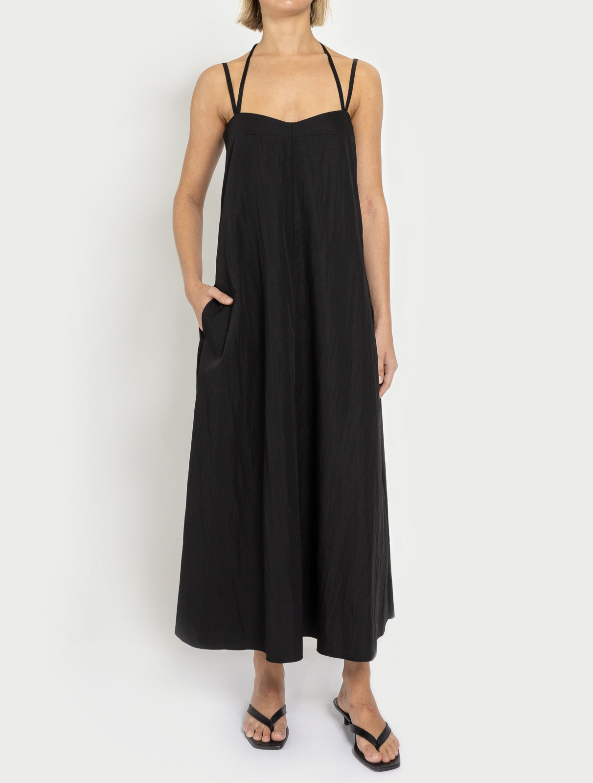 Sara Lanzi midi length multi-strap dress in viscose blend fabric with slight luster, featuring a sweetheart neckline and fitted bust, full silhouette from bust down, side seam pockets, tie halter straps, dress simply pulls on.