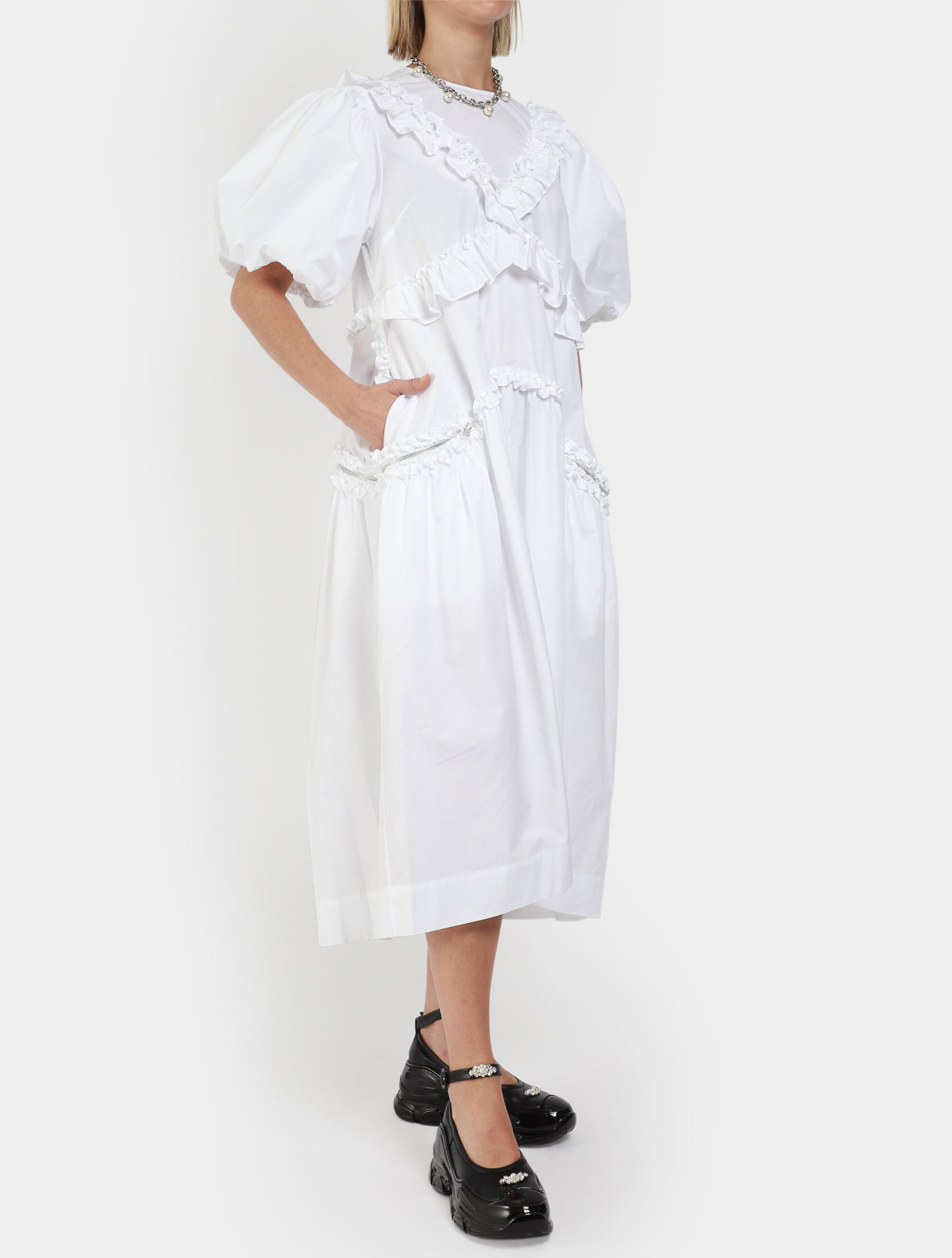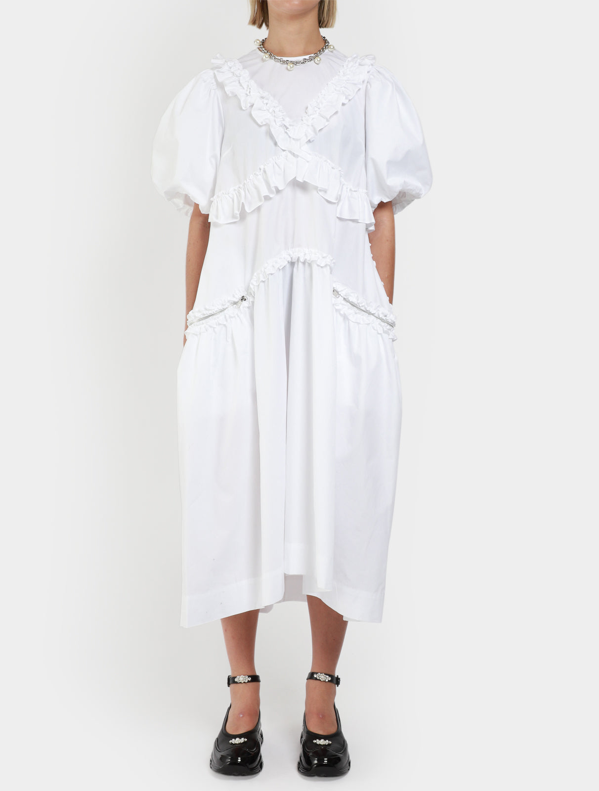 Simone Rocha cotton poplin fabric, featuring fitted shoulders, higher neckline, exaggerated puff short sleeves, loose full fit from waist with gathered ruffle detail on bodice and waist, exposed zip seam that zips to become pocket, dress secured with invisible zip back.