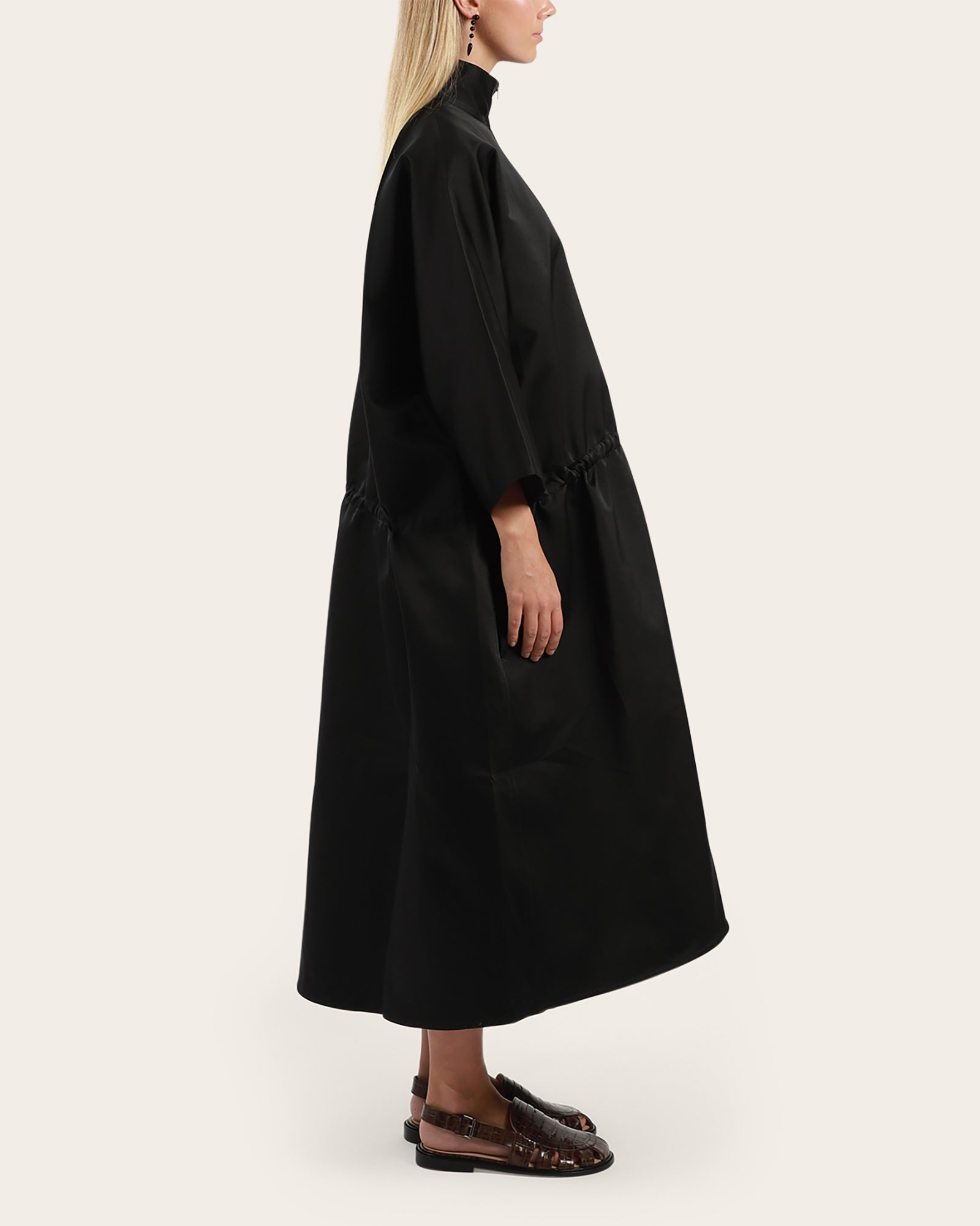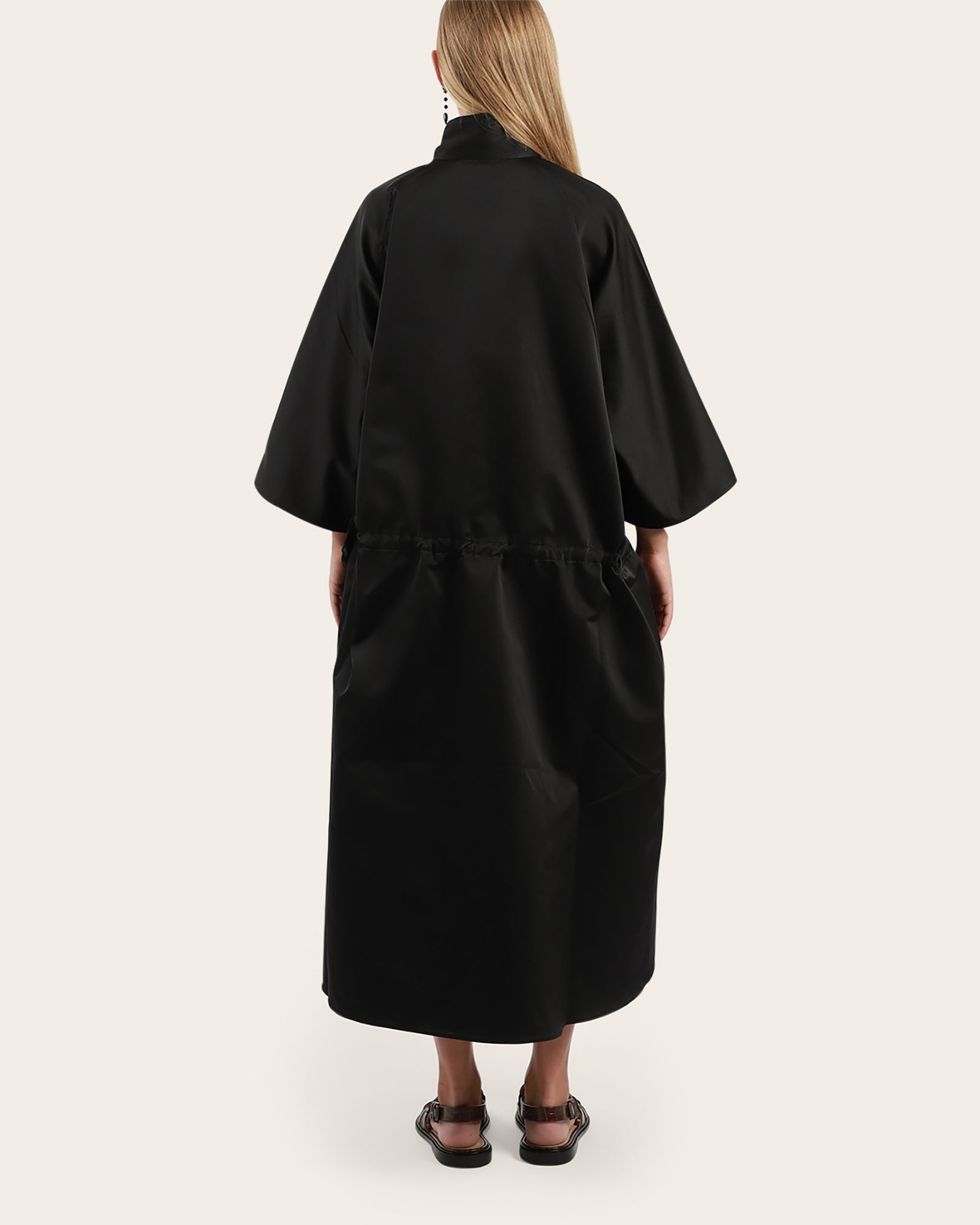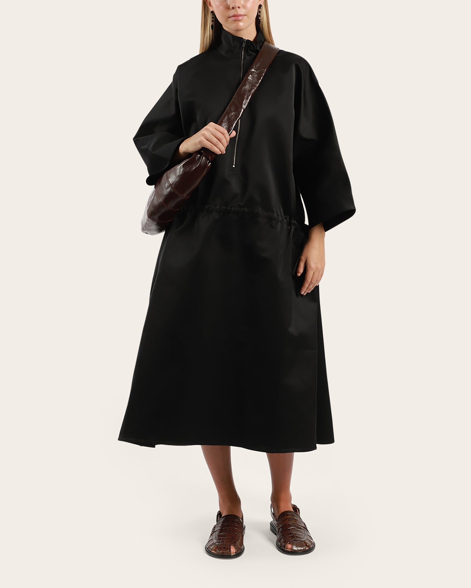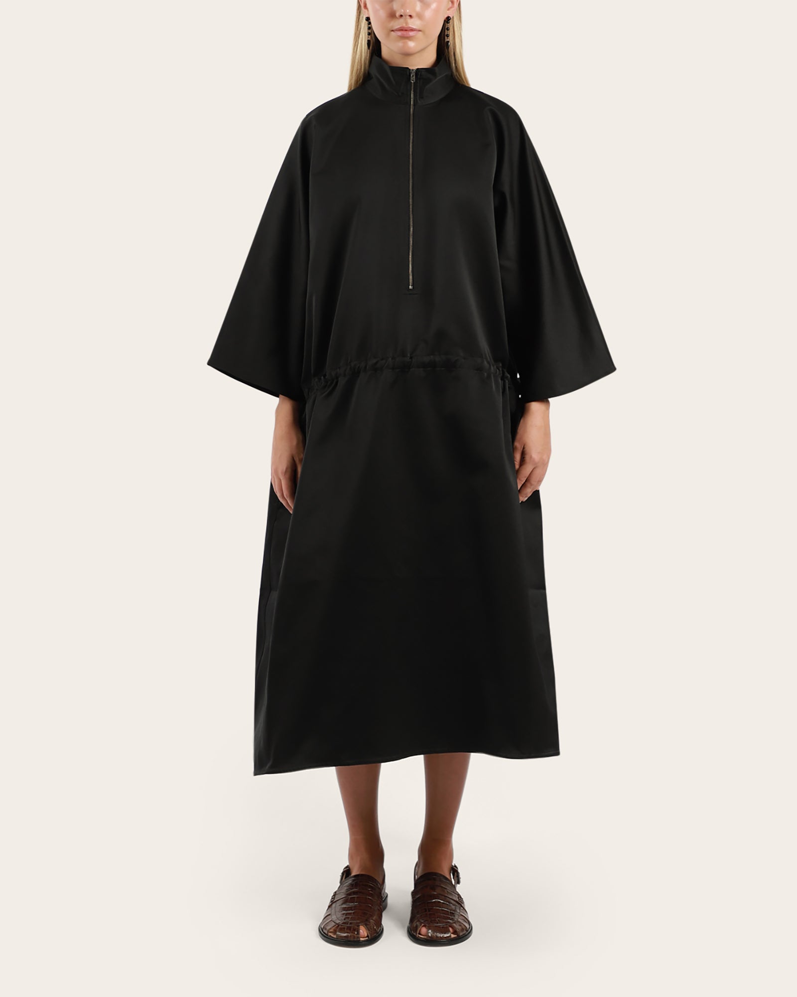 An oversized dress, featuring a high neckline with zip half way, long wide sleeves, slightly a-line shape, drawcord at hip line to tie, side pockets with a midi length silhouette.