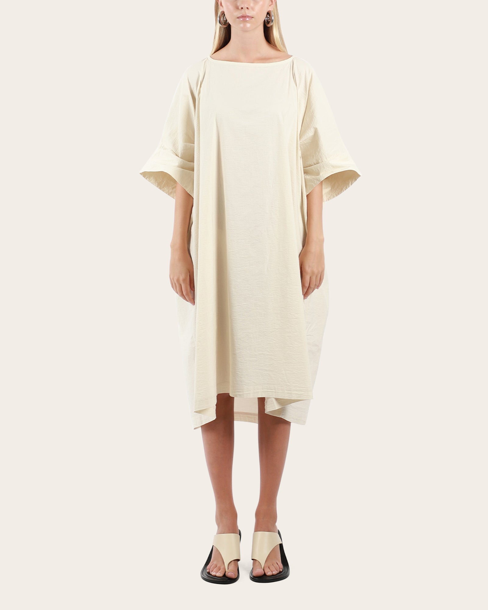 This oversized dress, feature boat neckline, dropped shoulder short sleeves, offering an oversized fit for a relaxed silhouette.