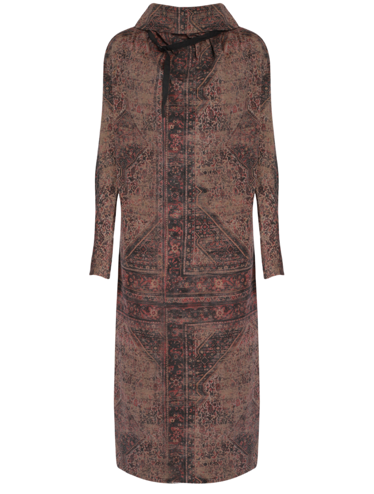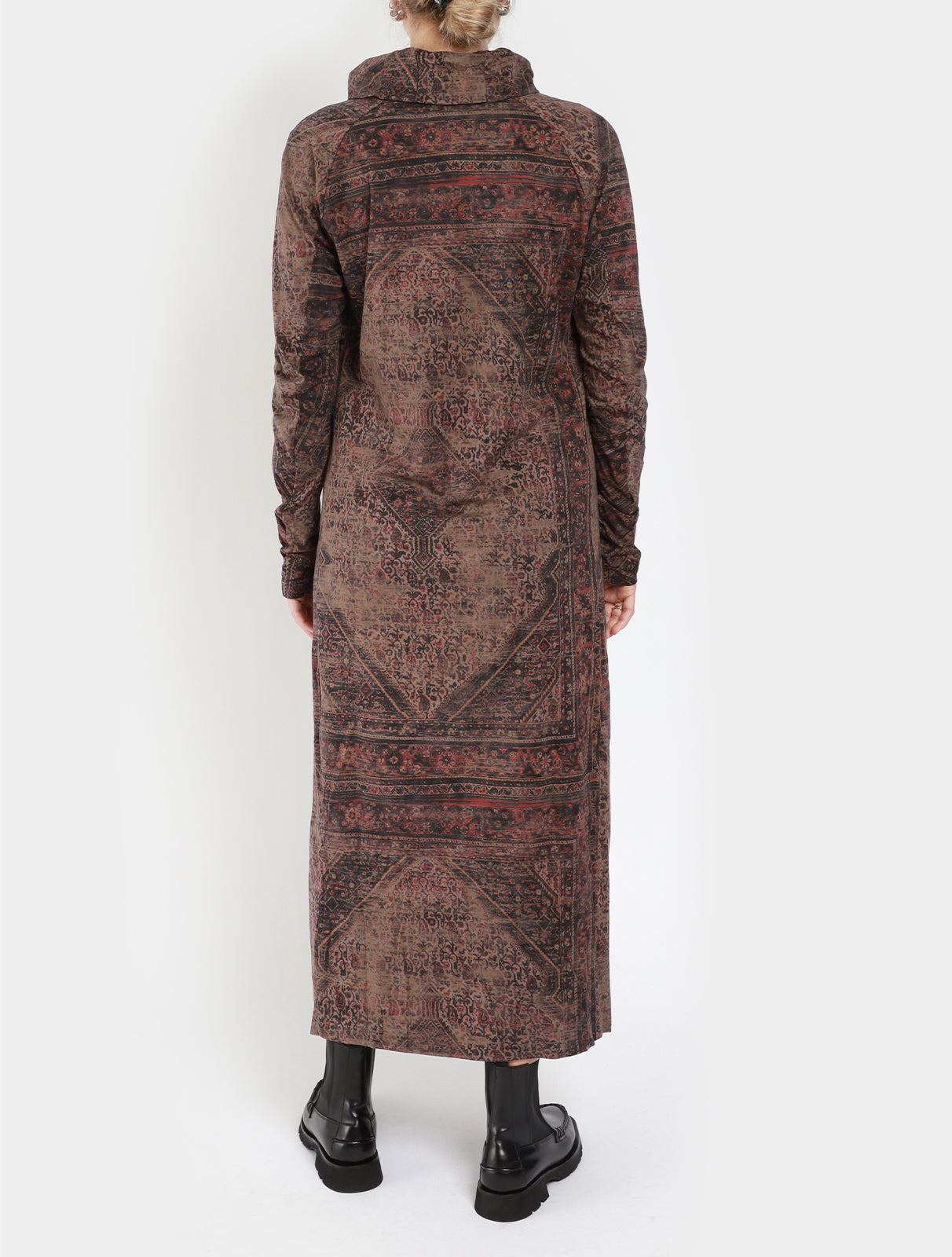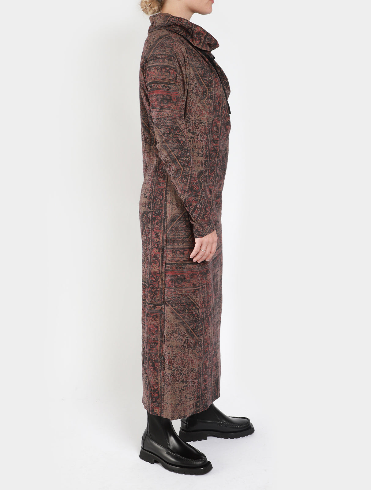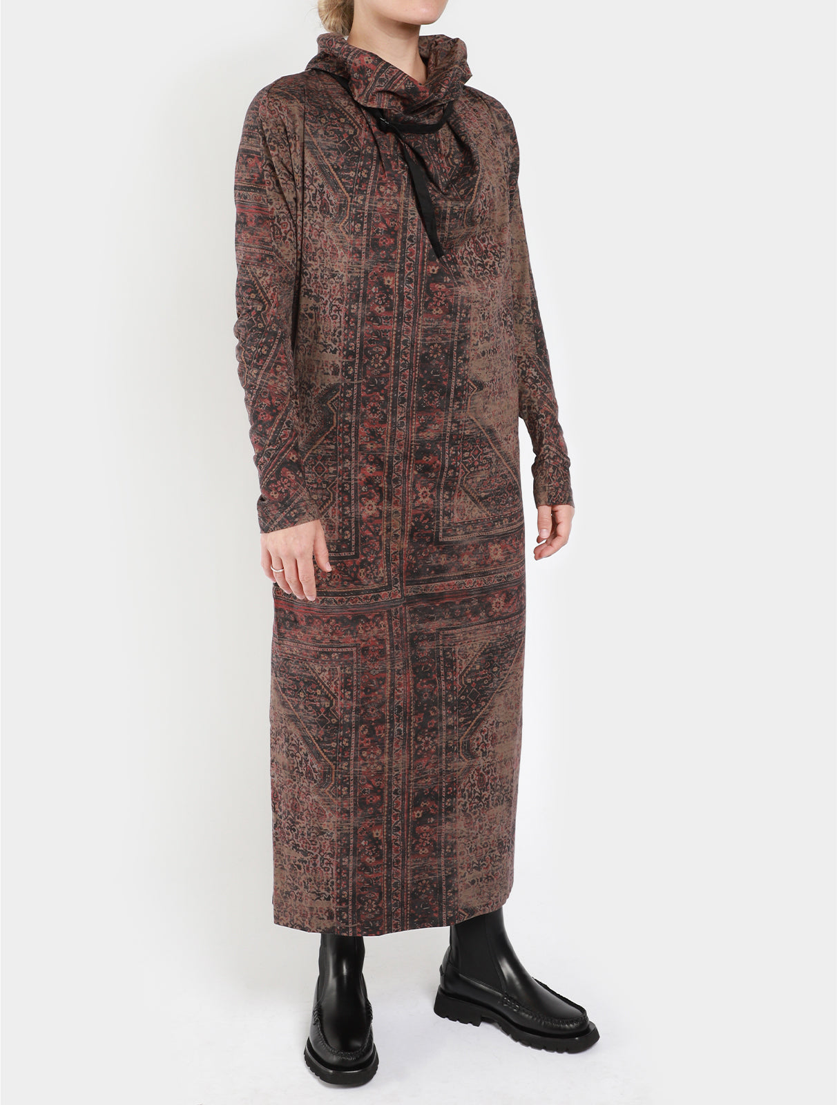 Studio Rundholz maxi dress in print cotton jersey fabric, featuring an oversize boxy fit, slim sleeves, extra long funnel neck, adjustable front neck ribbon detail, dress simply pulls on.