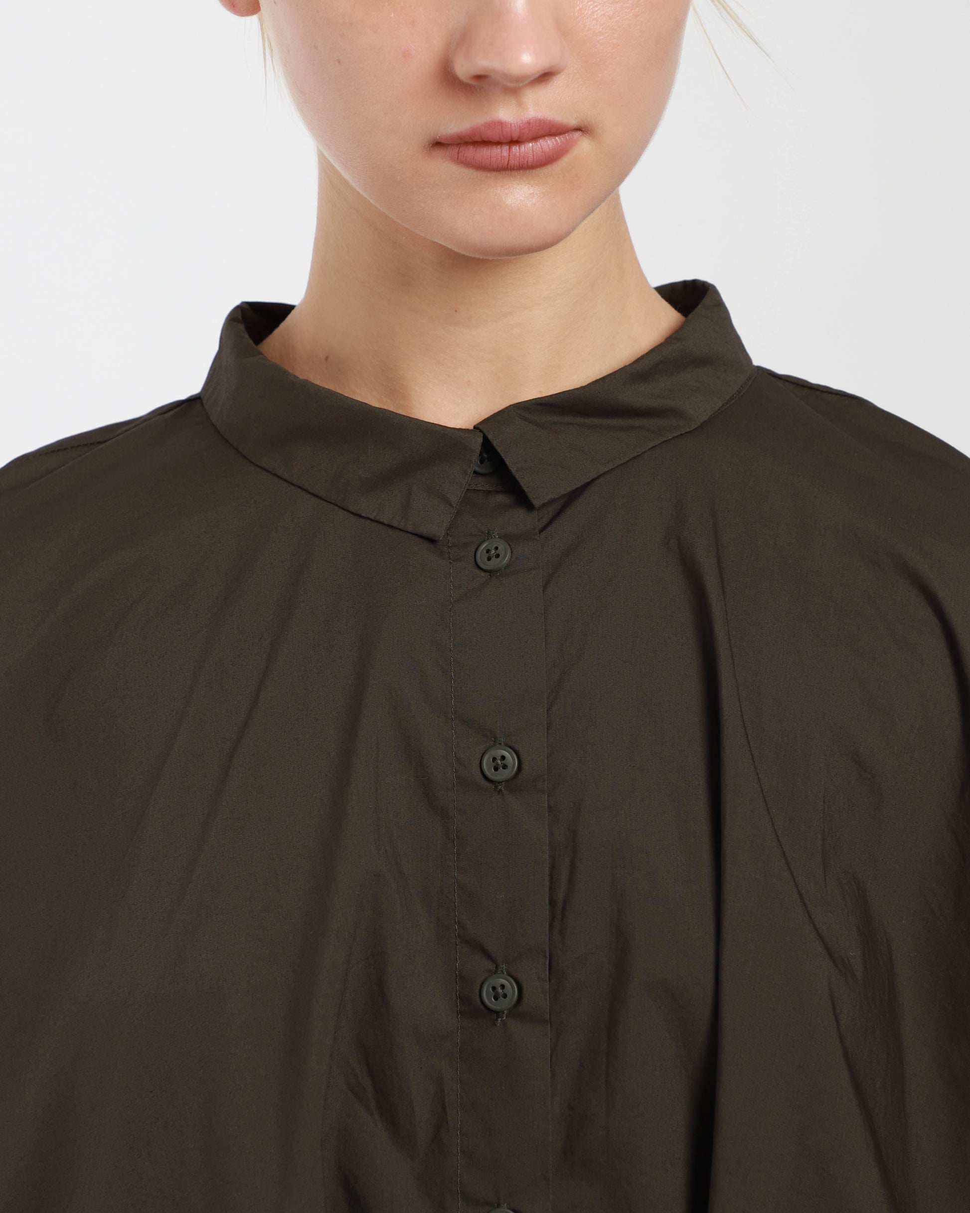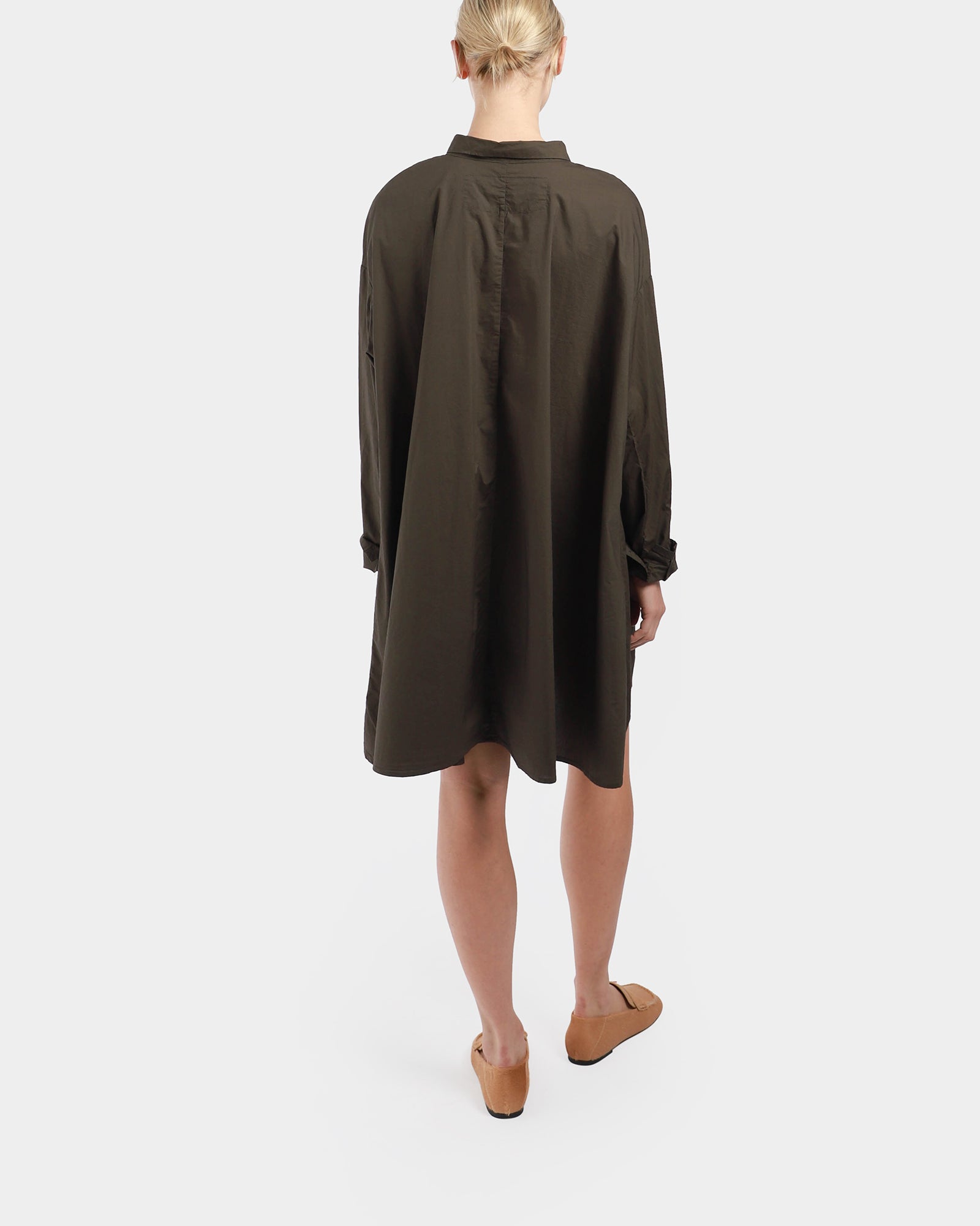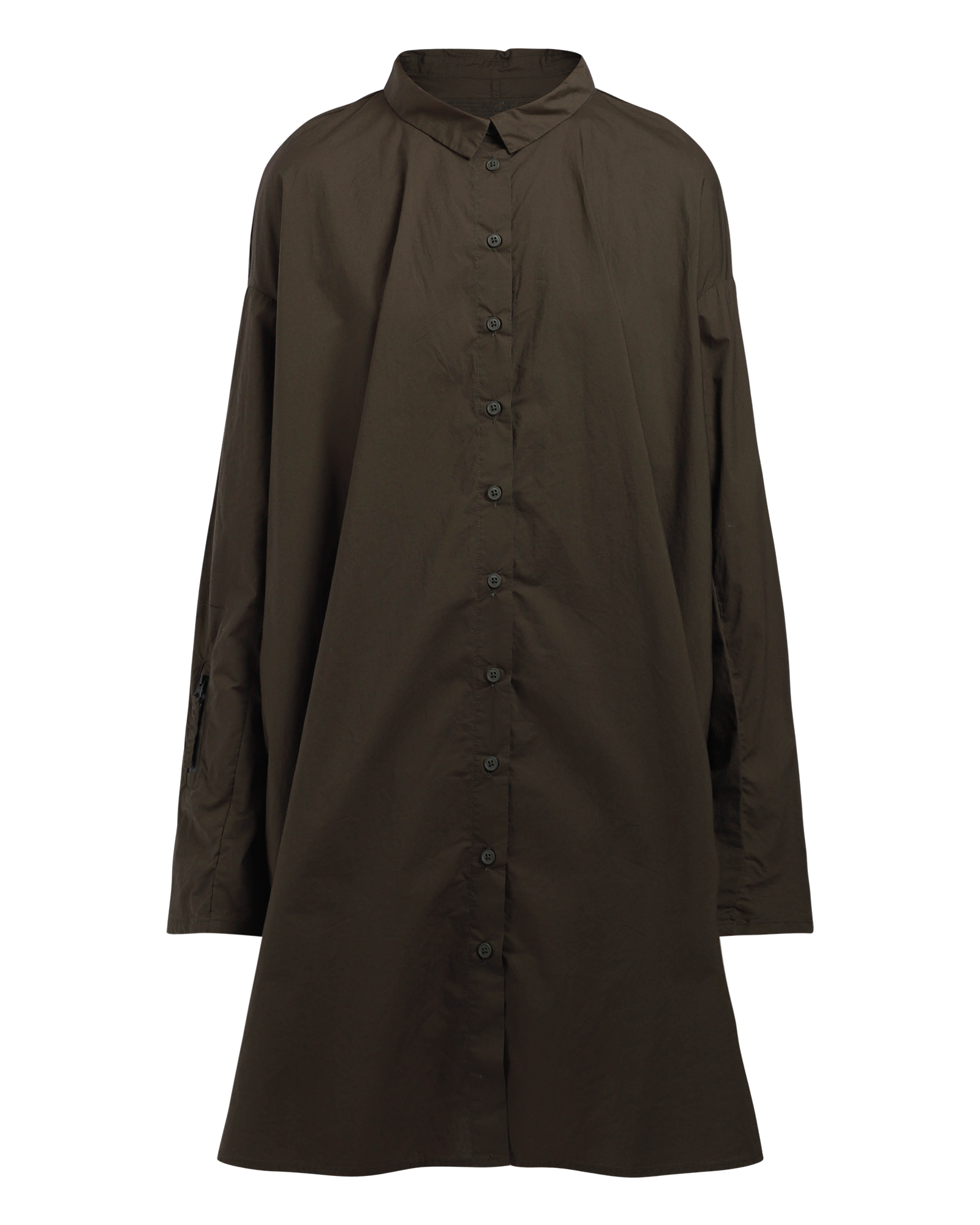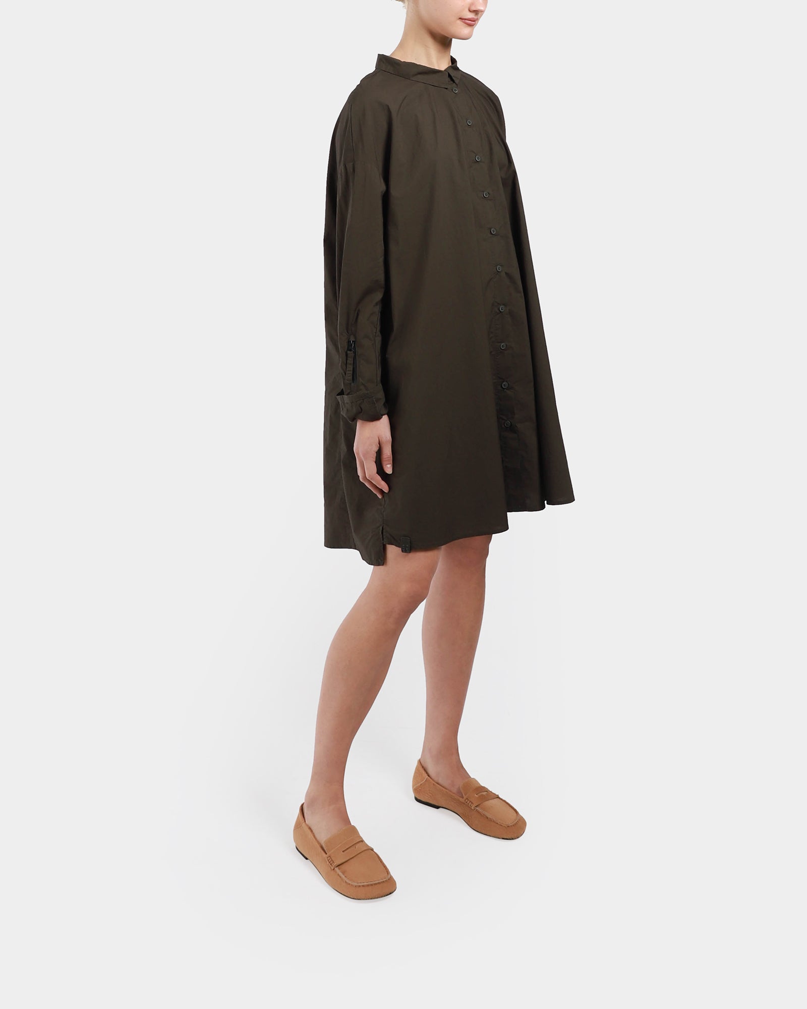 A shirt dress, featuring a collar, long sleeves with zip at cuff, above the knee length, side pockets and buttons all the way down to close.