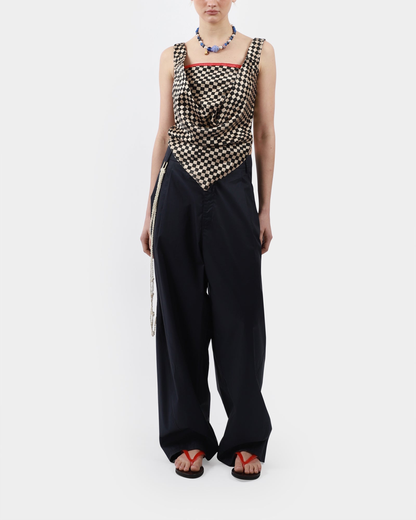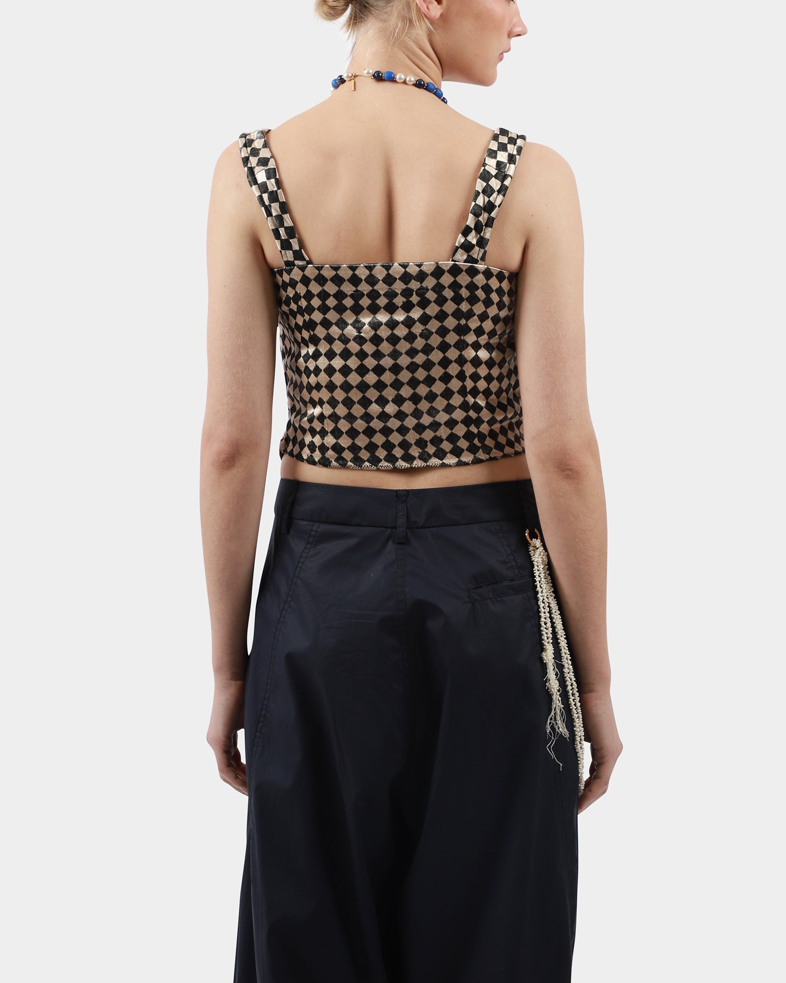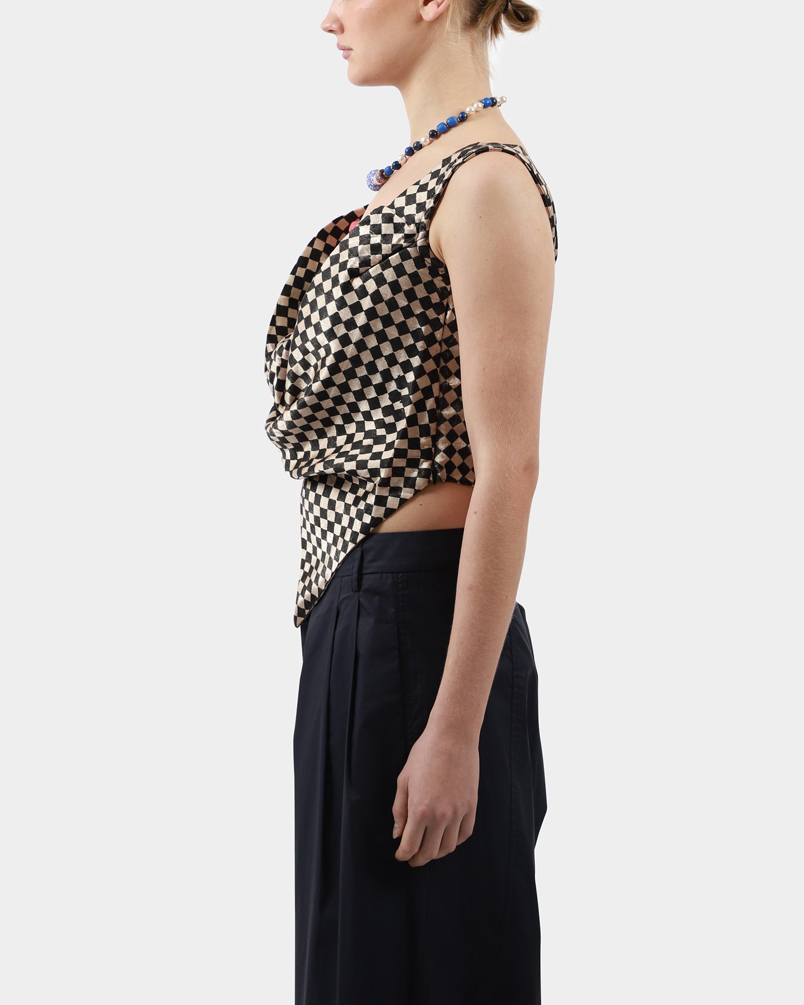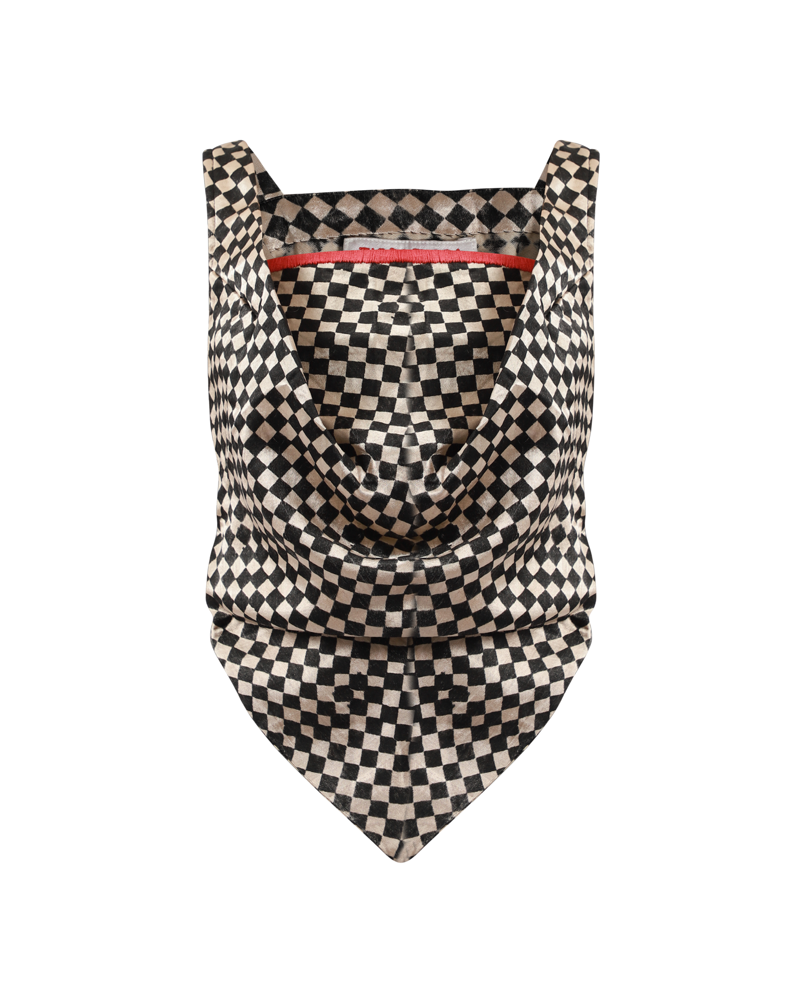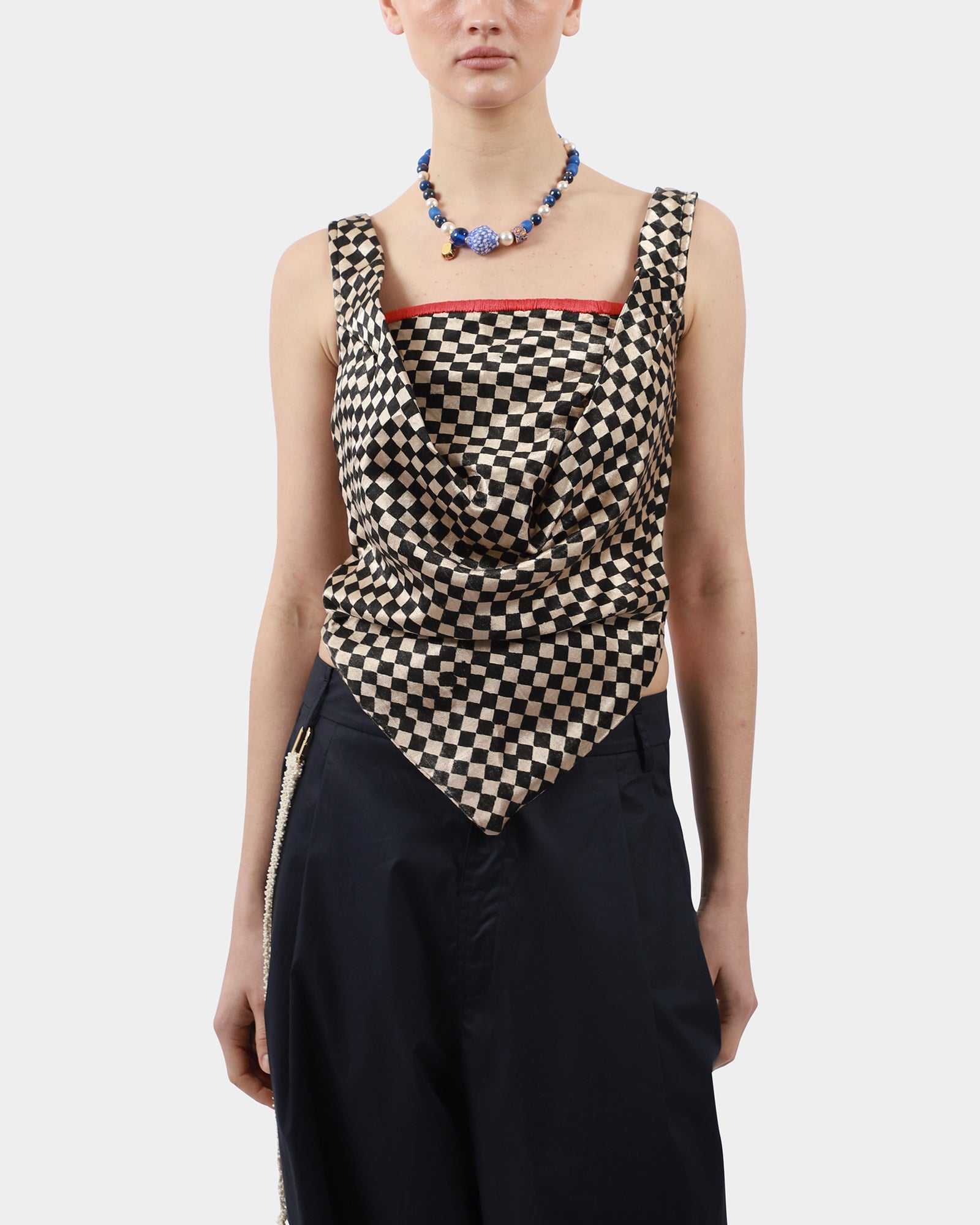 This draped checker top, made from silk mashroo, features hand-embroidered stitch detail along the square neckline, large straps, drapes at front with a v-cut. Handmade in India.