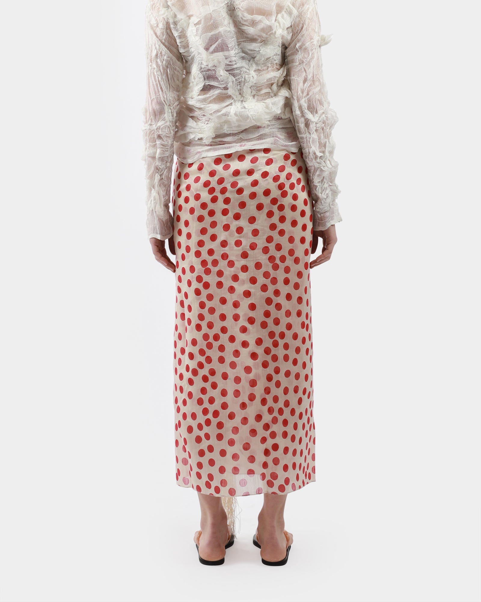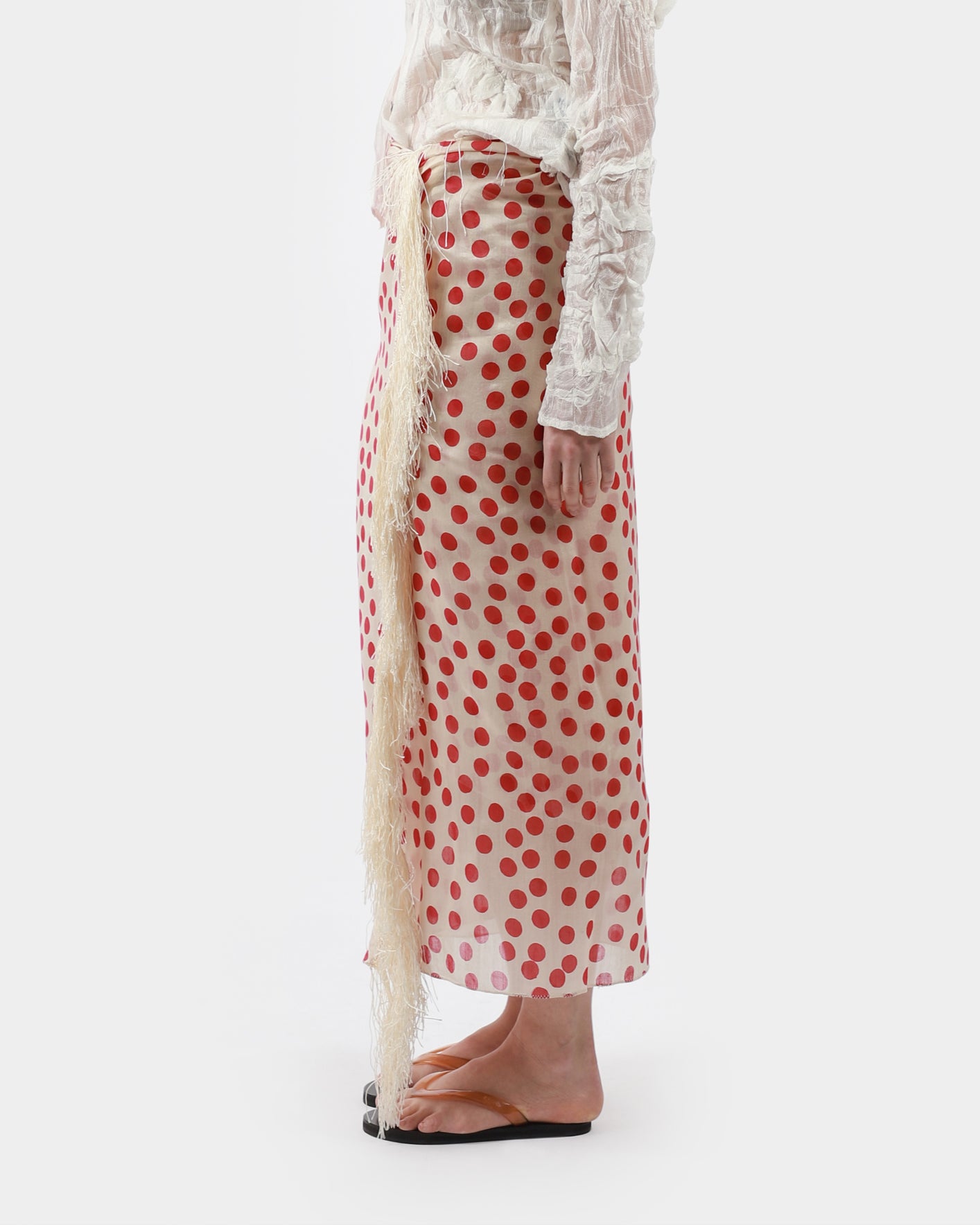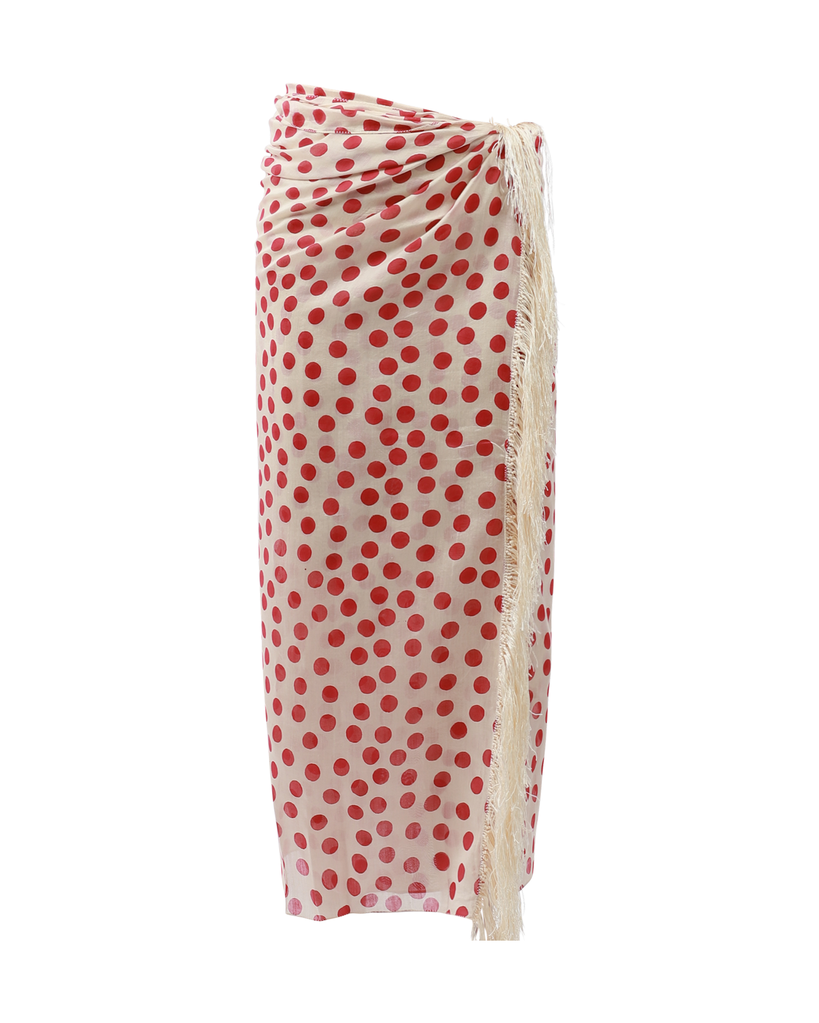 This lightweight shawl, delicately hand-woven in silk chanderi, features hand-block printing, red dots, embellished with a cream silk fringe on one side.
