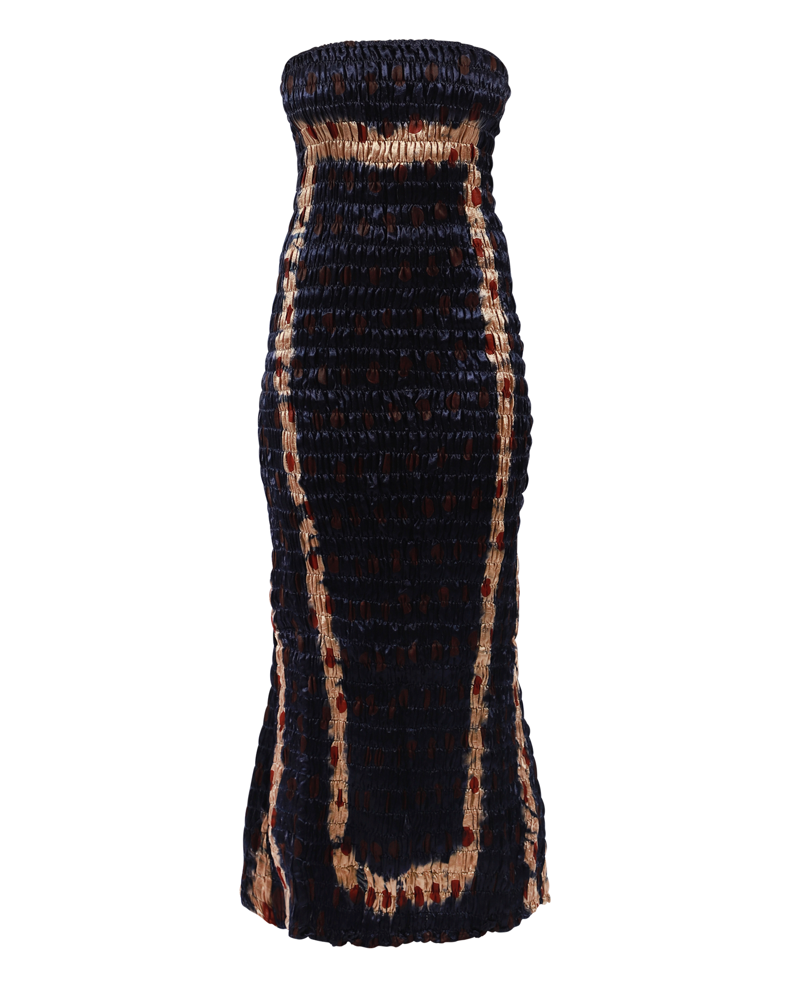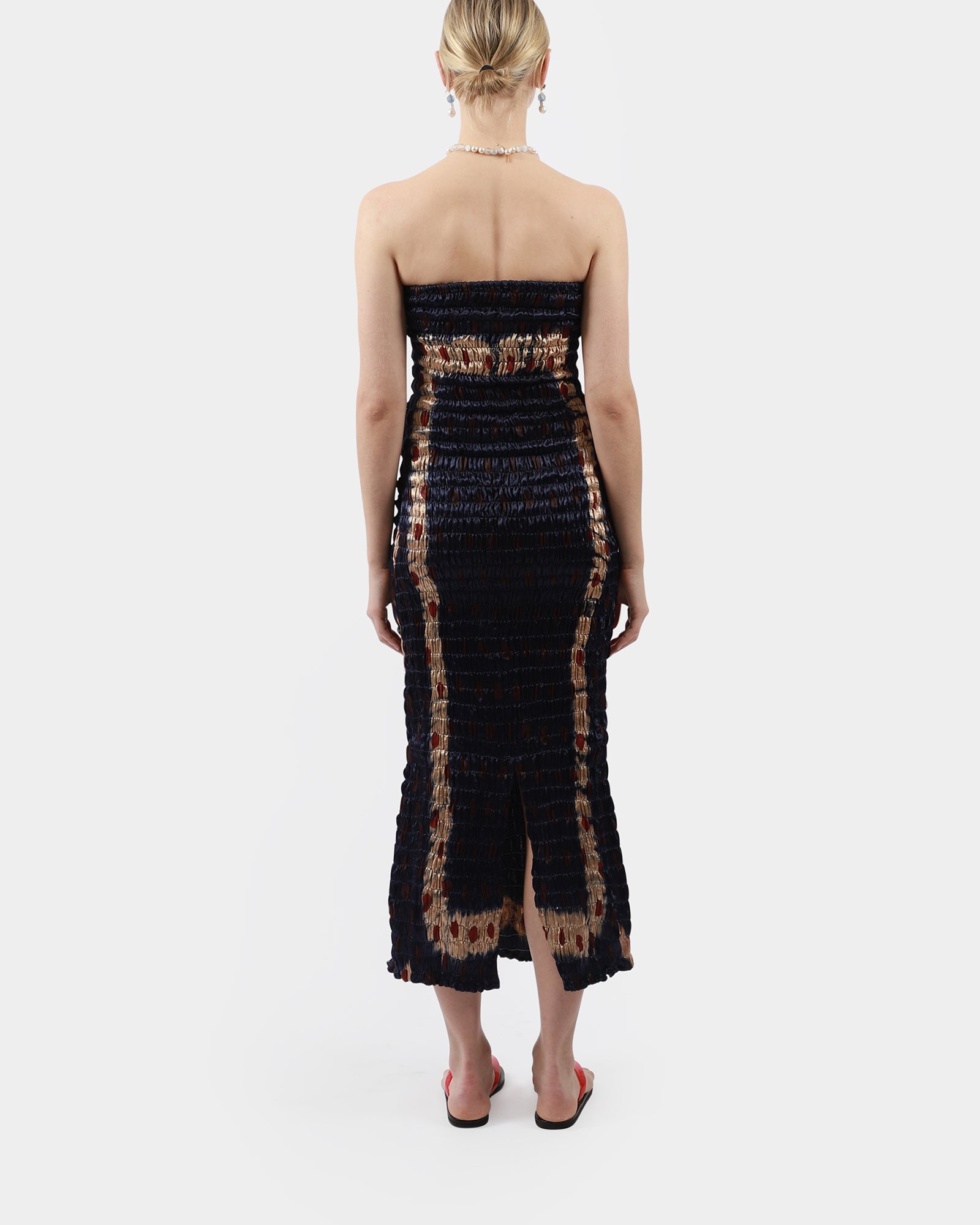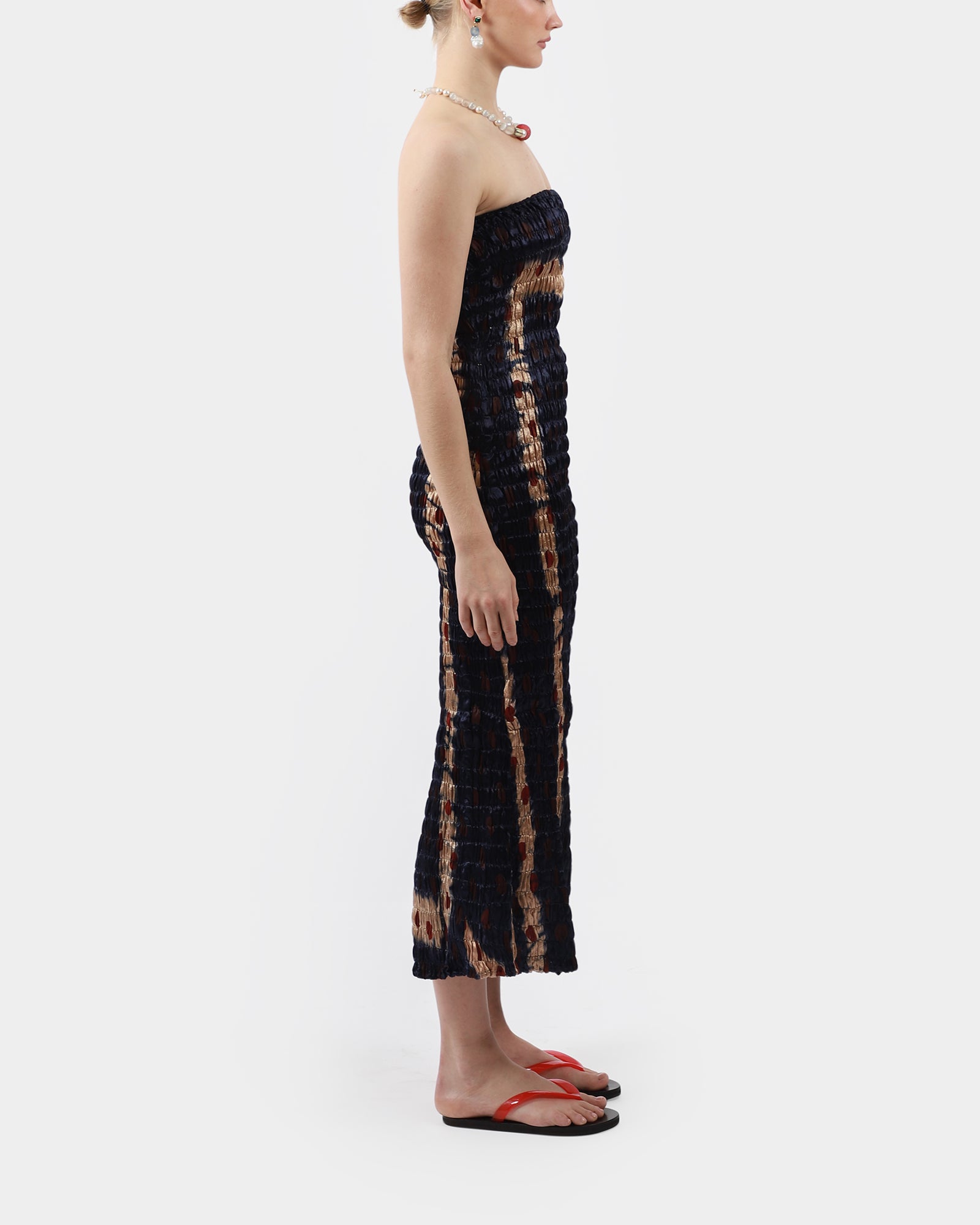 This dress made of gathered silk mashroo patchworked into shibori. It features clamp dye and block prints and has elastic components to make it slightly stretchy and easy to put on. It is versatile and can be worn as a strapless dress or maxi skirt.