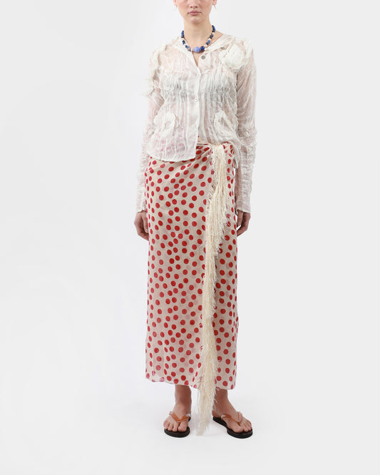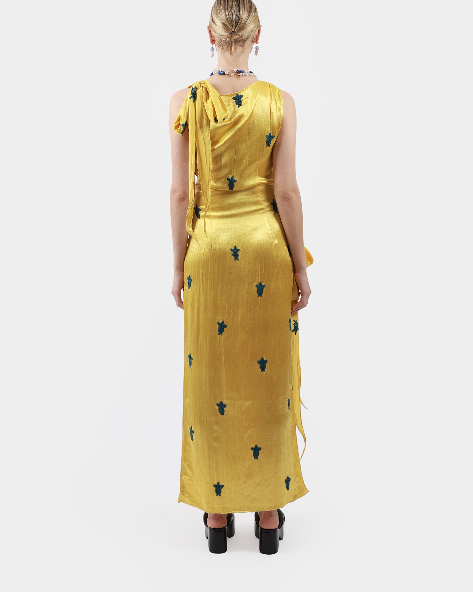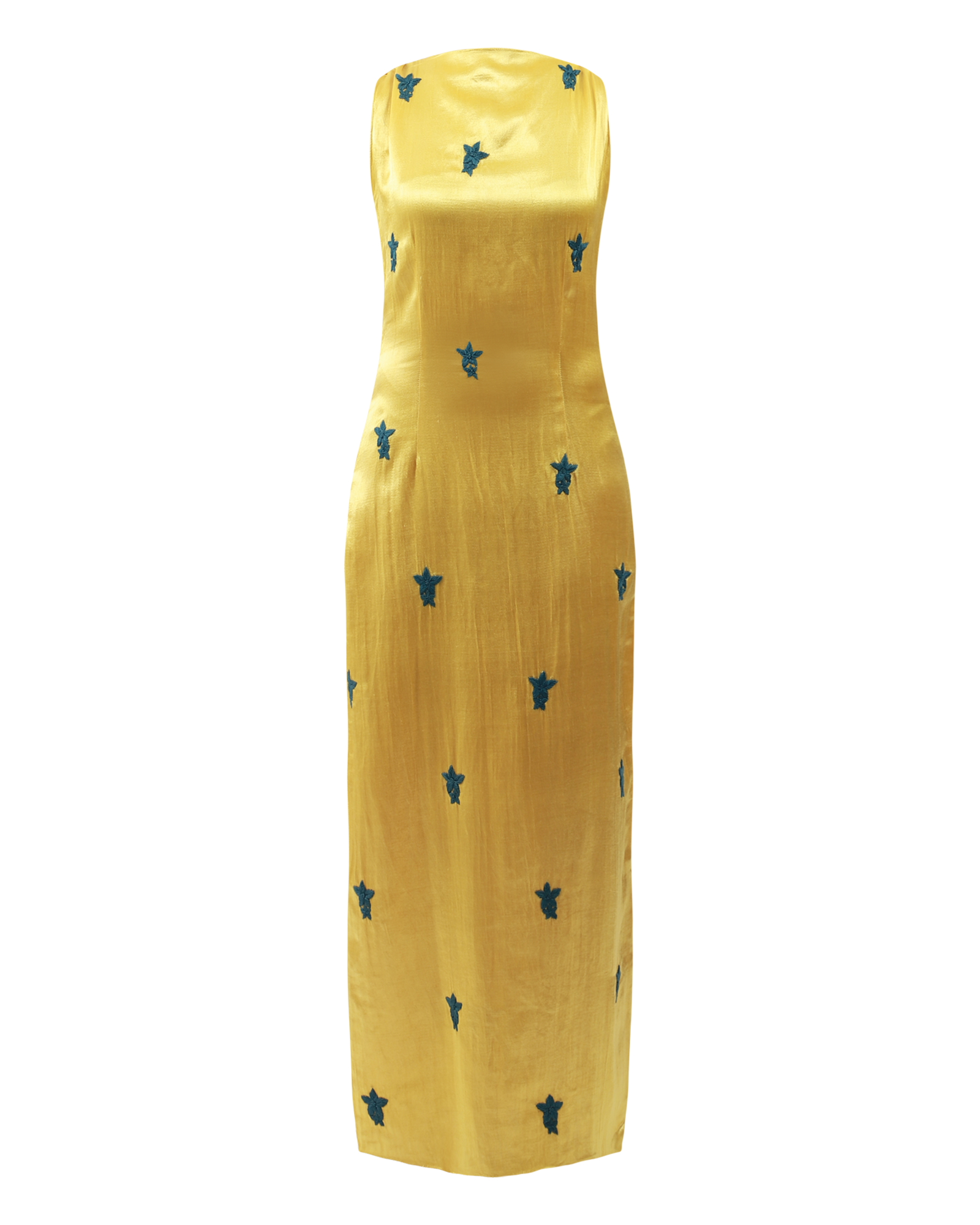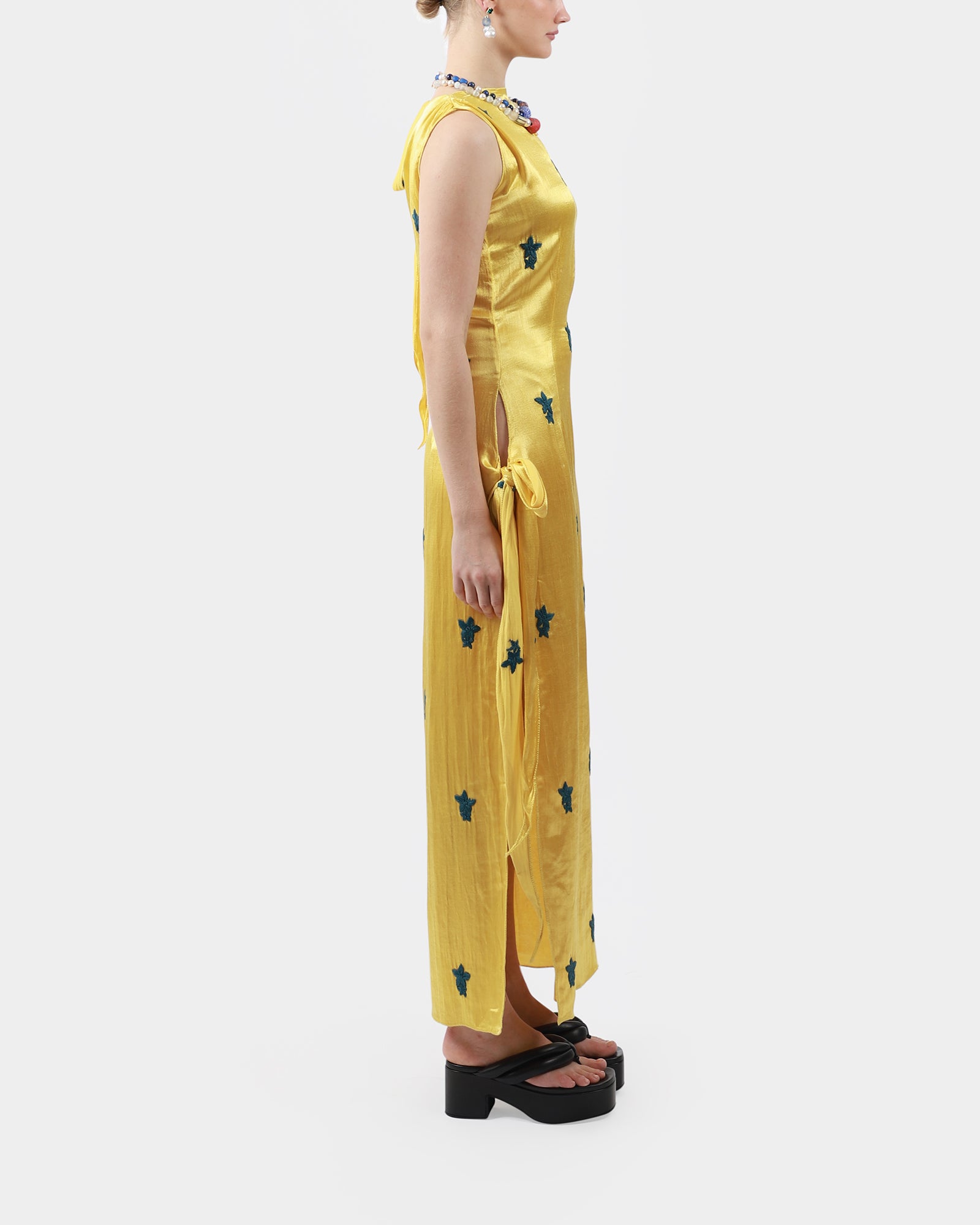 This beautiful dress is made from handwoven silk mashroo, embellished with hand-embroidered blue flowers. High side slit and shoulder knot ties. Handmade in Ahmedabad, India.
