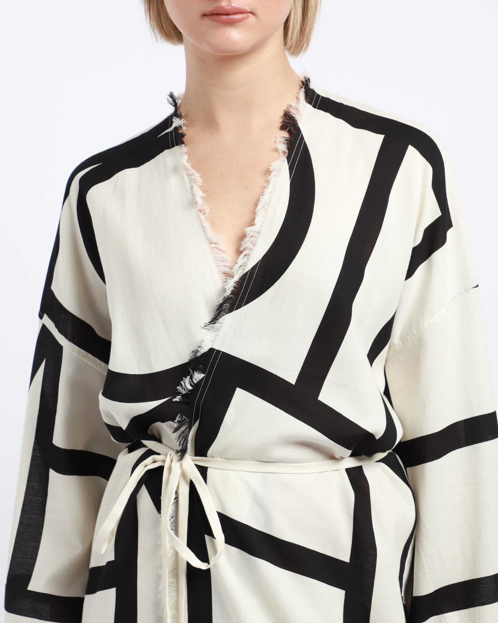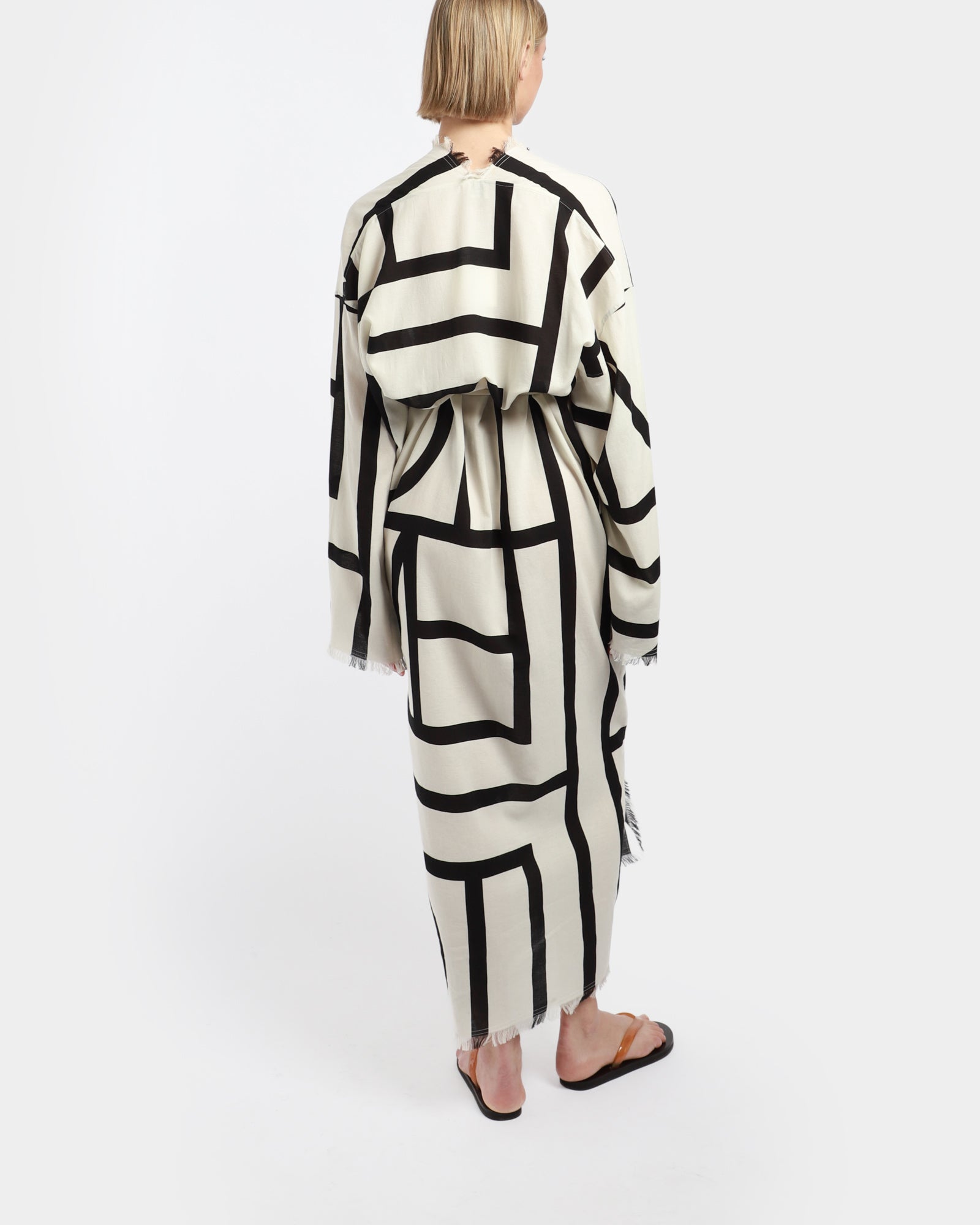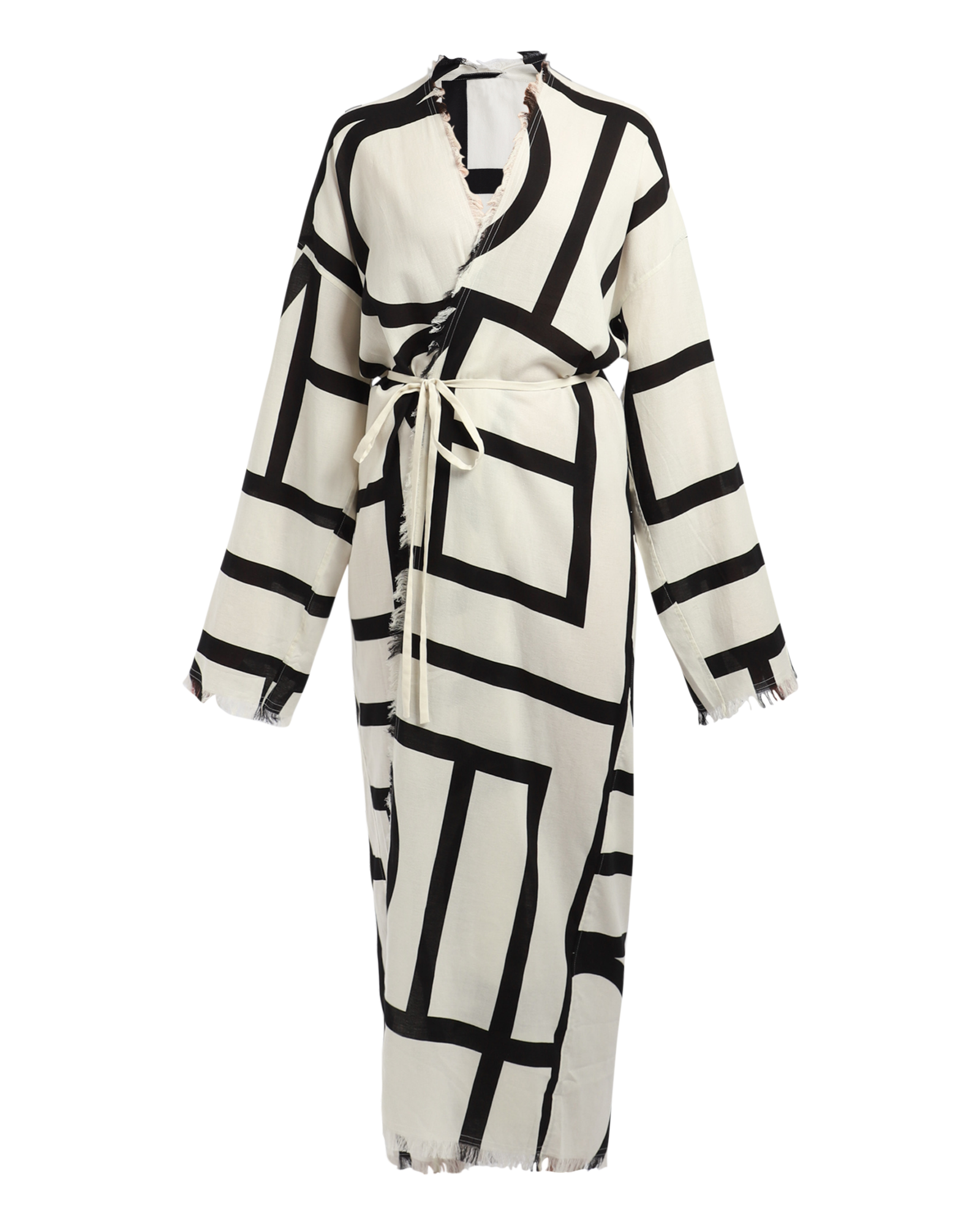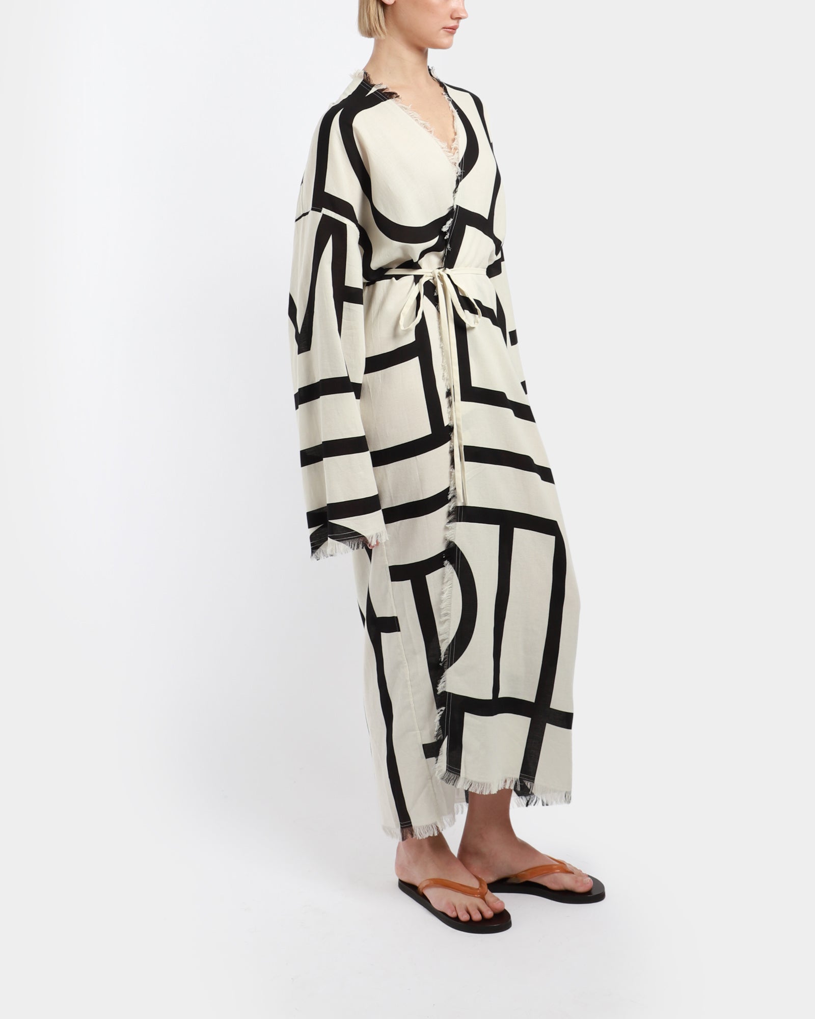 • The Monogram Wrap Dress is an oversized fit with a V-neckline and a distinctive monogram print. It features frayed hems, a back slit, and a wrap style with a detachable waist tie for versatile styling.