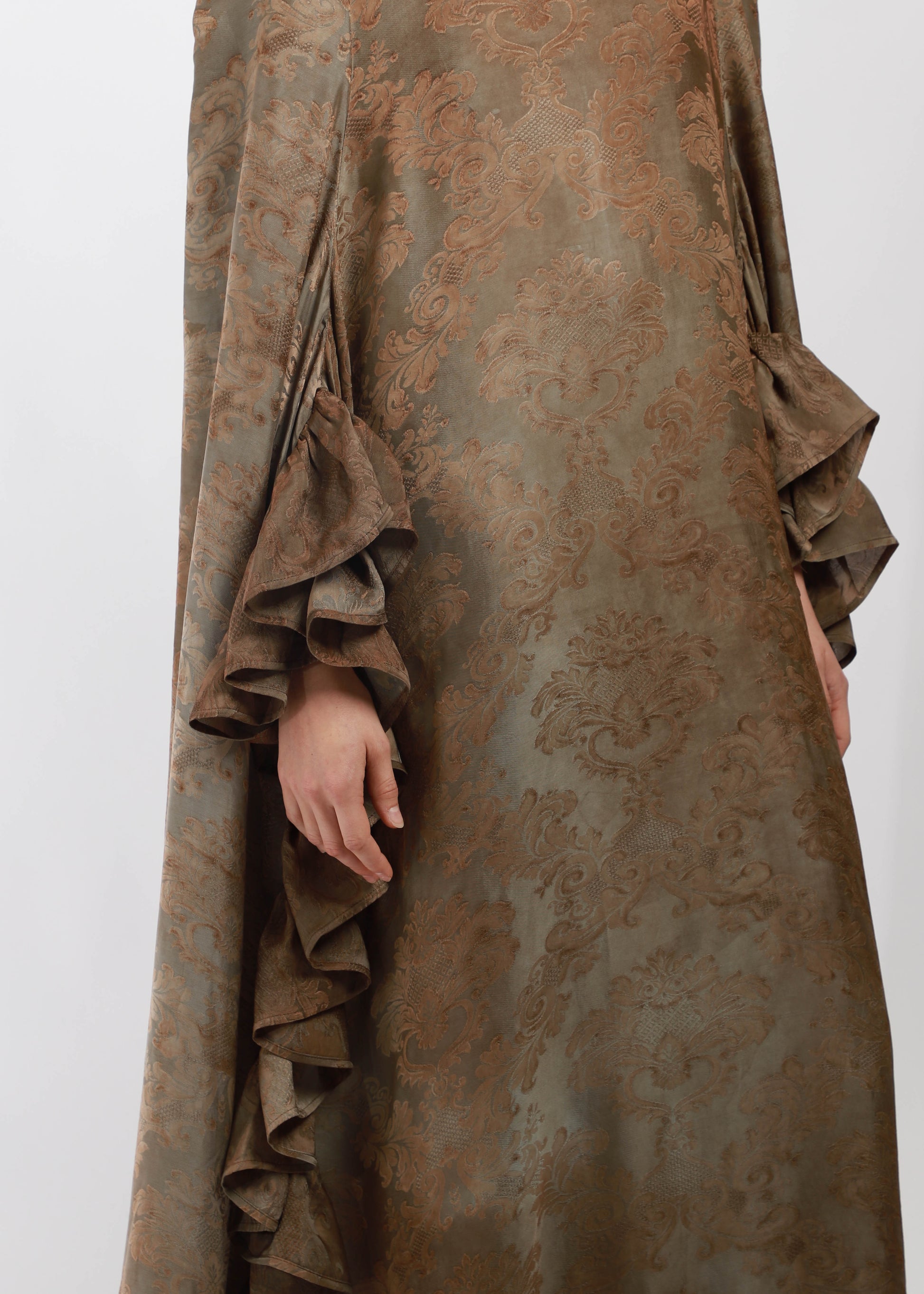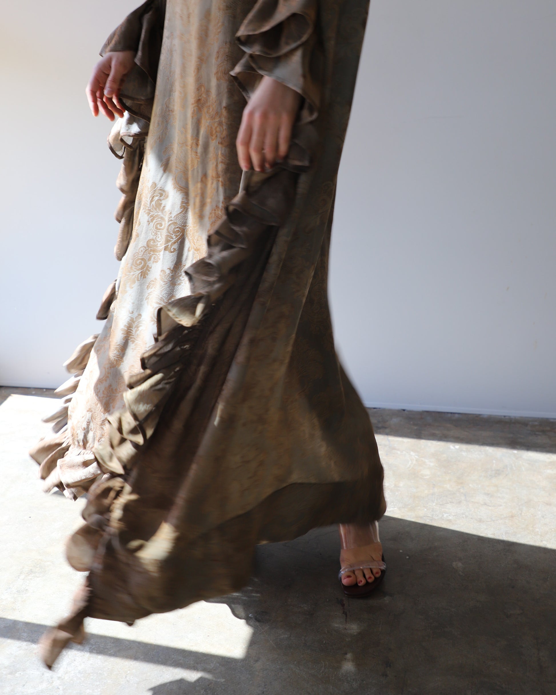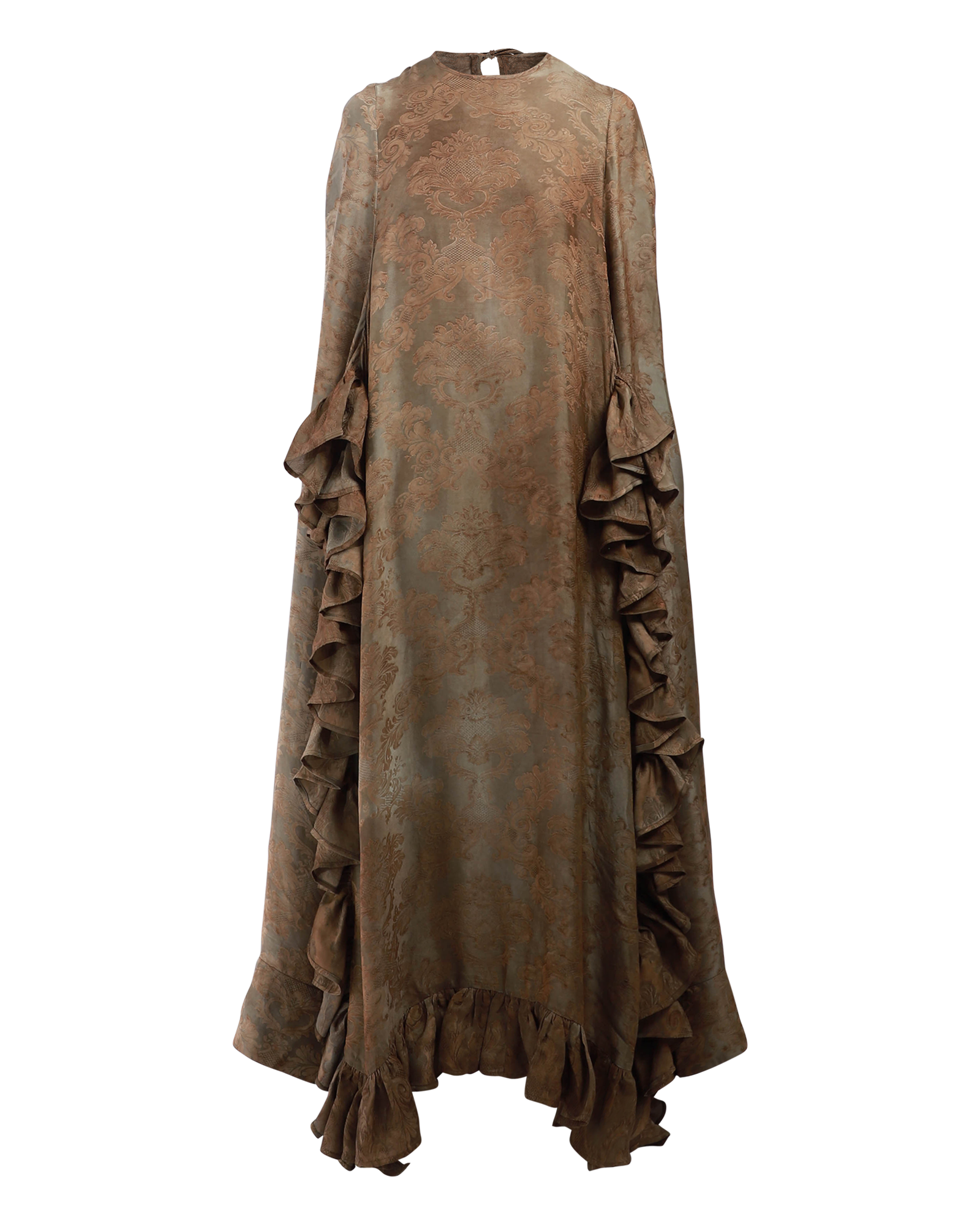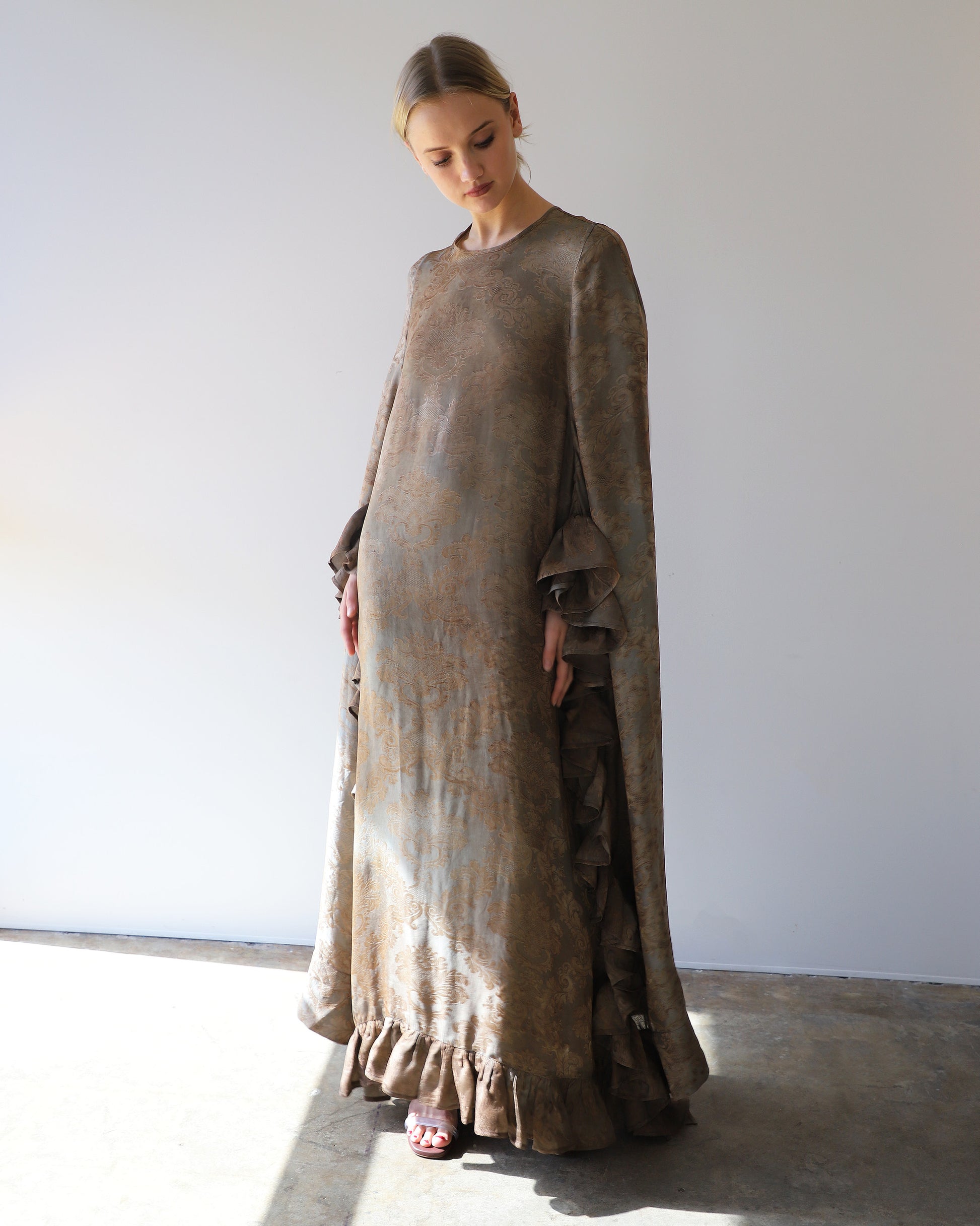 The Auby dress feature a round neckline with tie to secure at back, long sleeves with frills on each side panel offering volume and dimension to the garment, frills at bottom hem. Made in Italy.