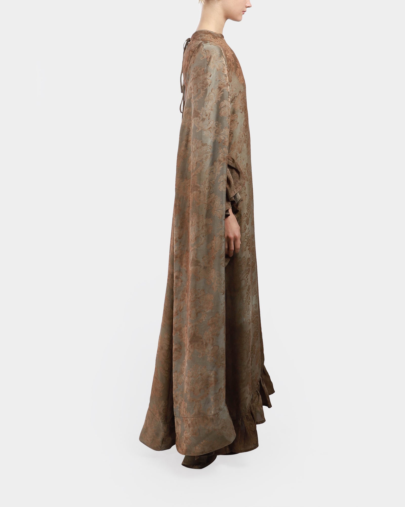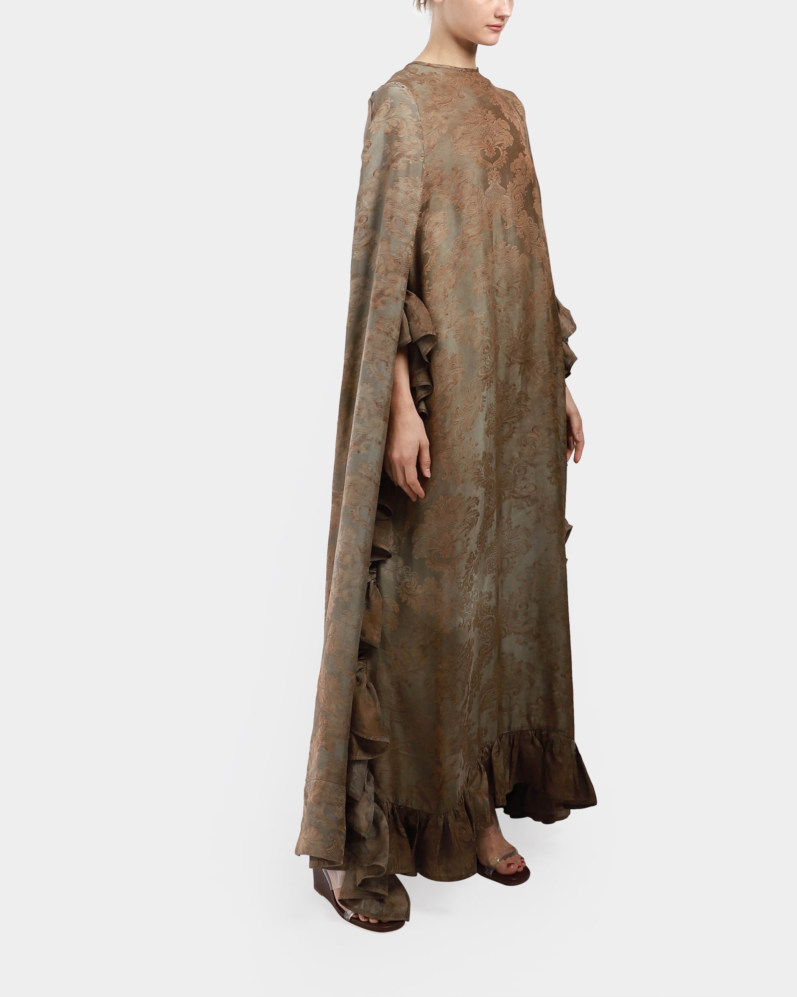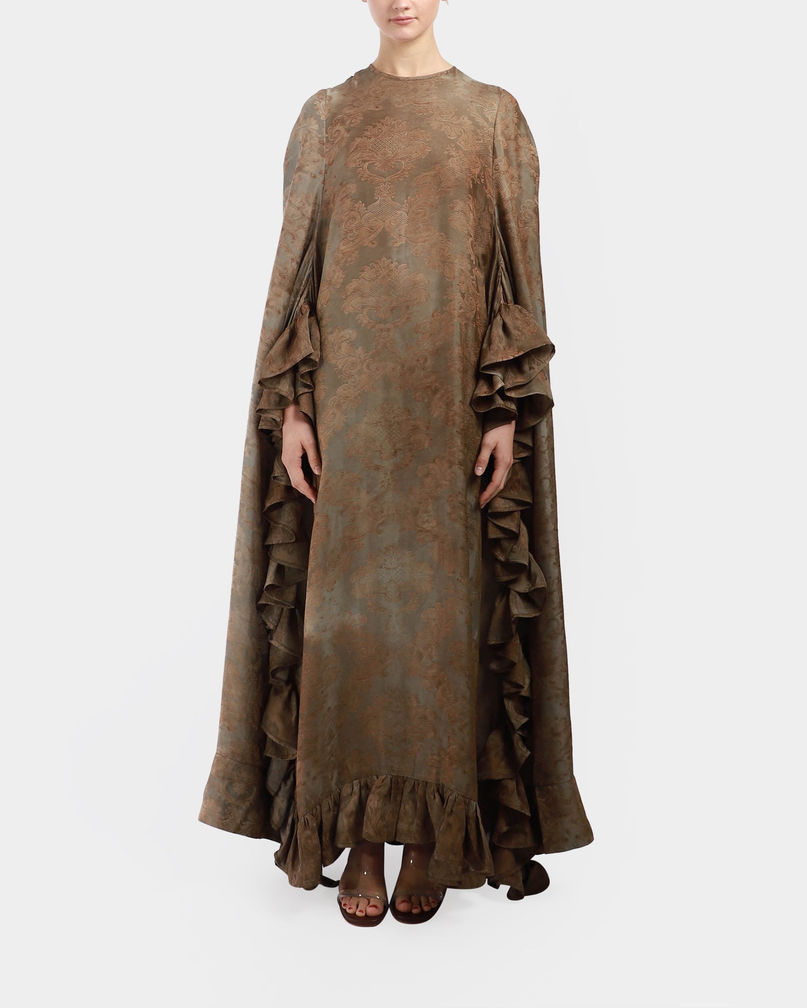 The Auby dress feature a round neckline with tie to secure at back, long sleeves with frills on each side panel offering volume and dimension to the garment, frills at bottom hem. Made in Italy.