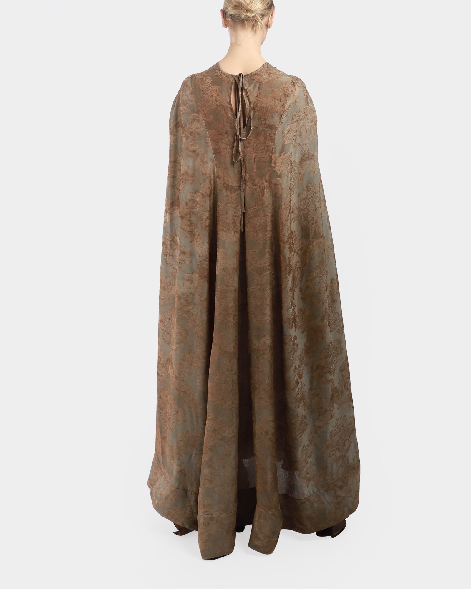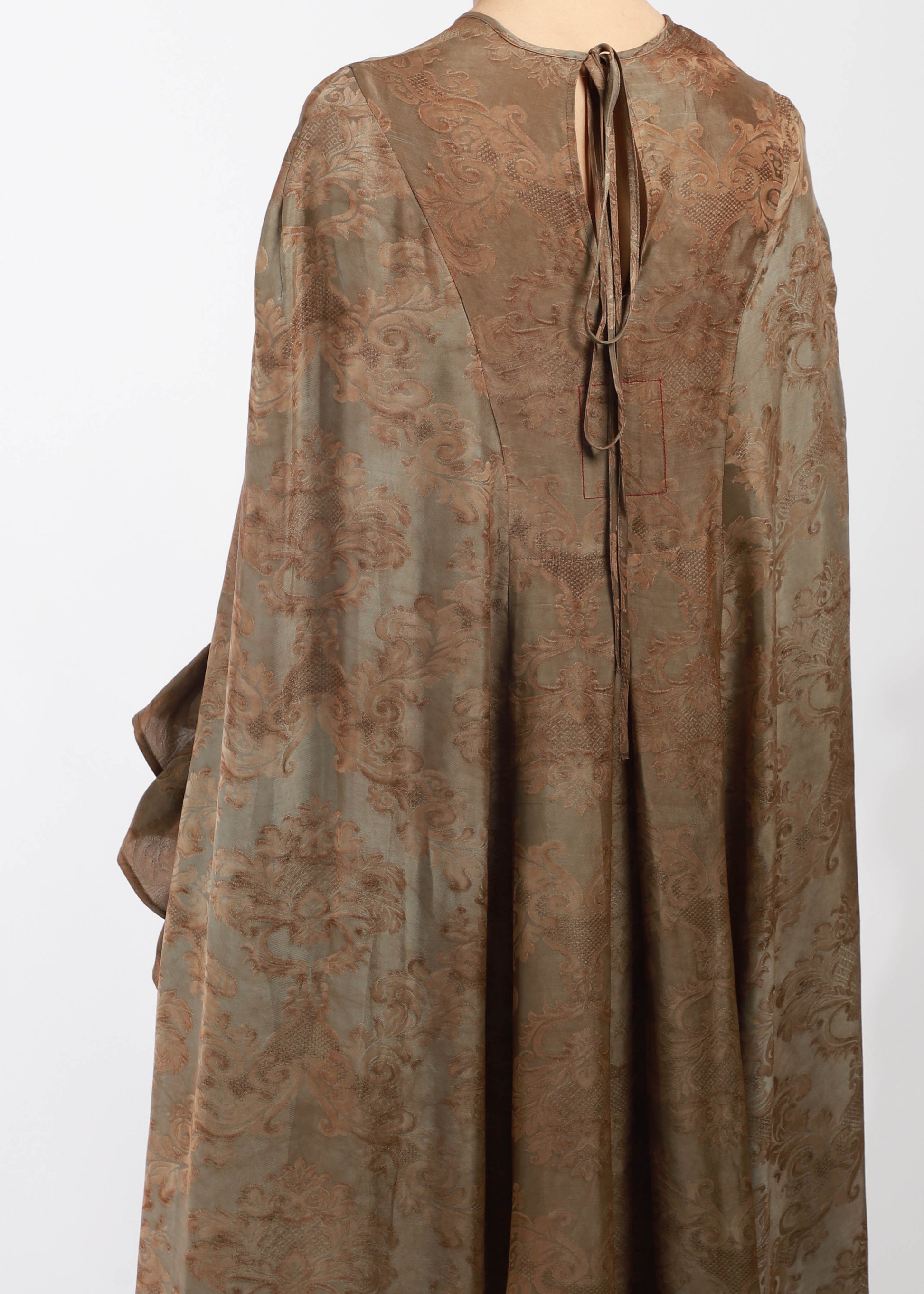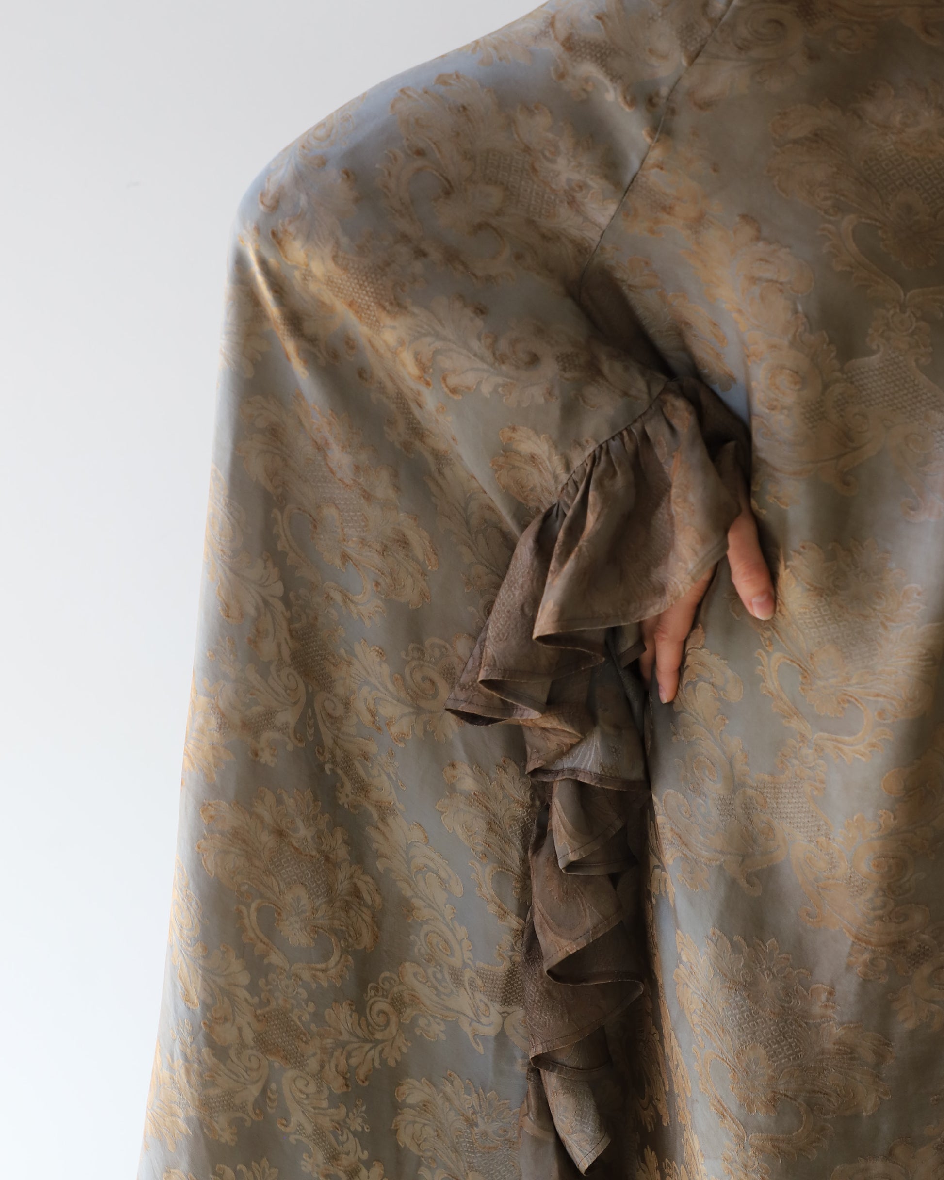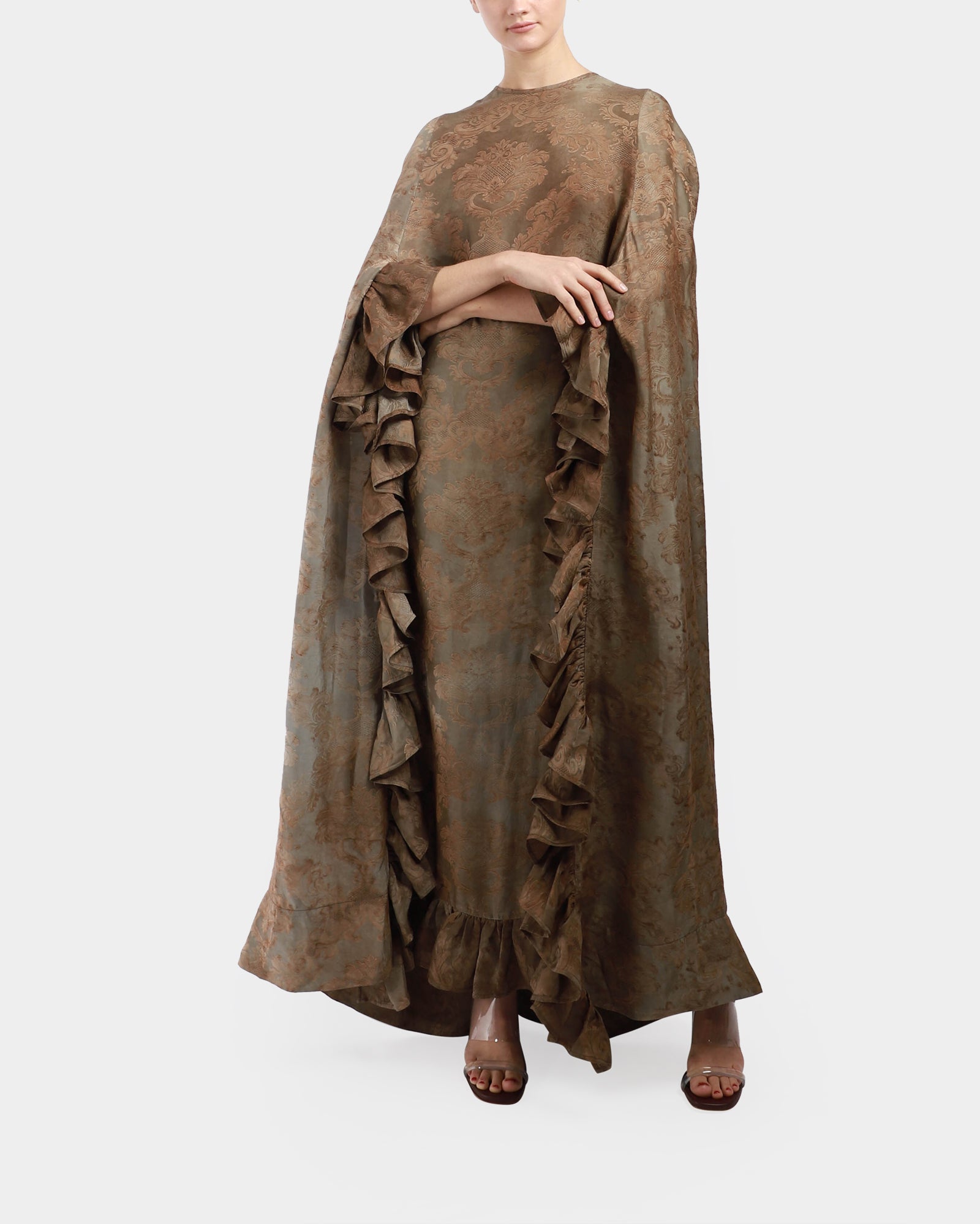 The Auby dress feature a round neckline with tie to secure at back, long sleeves with frills on each side panel offering volume and dimension to the garment, frills at bottom hem. Made in Italy.