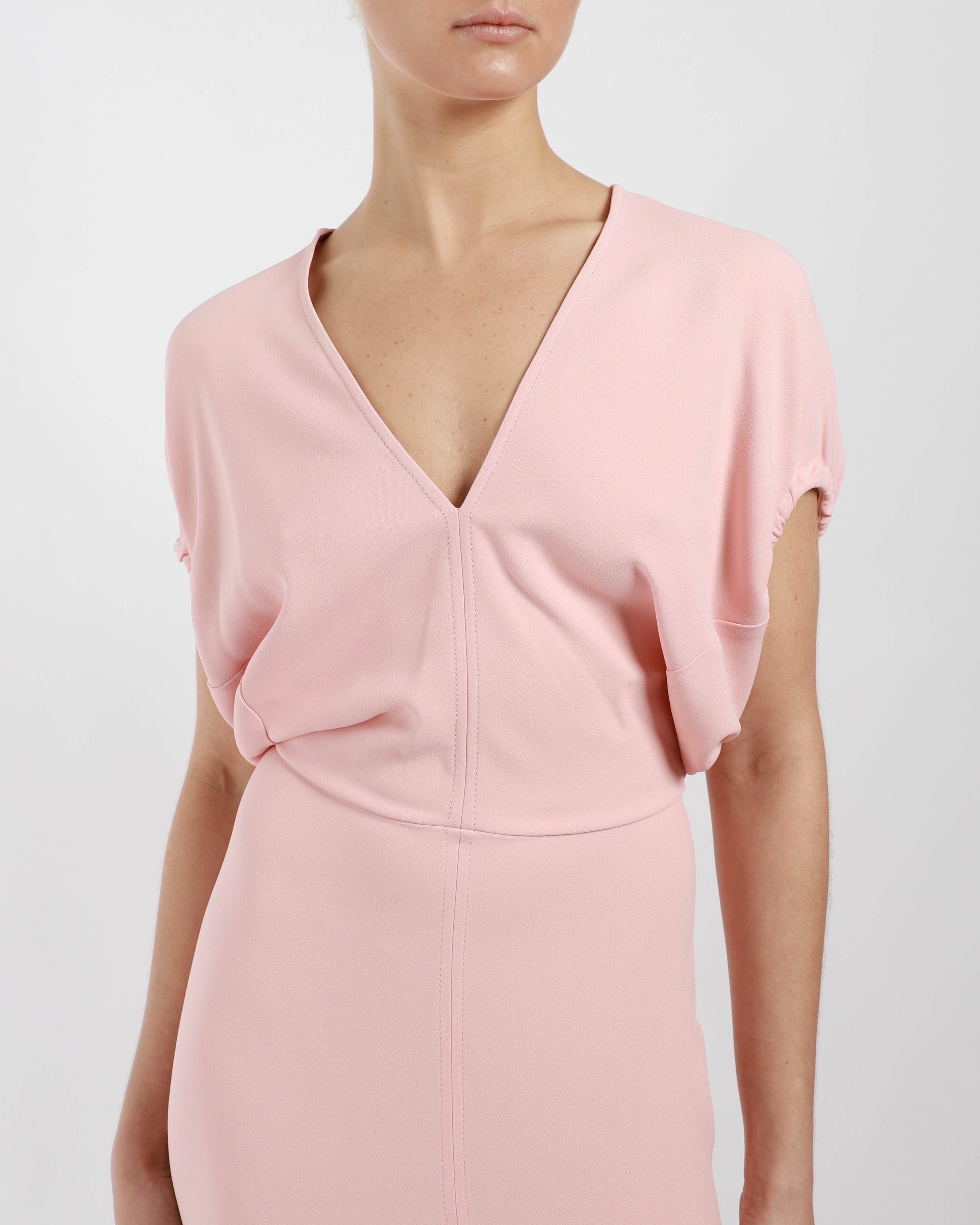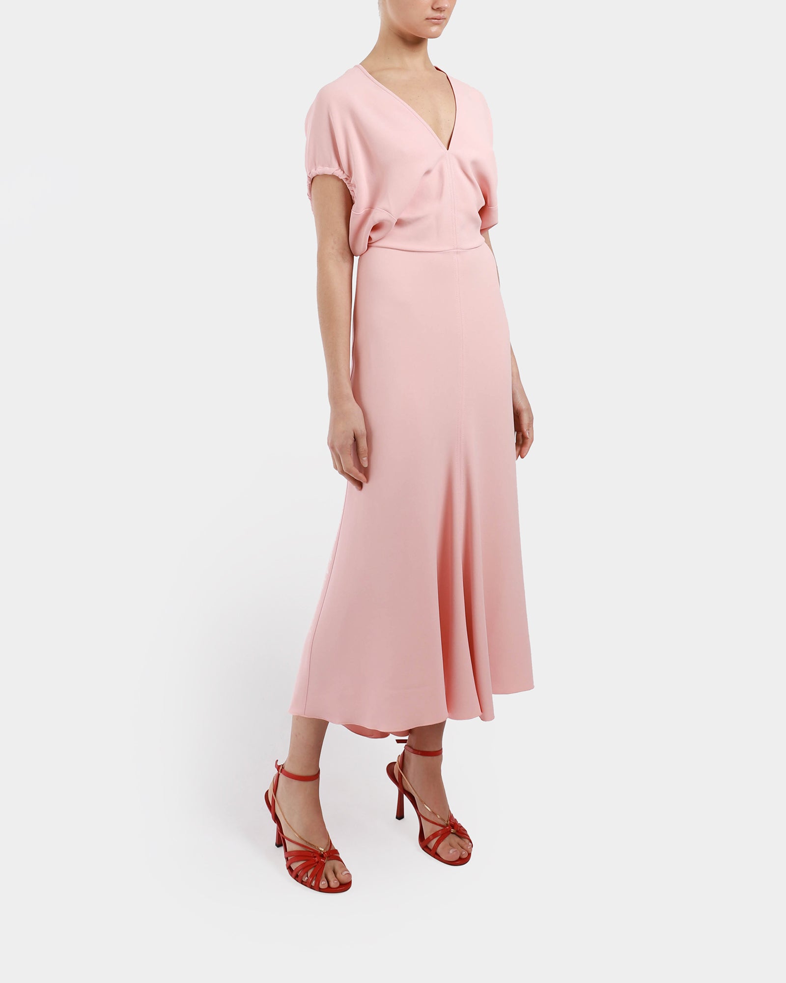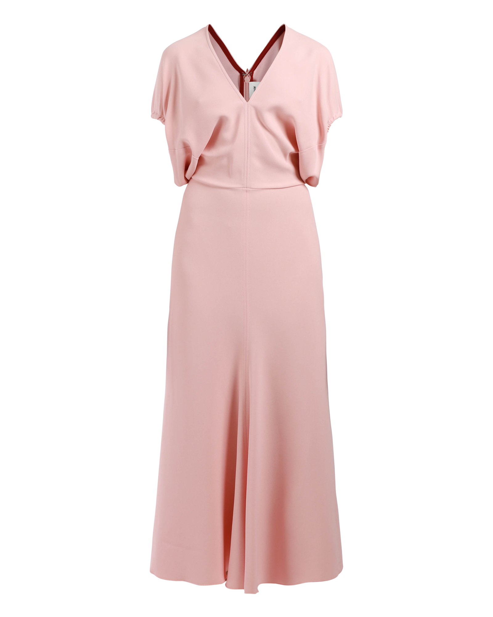 The Antique Pink Midi Dress features full short sleeves with rope edging, a V-neckline, a longer back hem, and a fitted waist for a flattering silhouette. Made in Portugal.