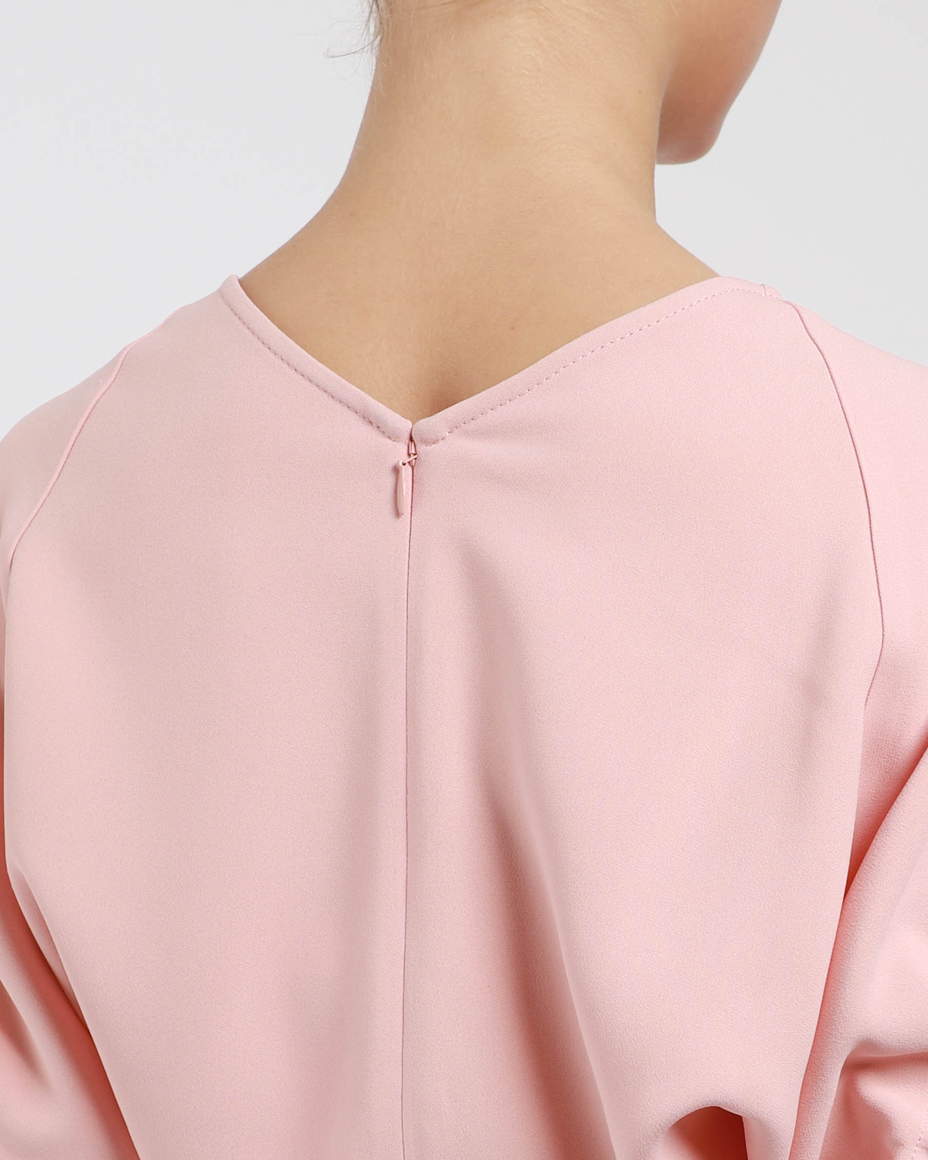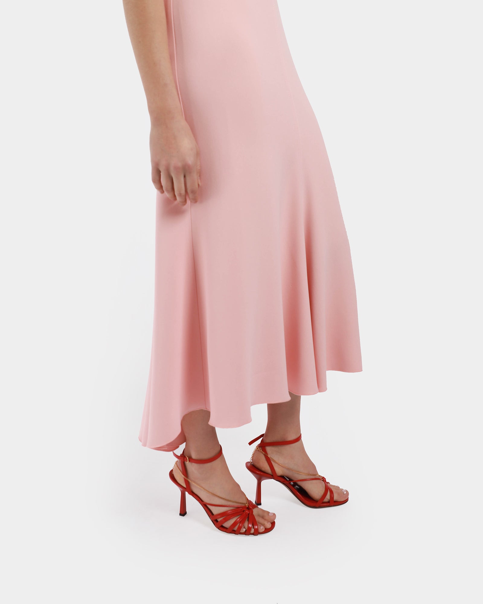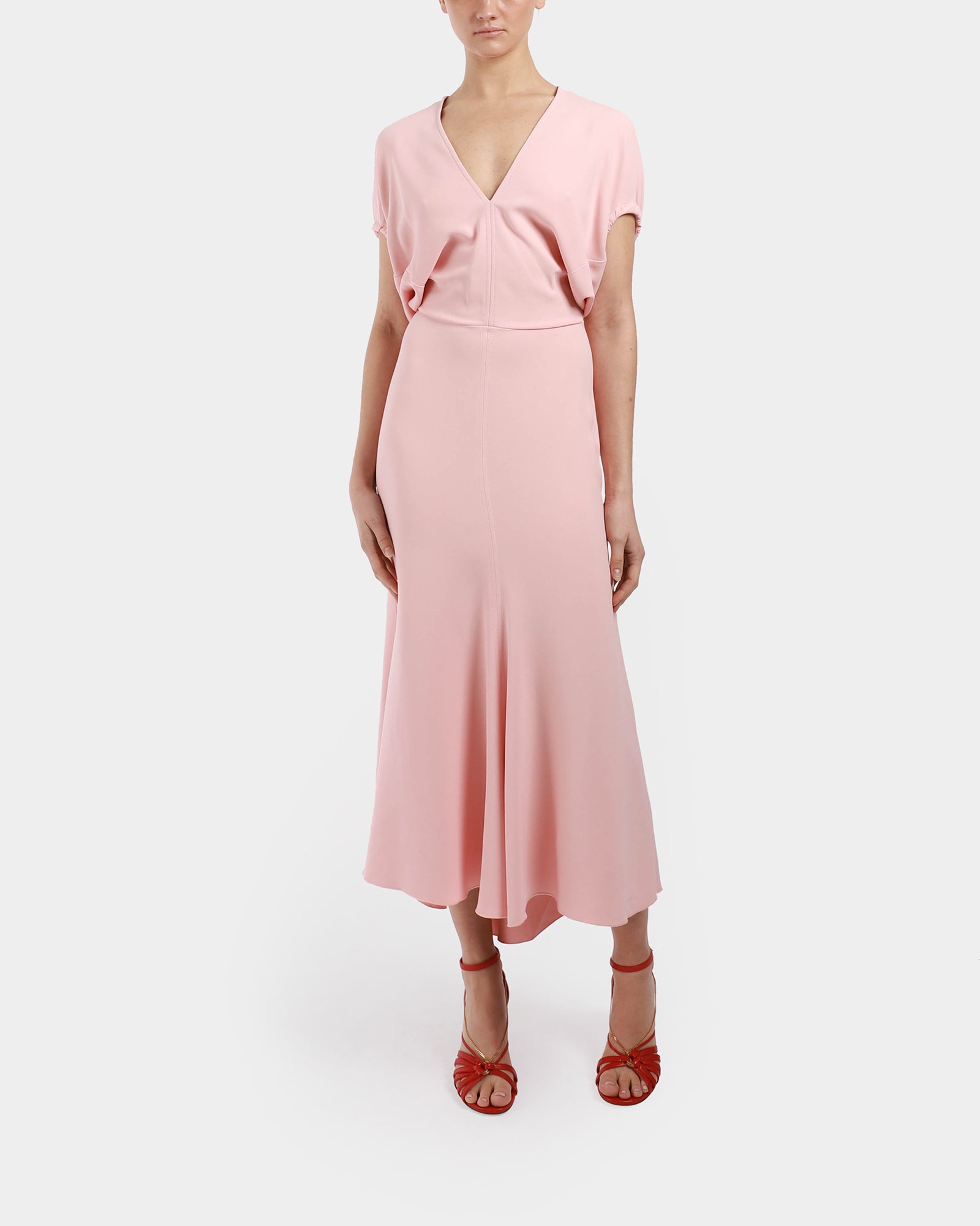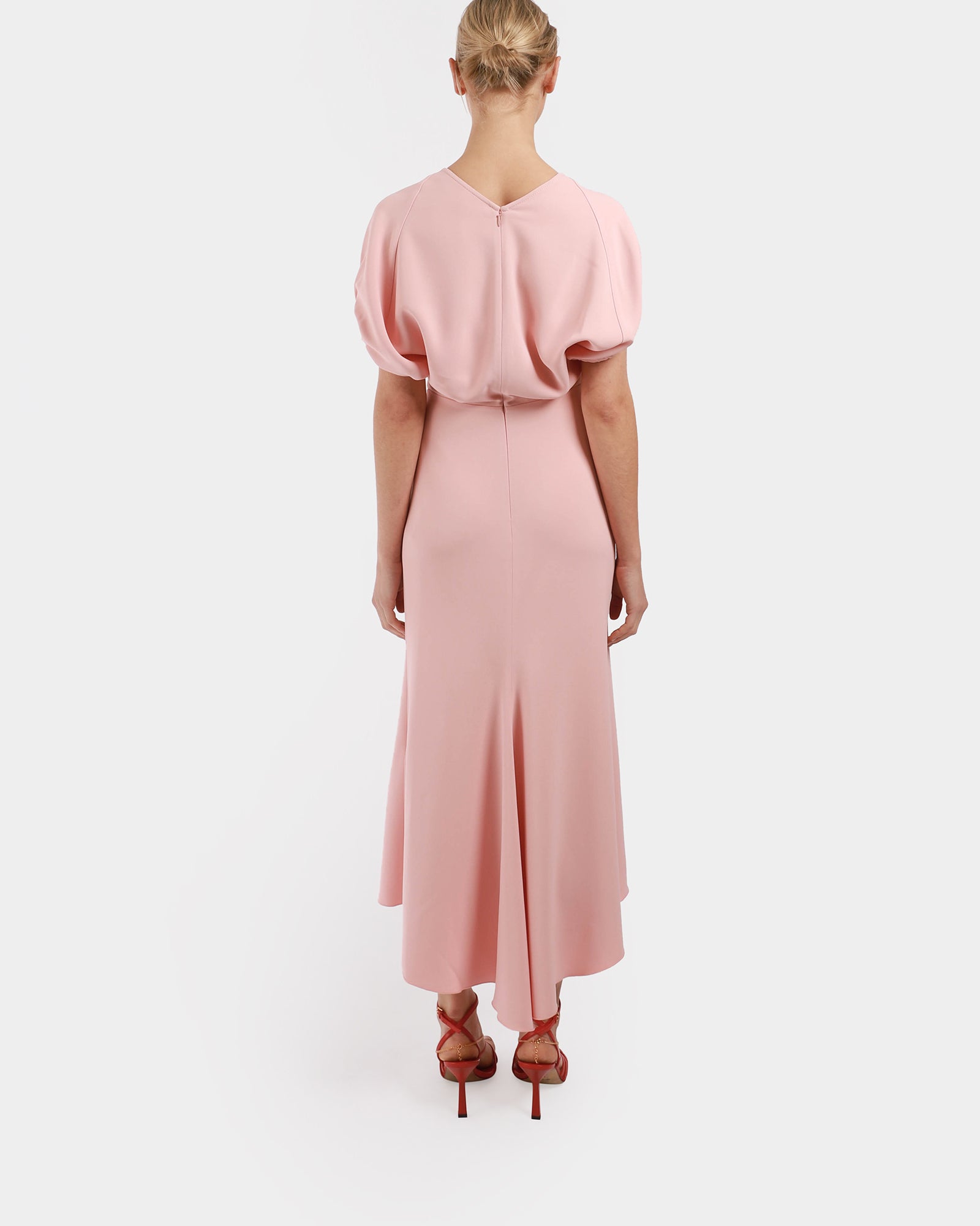 The Antique Pink Midi Dress features full short sleeves with rope edging, a V-neckline, a longer back hem, and a fitted waist for a flattering silhouette. Made in Portugal.