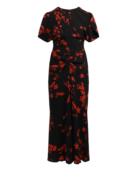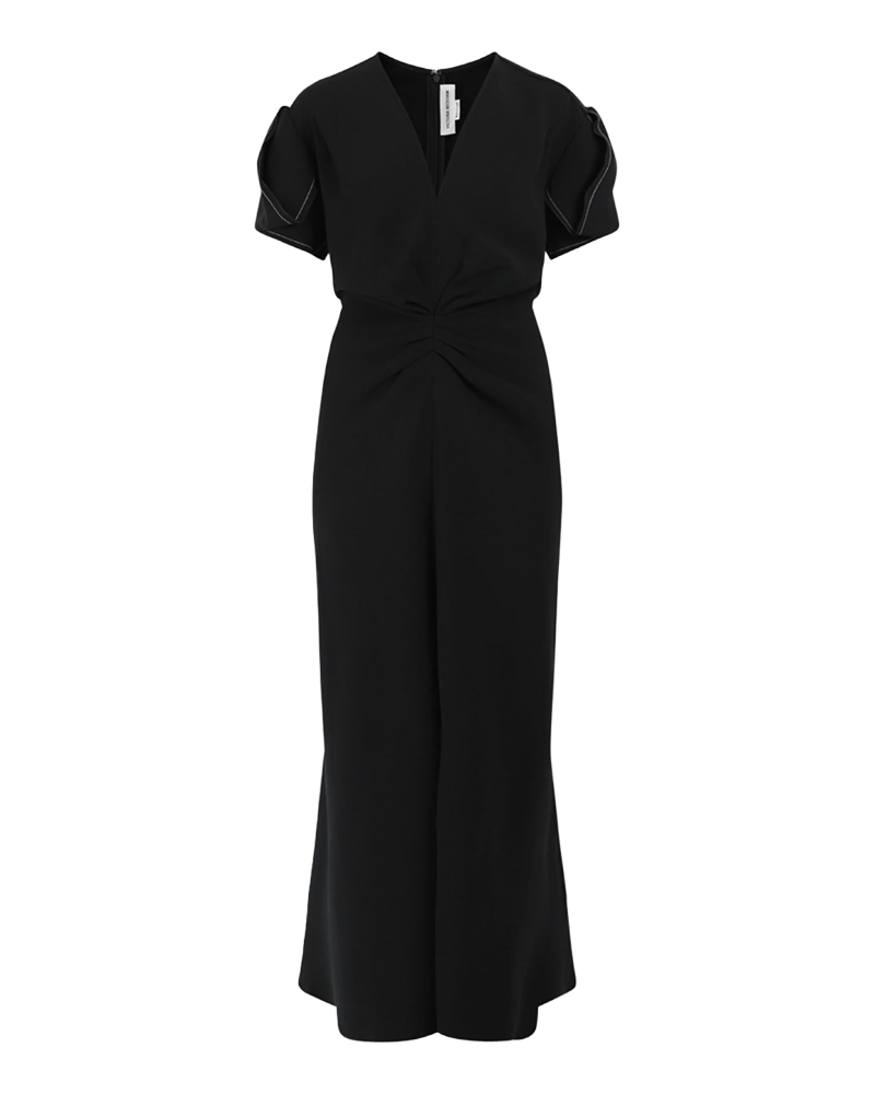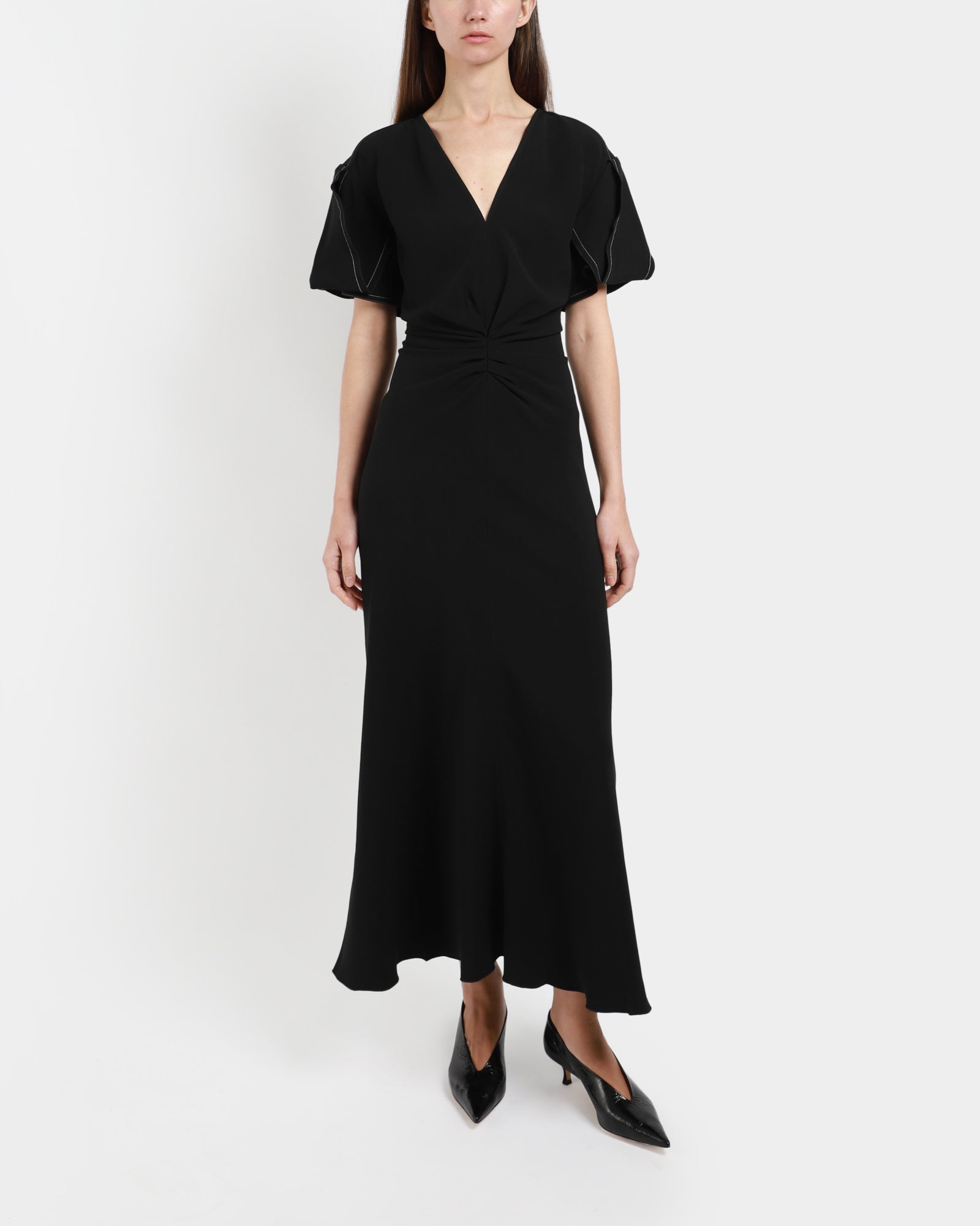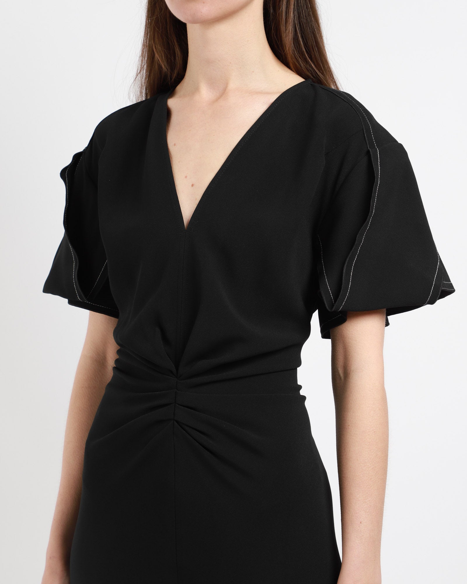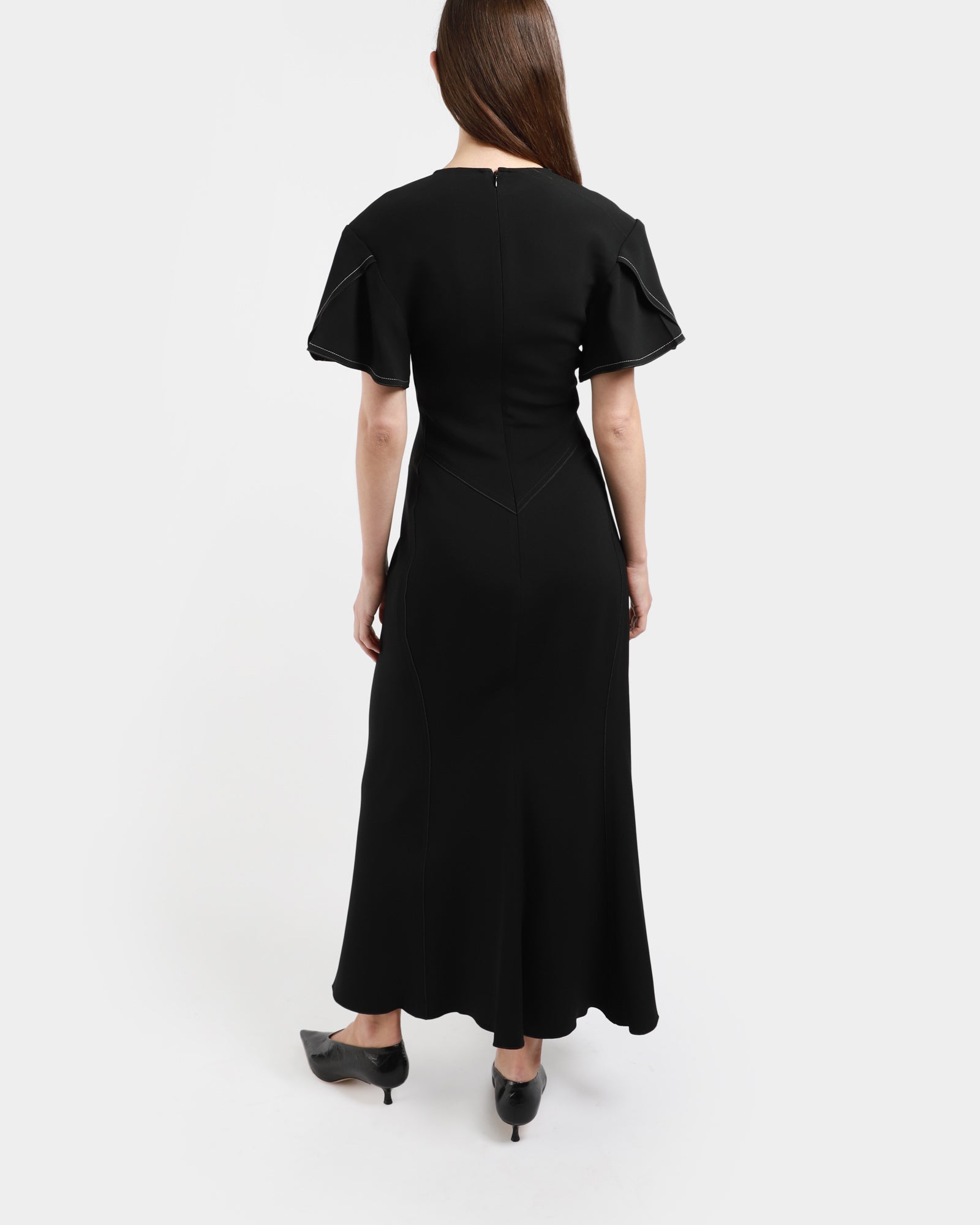 Crafted from a figure-flattering stretch fabric, this dress features a soft curved V-neckline, a waist-defining pleat detail, and a longer-length hem at the back. It is finished with exposed seams and contrasting topstitching.