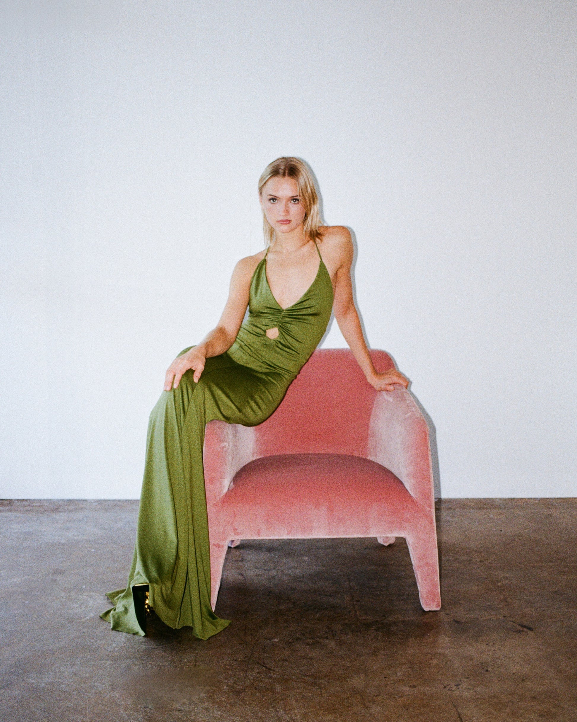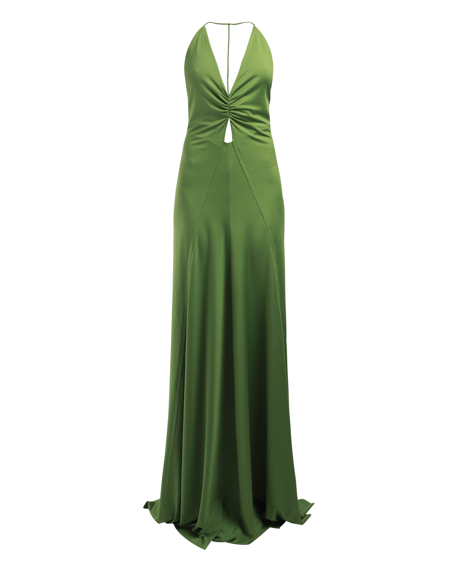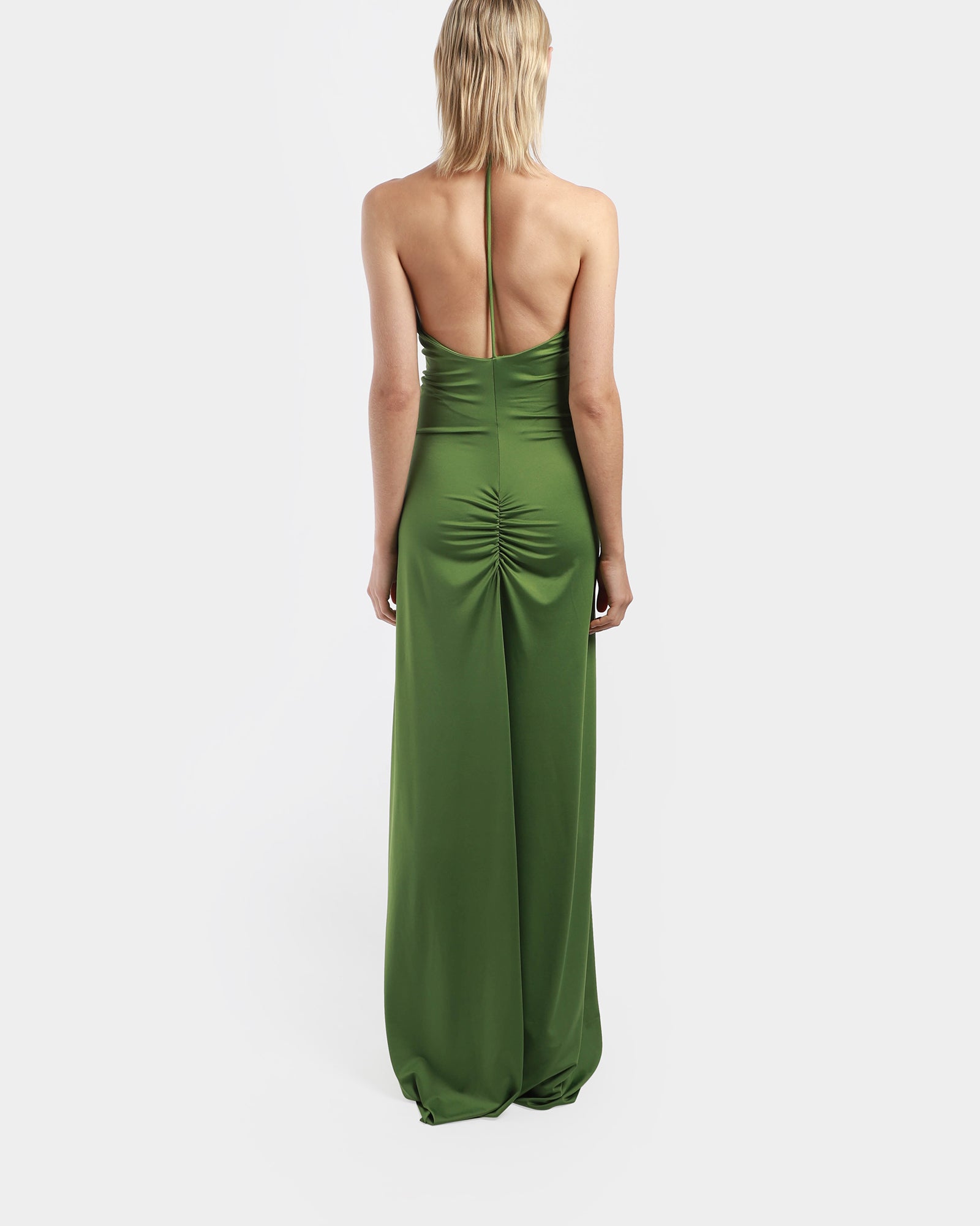 Inspired from the nineties camisole dress, the cami gown is crafted from a fluid jersey and has a discrete cut-out at the waistline with a tactile gathering on the bodice. The garment has an exposed back highlighted by a single strap down the centre and a gathered detailing below the back waistline.